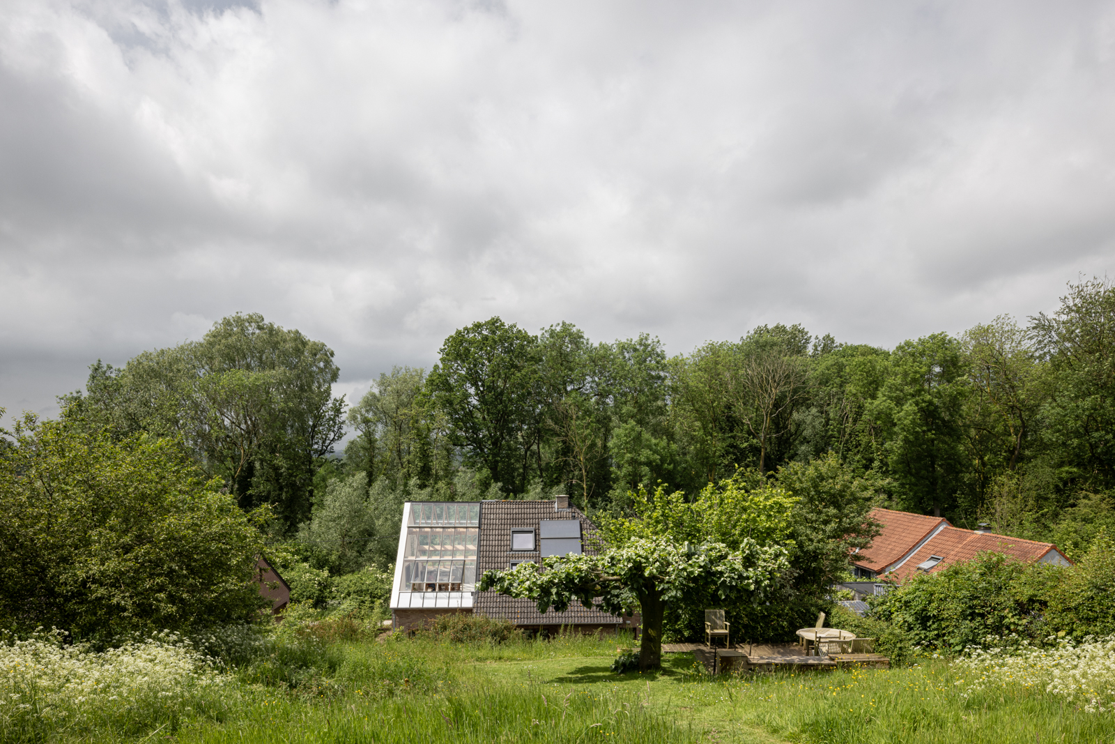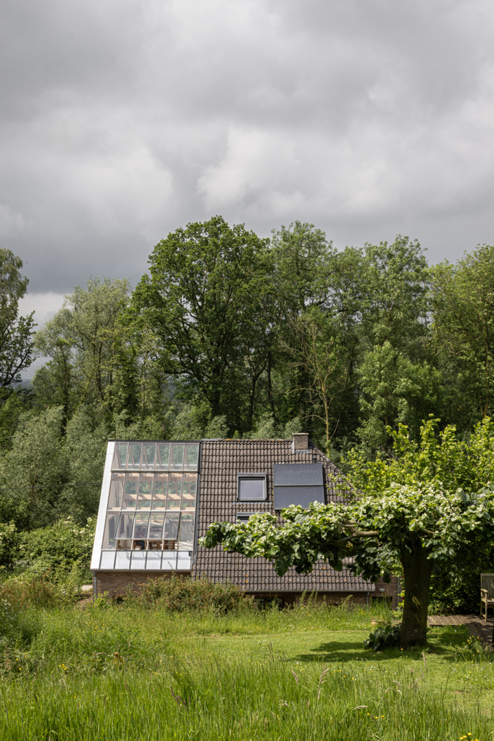 De grootste uitdaging was de typologie van de woning: een ‘sleutel-op-de-deur’ fermette. Het is een typologie die ons landschap overheerst, niet aan de huidige energienormen voldoet en evenmin als waardevolle architectuur wordt beschouwd. De uitdaging lag erin hoe om te gaan met dit soort woning. Na een kritische analyse van de bestaande organisatie en de connectie met zijn omgeving wordt de fermette opengemaakt en de traditionele indeling doorbroken. De woning wordt compacter: voormalige slaapkamers van de dochters worden een wintertuin, de nachthal en bureau vormen een geborgen zithoek, de riante inkomhal wordt een zitruimte aan de leemkachel en de garage wordt nieuwe inkom. Op het gelijkvloers komt een ruime slaapkamer met kleine badkamer, geschikt voor levenslang wonen.