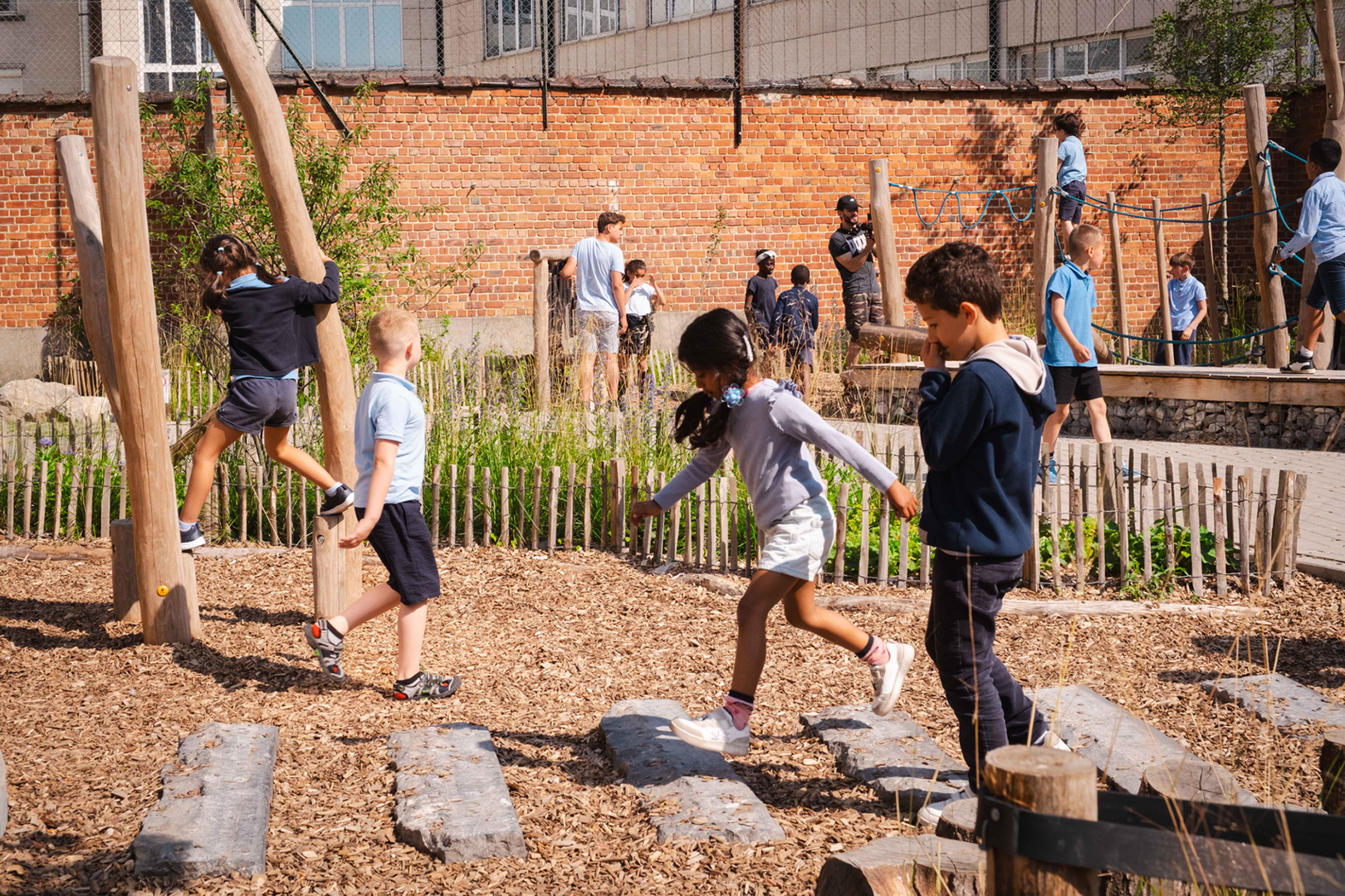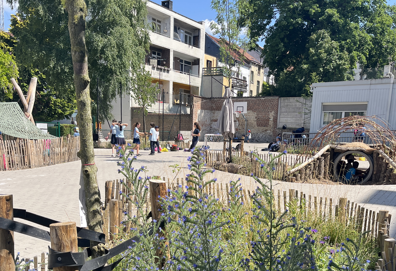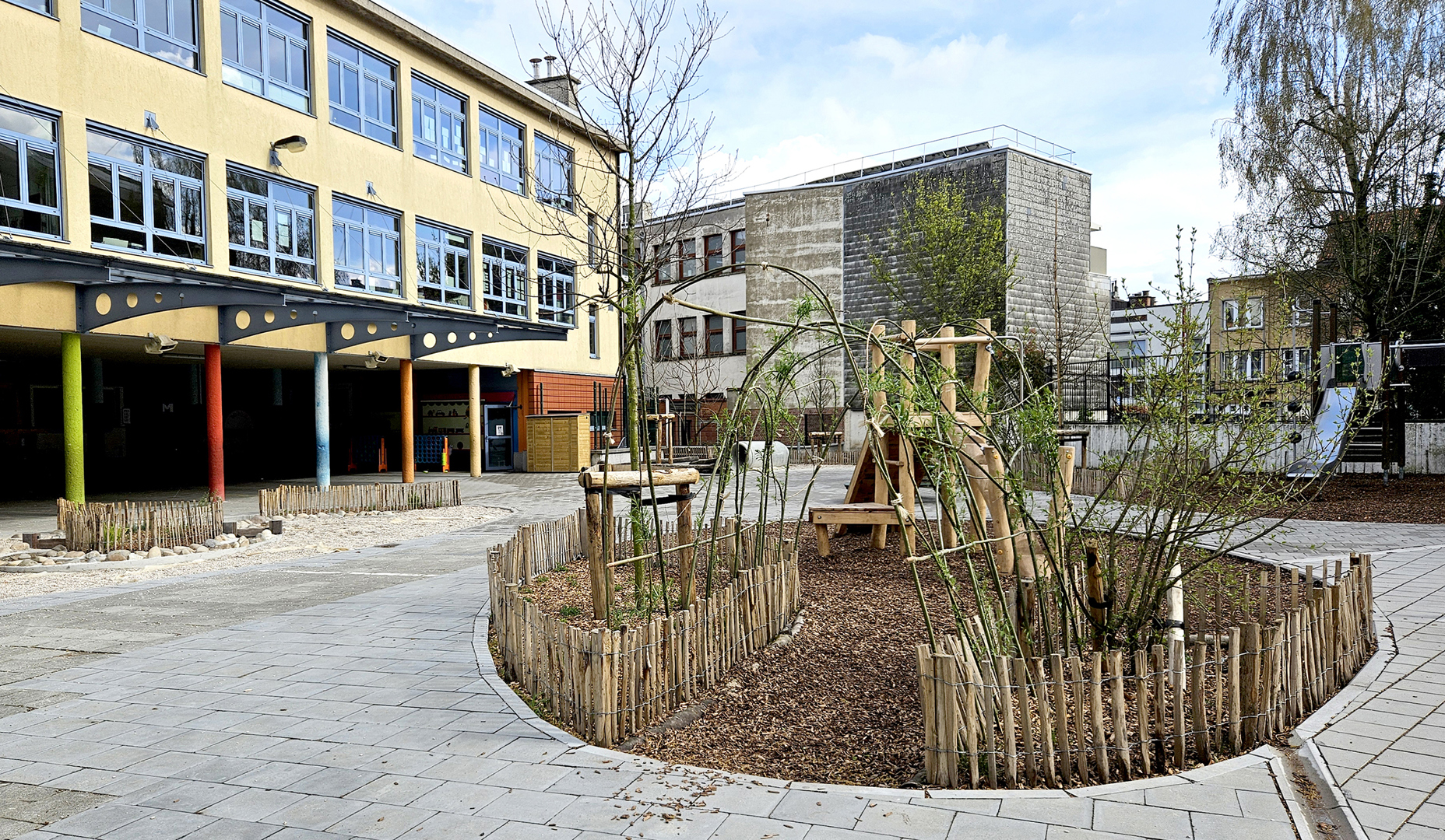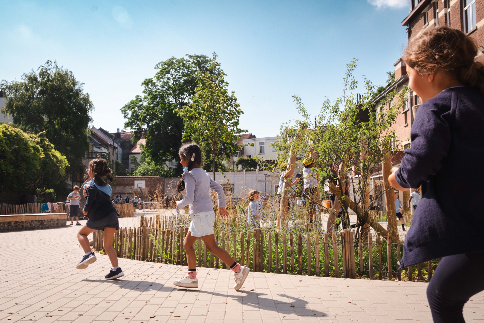 [Aangestuurd door Brussel-Leefmilieu, heeft de Operatie Ré-création als doel de ambitieuze transformatie van 19 Brusselse schoolpleinen door middel van hun beplanting en voorbeeldige ontharding, om zo nieuwe pedagogische praktijken in relatie met de natuur te laten ontstaan, bij te dragen aan de ontwikkeling van het kind en de klimaatweerbaarheid van de pleinen te versterken. Naar aanleiding van de projectoproep aan scholen in 2021 hebben de landschapsarchitecten van ÁRTER de helft van deze schoolpleinen ontworpen, van schets tot werfopvolging en opleveringen, door middel van talrijke participatieve co-ontwerpateliers en co-bouwplaatsen met de leerlingen, de pedagogische teams en het administratieve/technische personeel.]