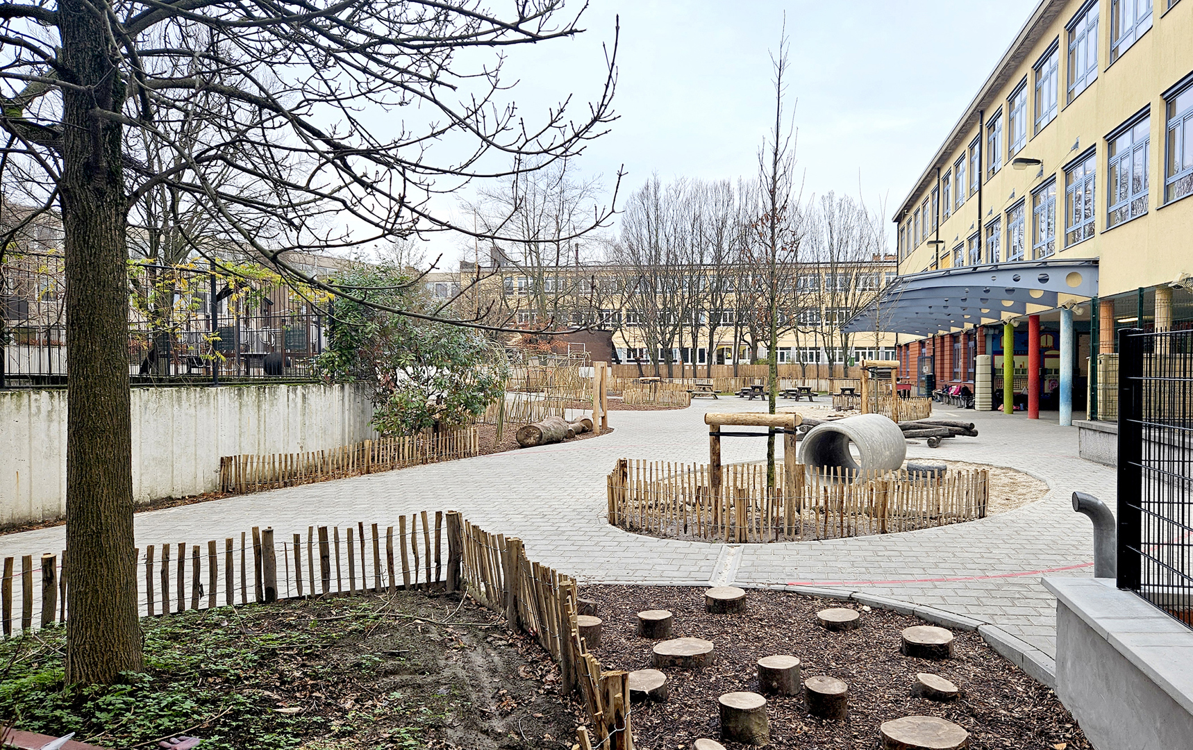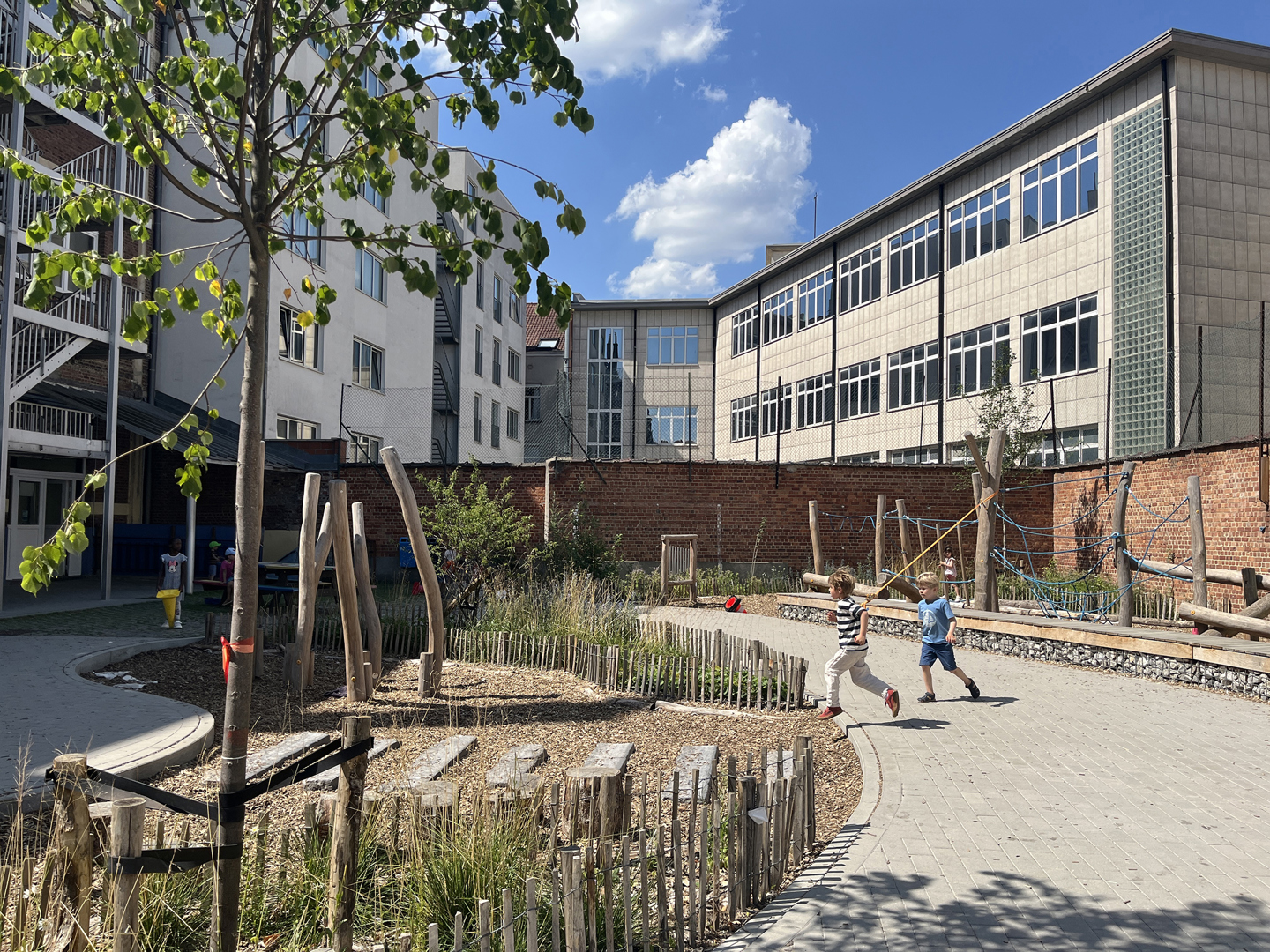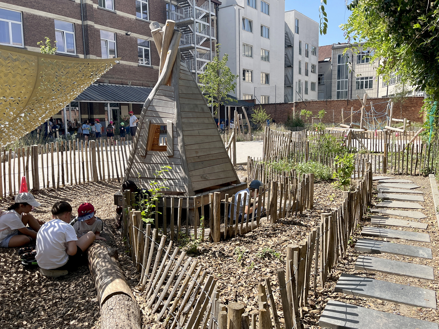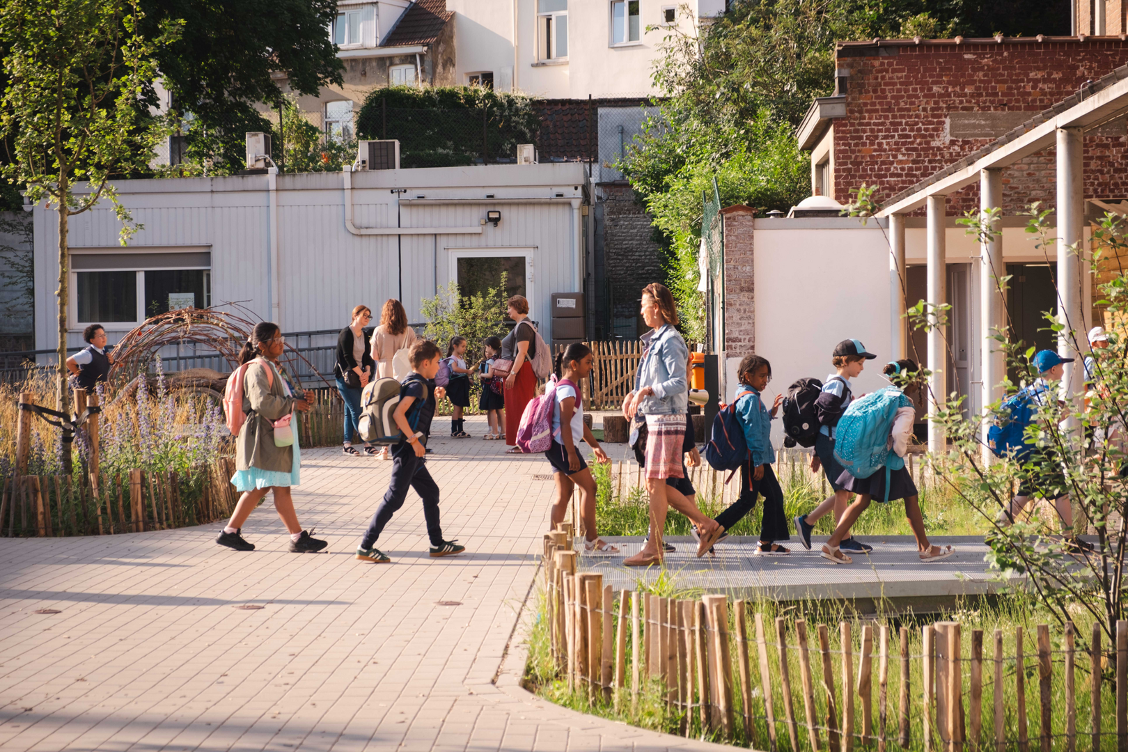 [Aangestuurd door Brussel-Leefmilieu, heeft de Operatie Ré-création als doel de ambitieuze transformatie van 19 Brusselse schoolpleinen door middel van hun beplanting en voorbeeldige ontharding, om zo nieuwe pedagogische praktijken in relatie met de natuur te laten ontstaan, bij te dragen aan de ontwikkeling van het kind en de klimaatweerbaarheid van de pleinen te versterken. Naar aanleiding van de projectoproep aan scholen in 2021 hebben de landschapsarchitecten van ÁRTER de helft van deze schoolpleinen ontworpen, van schets tot werfopvolging en opleveringen, door middel van talrijke participatieve co-ontwerpateliers en co-bouwplaatsen met de leerlingen, de pedagogische teams en het administratieve/technische personeel.]
