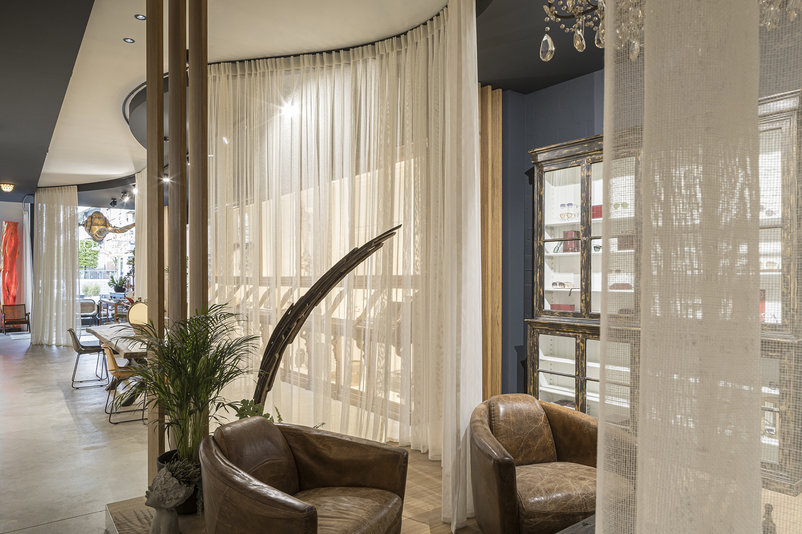 Het interieur werd als een verzameling materialen en verhalen benaderd: bestaand meubilair hergebruikt, aangepast waar nodig en opnieuw geïntegreerd. De bestaande vloer behouden, de muren werden bewust niet gepleisterd,Elk detail, van houtfineer tot stoffering, werd circulair verkregen of herwerkt via innovatieve methoden, waarmee duurzaamheid en esthetiek één geheel vormen. Ipv het interieur volledig voor te schrijven, creëerden we een canvas voor de ruimte zodat de opdrachtgever zelf verder kon invullen met los meubilair,stuk voor stuk hergebruikte of gevonden stukken. Zelfs in de ruimtelijke organisatie werd circulariteit concreet: waar traditioneel scheidingswanden zouden komen, plaatsten we een flexibel, circulair gordijn. Het resultaat is een interieur daticht, tactiel en aanpasbaar