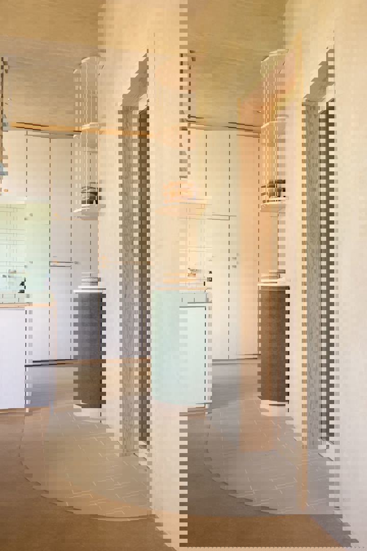 Door zijn doordachte omgang met materiaal en bestaande bouwfysica is de omkadering van dit gebouw bestand voor de toekomst. Er werd gekozen voor ecologische materialen die inspelen op de specifieke eigenschappen van het gebouw, ooit een dierenstal. Omwille van zouten in de muren en capillair vocht, versterkt door een vroegere betonnen vloerplaat, hebben we een saneerpleister geplaatst die zouten opvangt, gecombineerd met aangepaste verluchting. Binnenafwerking met leempleister zorgt voor een dampopen systeem, waardoor vocht kan reguleren en schade door de bestaande dampdichte buitenafwerking, die bij een eerdere renovatie werd aangebracht, wordt vermeden. Zo ontstaat een gezond, robuust en toekomstbestendig interieur.