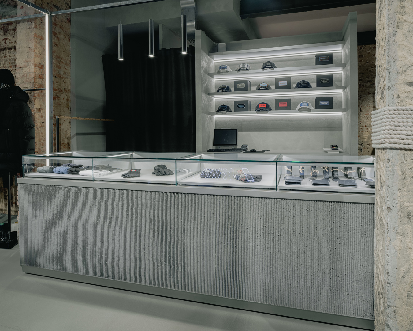 Een belangrijke uitdaging was de onzekerheid over de bestaande structuur: vooraf was niet duidelijk wat zich achter de bestaande gipswanden en plafonds bevond. In plaats van dit te controleren, werd deze onvoorspelbaarheid omarmd en als ontwerpinstrument ingezet. Daarnaast moest het interieur tegelijk flexibel en verfijnd zijn. Dit werd opgelost met een modulair, geprefabriceerd stalen frame dat fungeert als display, lichtdrager en ruimtelijk element. Door technische installaties zichtbaar te laten en de bestaande ‘gevonden’ ruimte te behouden, ontstond een coherent en eerlijk geheel dat inspeelt op verandering zonder bijkomende ingrepen.