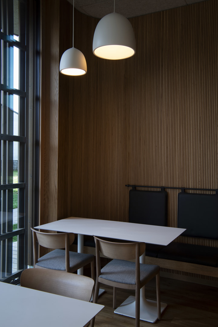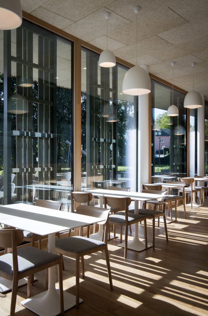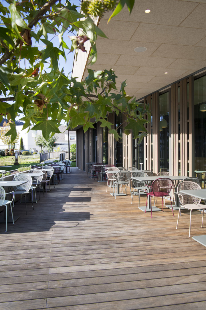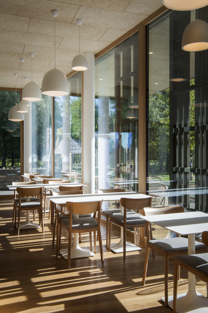 Een restauratiepaviljoen in een park moet harmonieus integreren zonder de natuur te verstoren. Het project biedt een alomvattende oplossing voor deze uitdaging met een gedetailleerde analyse van het terrein, de biotopen en de waterlopen voor een optimale positionering. Dit maakte het mogelijk om gerichte perspectieven te creëren, gevoelige gebieden te beschermen en onesthetische perifere gebieden te verbergen. De oriëntatie en de dakranden benutten het daglicht, voorkomen oververhitting en creëren een aangenaam klimaat. Door zijn vorm integreert het paviljoen zich op een zachte manier in het landschap. Het hout, het glas en de aardetinten versterken de verbinding met de natuur. Een eenzame boom op het terras en kruidentuinen vervagen de grens tussen het gebouw en de natuur.