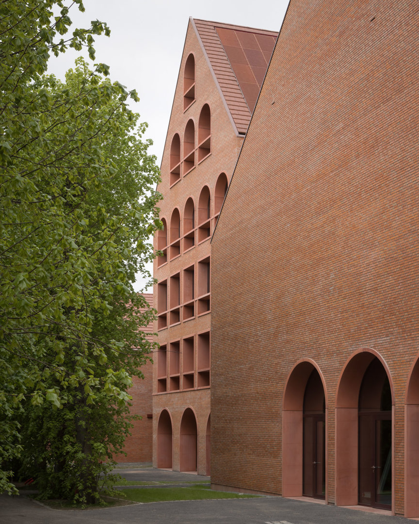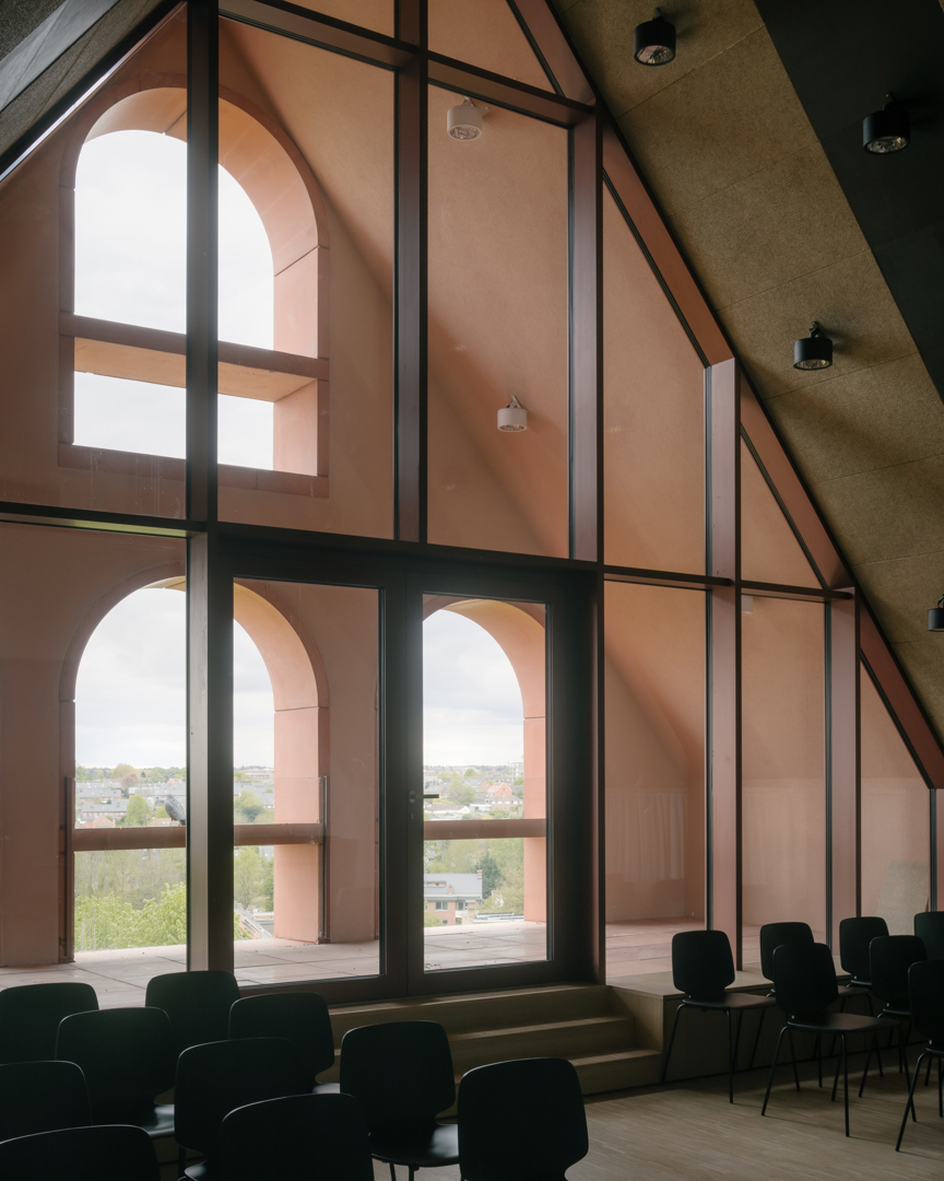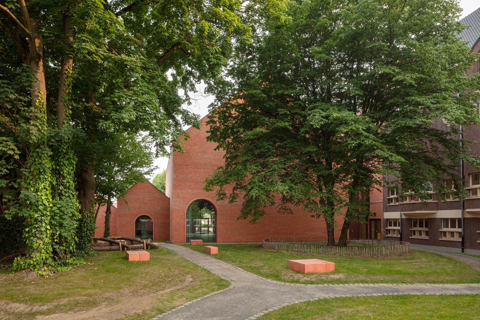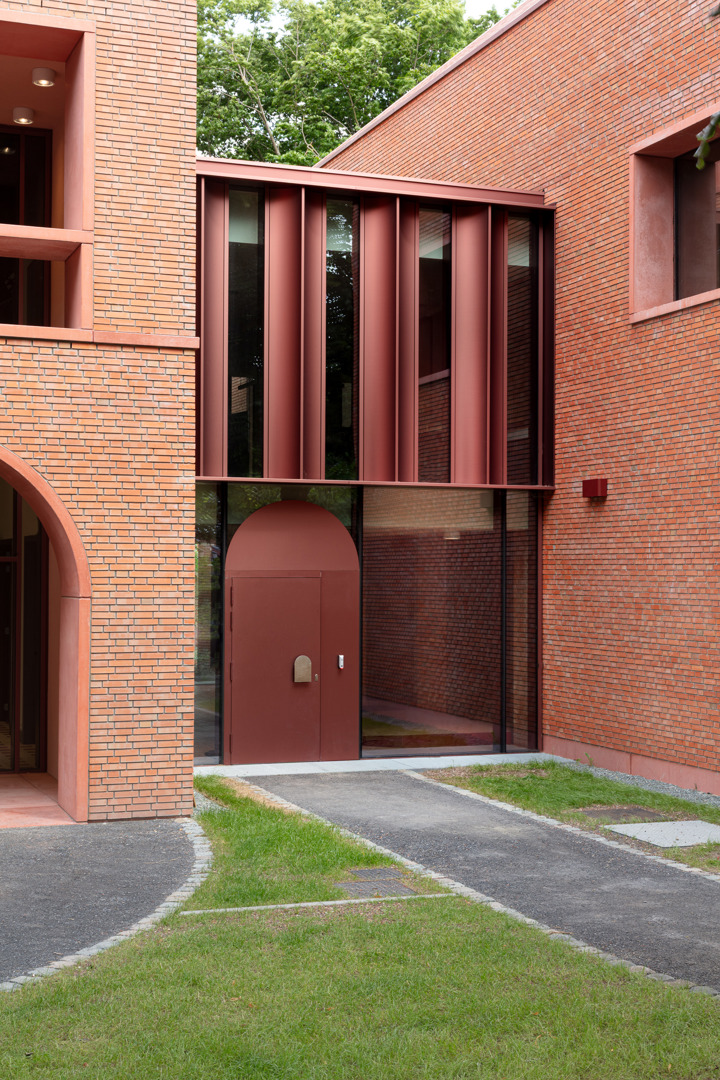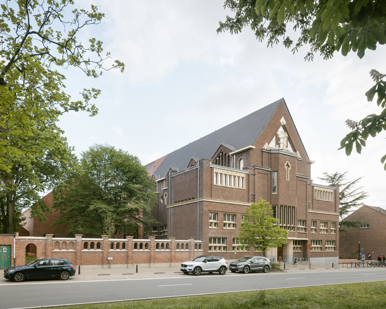 Het project combineert een compact ontwerp met gedeeld gebruik, flexibiliteit en kruisbestuiving voor sociale duurzaamheid. Als start van het ontwerp bracht een boomdeskundige de haarvaten van de bomen in kaart. Uit deze studie bleek hoe dicht de gebouwen op de bomen mochten komen. Om mobiele zonnewering te vermijden, bouwden we dikke kasteelmuren met dieperliggende ramen. Ook het gebouw uit de jaren ’30 werd mee fossielvrij gemaakt. Rode zonnepanelen in het dakvlak zorgen samen met het BEO-veld voor de CO2-neutrale technieken. Er werd ingezet op biodiversiteit en het project is waterneutraal. Circulariteit treffen we aan in verschillende vormen: raambeslag werd herbruikt, materialen van sloop werden vooraf getest in labo’s en terug in omloop gebracht via de lokale bouwhandel.