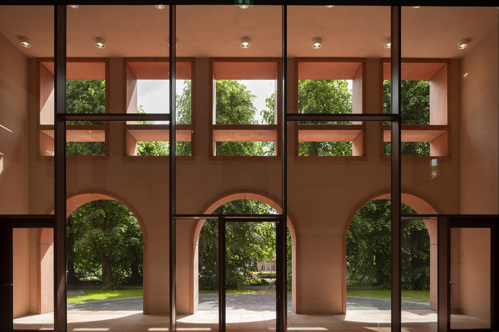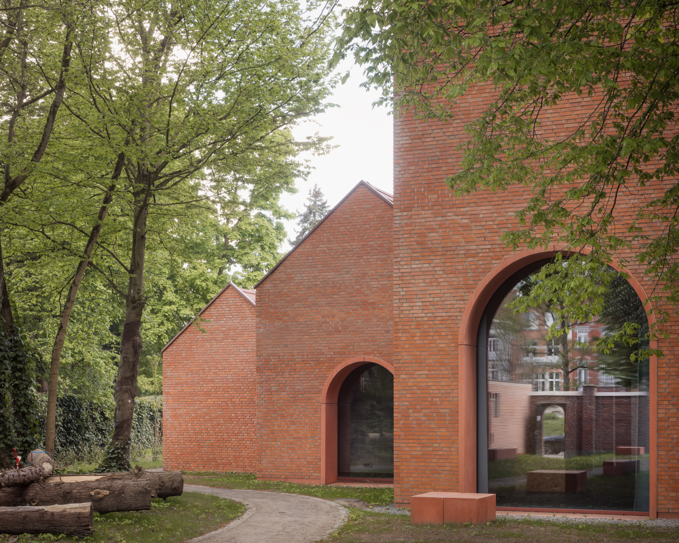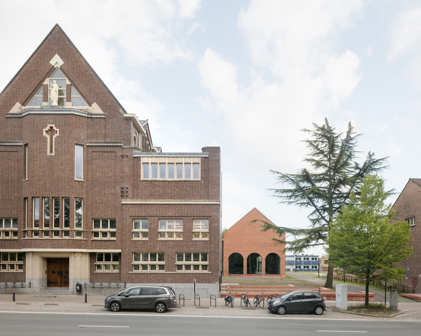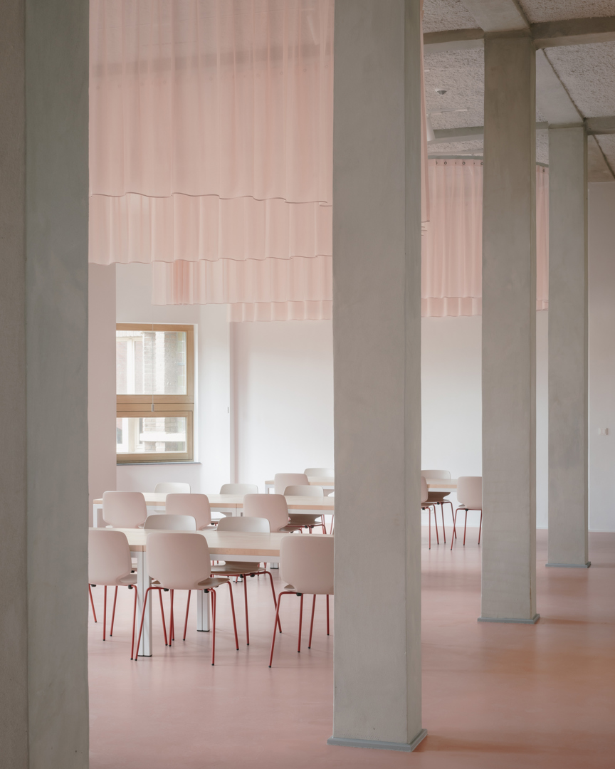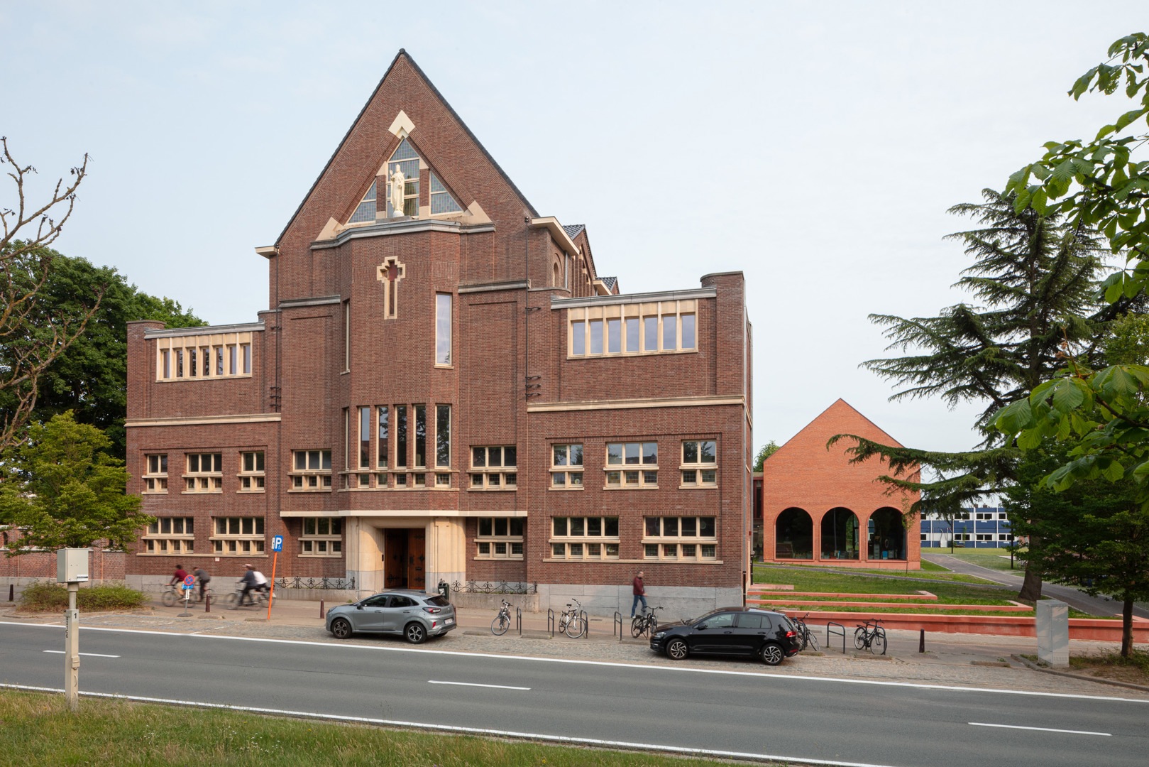 Het project combineert een compact ontwerp met gedeeld gebruik, flexibiliteit en kruisbestuiving voor sociale duurzaamheid. Als start van het ontwerp bracht een boomdeskundige de haarvaten van de bomen in kaart. Uit deze studie bleek hoe dicht de gebouwen op de bomen mochten komen. Om mobiele zonnewering te vermijden, bouwden we dikke kasteelmuren met dieperliggende ramen. Ook het gebouw uit de jaren ’30 werd mee fossielvrij gemaakt. Rode zonnepanelen in het dakvlak zorgen samen met het BEO-veld voor de CO2-neutrale technieken. Er werd ingezet op biodiversiteit en het project is waterneutraal. Circulariteit treffen we aan in verschillende vormen: raambeslag werd herbruikt, materialen van sloop werden vooraf getest in labo’s en terug in omloop gebracht via de lokale bouwhandel.