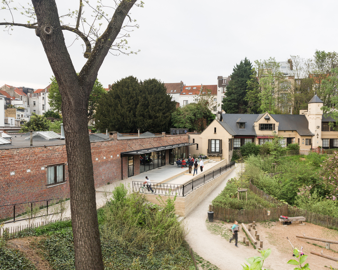 Het project betreft de restauratie van een beschermd park en de herinrichting van zijn voorzieningen in een dicht stedelijk weefsel in Sint-Gillis. De opdracht had als doel de ecologische, sociale en ruimtelijke continuïteiten van de site te versterken, in relatie tot een stedelijke strategie van groen-blauw en recreatief netwerk. Het project omvat de heraanleg van de landschappelijke ruimtes, de transformatie van de petanquebaan, de aanleg van een speelzone en nieuwe verbindingen met de school en de wijk. De ingreep vertrekt vanuit de bestaande structuren — topografie, hydrologie en vegetatie — om een samenhangende, toegankelijke en veerkrachtige publieke ruimte te creëren.
