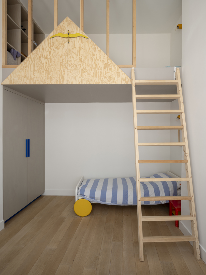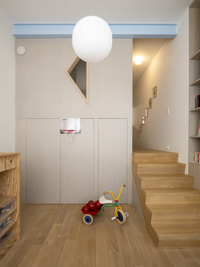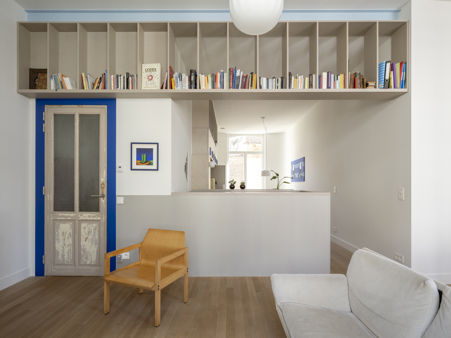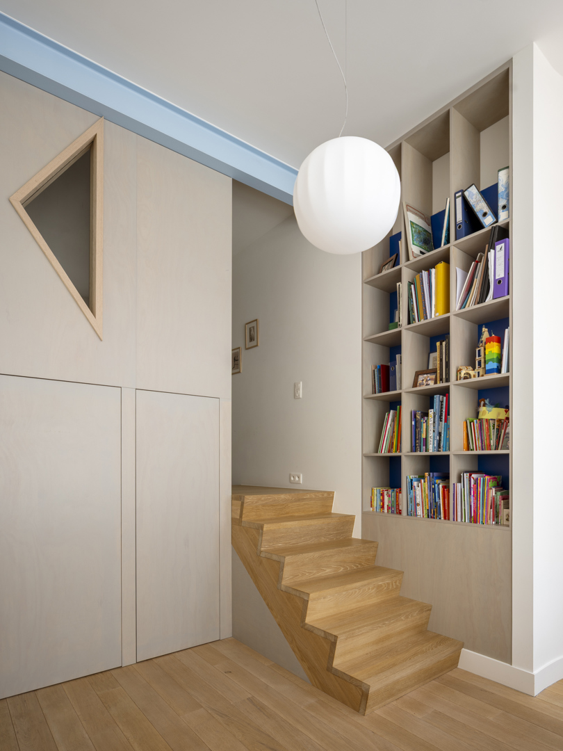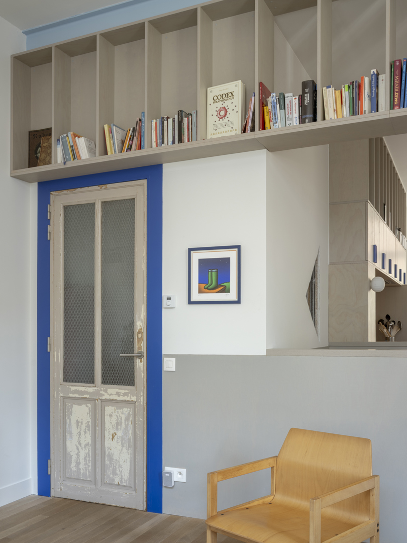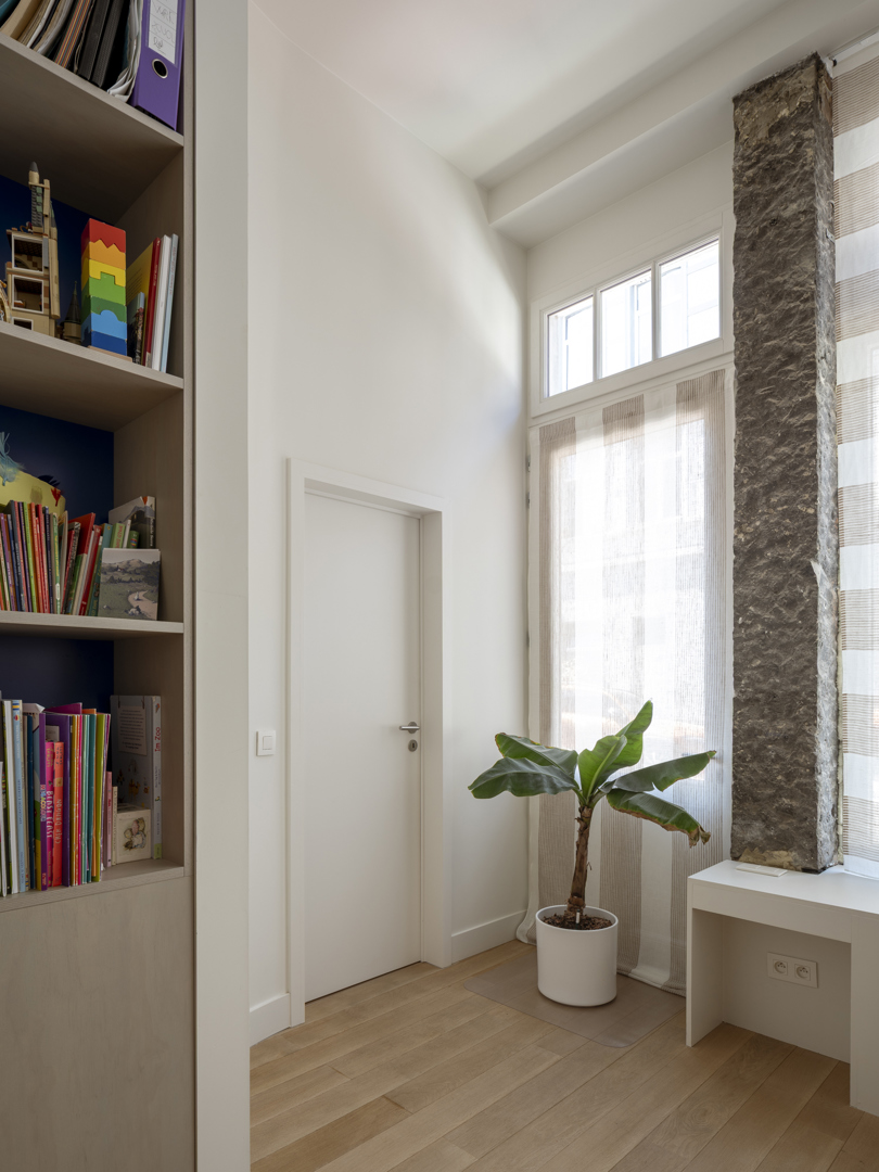 De voornaamste uitdaging was het omvormen van een voormalige winkelruimte op het gelijkvloers en een verdieping erboven tot een coherente, leefbare duplex — met een atypische sectie en een gedeelde traphal met de andere bewoners. De oplossing lag in een slimme omkering: het dagelijkse leven werd verheven naar de eerste verdieping, terwijl de nachtzone beneden werd gesitueerd. Een zorgvuldig ontworpen meubelstuk verenigt trap, boekenkast en keuken tot één architecturaal geheel. De voormalige winkeltoegang blijft aanwezig als toekomstige tweede ingang.