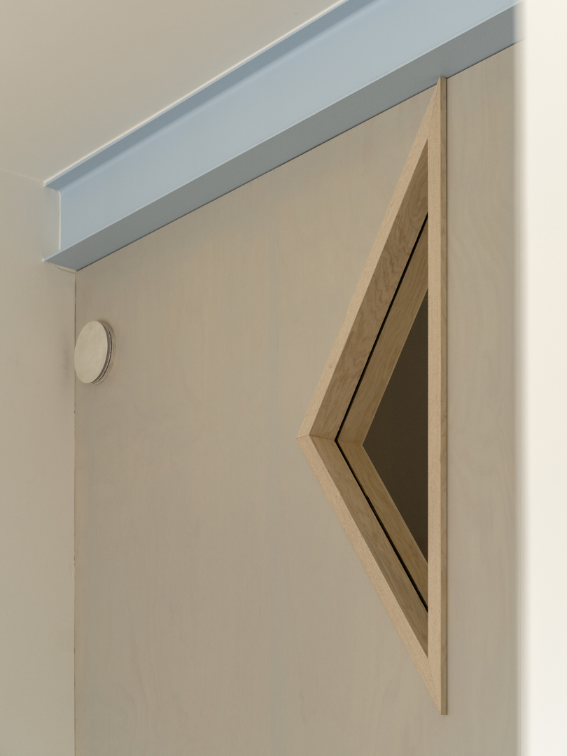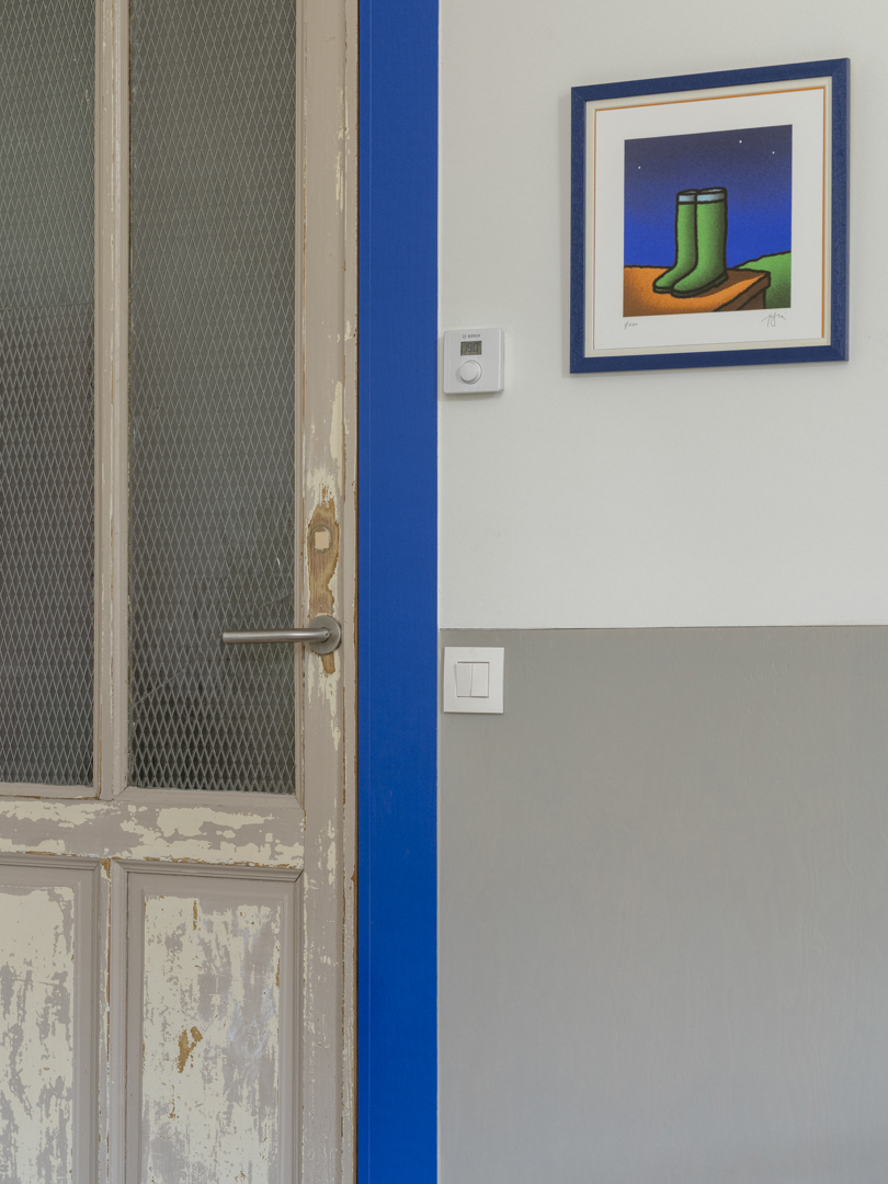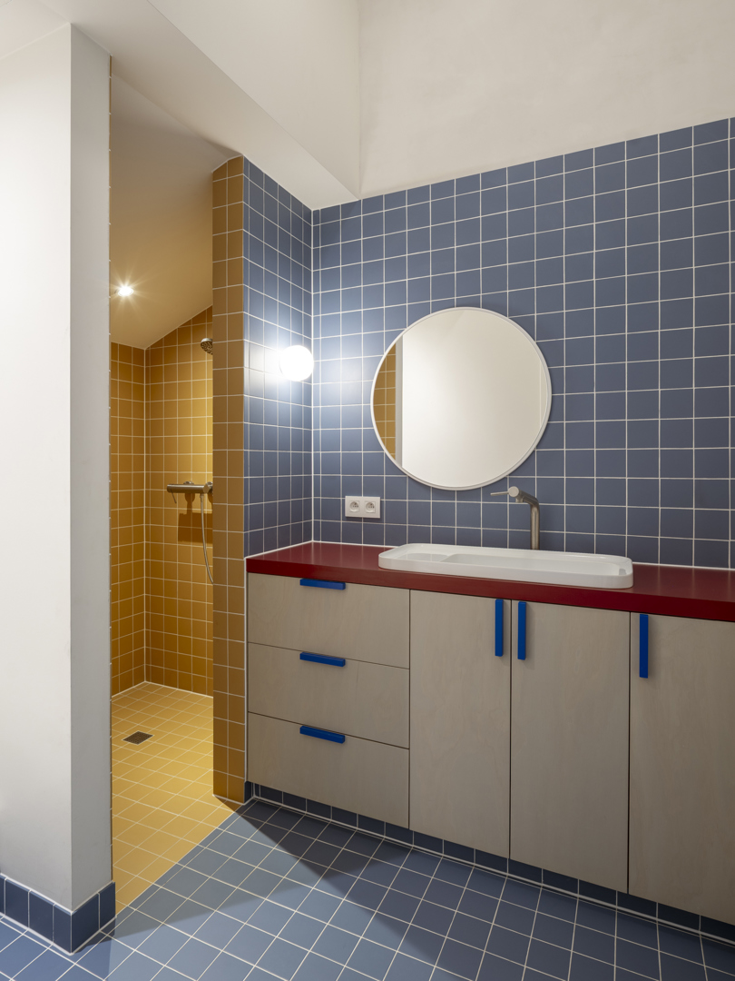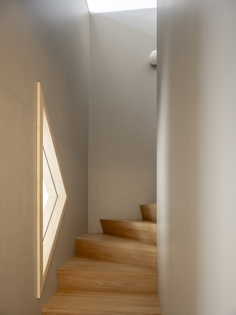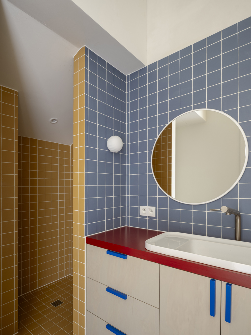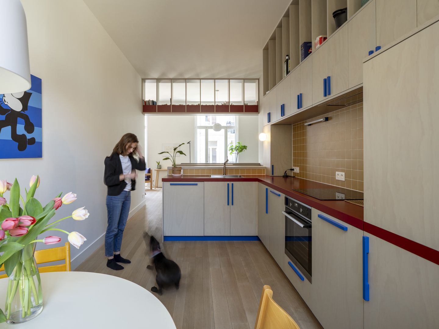 De voornaamste uitdaging was het omvormen van een voormalige winkelruimte op het gelijkvloers en een verdieping erboven tot een coherente, leefbare duplex — met een atypische sectie en een gedeelde traphal met de andere bewoners. De oplossing lag in een slimme omkering: het dagelijkse leven werd verheven naar de eerste verdieping, terwijl de nachtzone beneden werd gesitueerd. Een zorgvuldig ontworpen meubelstuk verenigt trap, boekenkast en keuken tot één architecturaal geheel. De voormalige winkeltoegang blijft aanwezig als toekomstige tweede ingang.