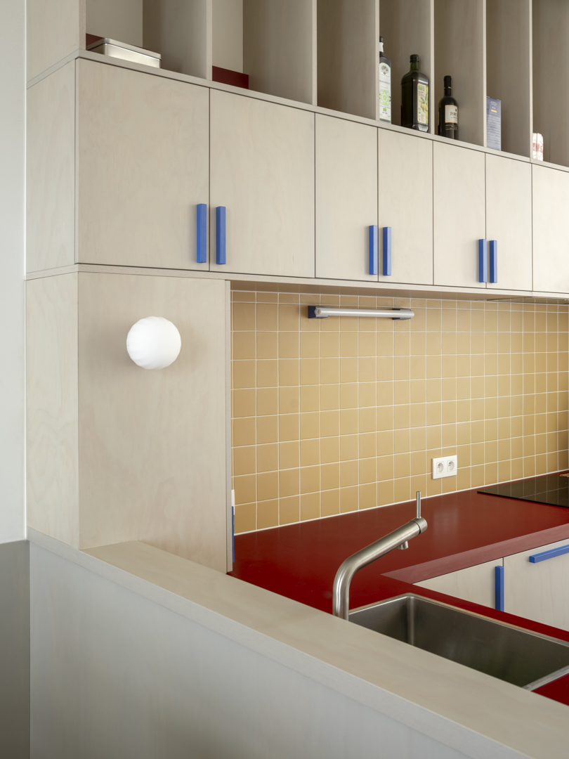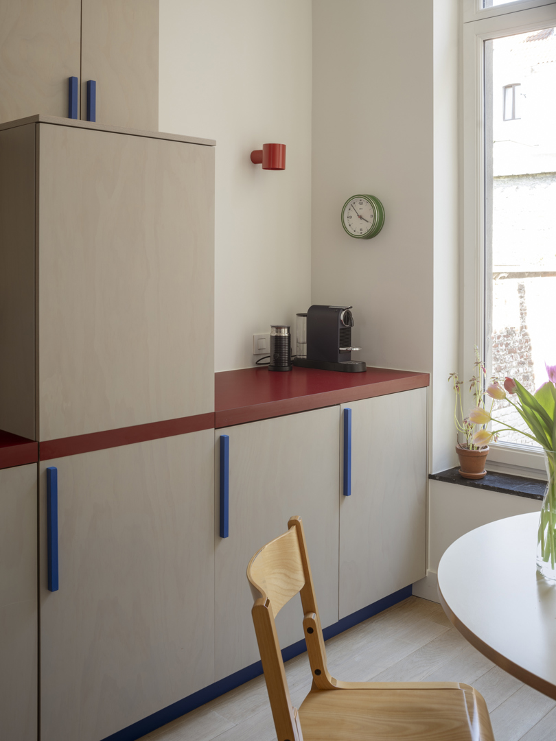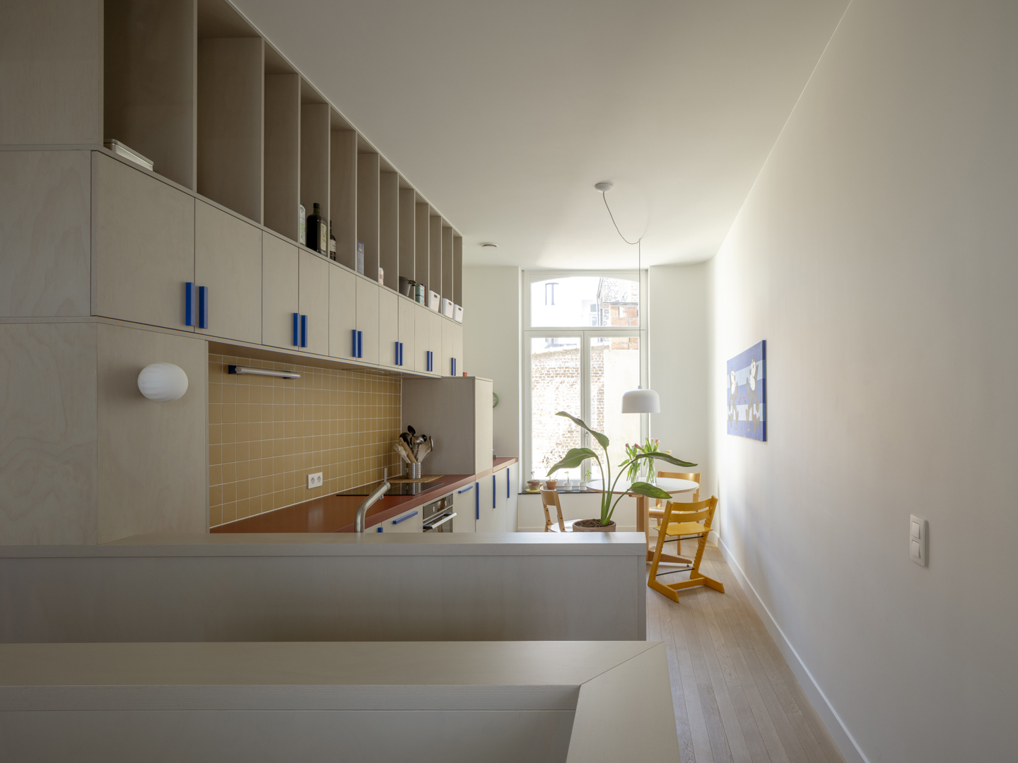 Het project plaatst het dagelijkse leven bewust op de eerste verdieping. Die keuze biedt rust en privacy, maar ook verbinding met de straat via grote deuren naar het balkon — de plek voor krant en koffie in de zon. Bij het binnenkomen creëert een eerste doorzicht van hal naar keuken een gevoel van ruimte en oriëntatie. Het centrale meubelstuk — dat trap, boekenkast en keuken verbindt — geeft de woning een warm, samenhangende identiteit. De flexibele opzet, met een mogelijke tweede toegang in de toekomst, geeft bewoners de zekerheid dat de woning meegroeit met hun leven.