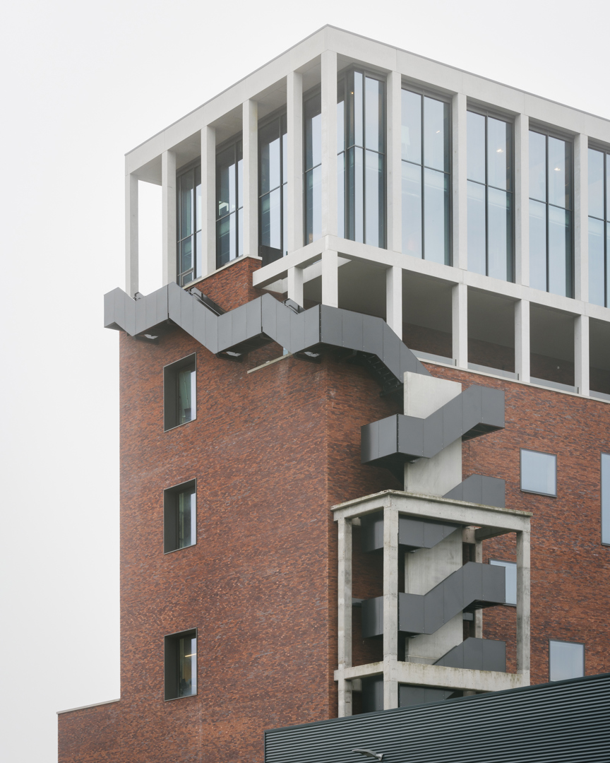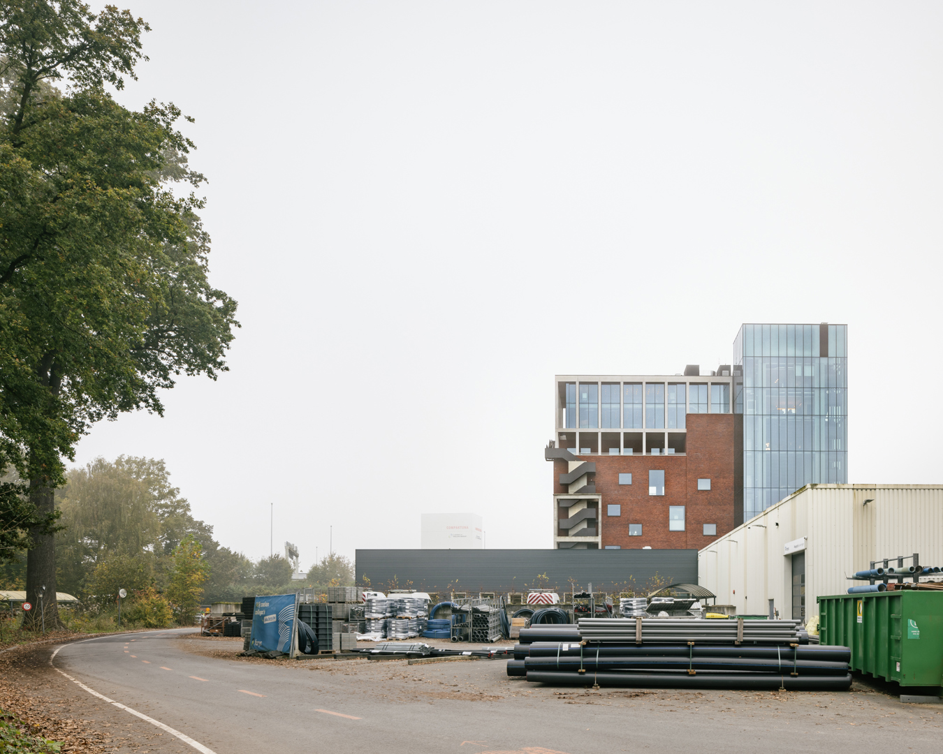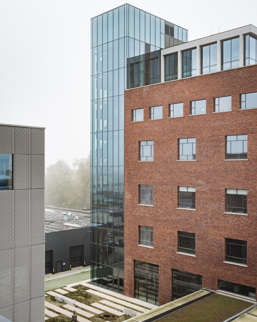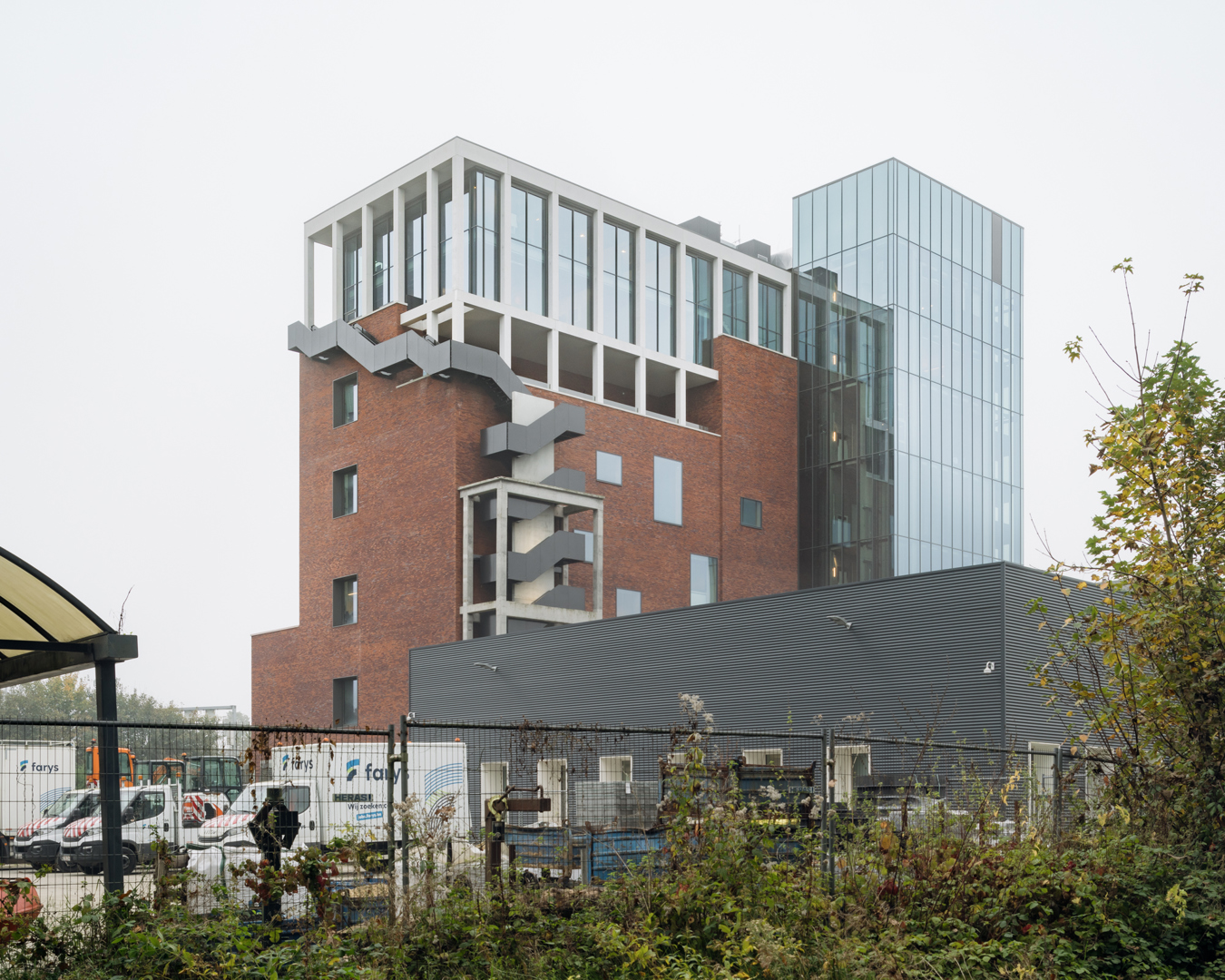 De Polytoren transformeren betekende een complexe brownfield-uitdaging: een ontmantelde fabriek herbestemmen tot een toekomstbestendig hoofdkantoor naast de drukke E17. Het project vereiste behoud van industrieel erfgoed, het openen van de toren voor nieuw programma en het creëren van een mensgerichte werkomgeving. Oude en nieuwe functies werden verweven: bakstenen gevels werden gereinigd, geïsoleerd en subtiel uitgebreid, mezzanines en penthouses benutten de industriële hallen, en circulaire technieken en duurzame energie maken het gebouw futureproof. Na de wedstrijd werden extra programma-eisen ondergebracht in een nieuw, adaptief volume, in plaats van nog meer functies in de toren te stapelen. Een glazen galerij verbindt de volumes en fungeert als akoestische buffer tegen de snelweg.
