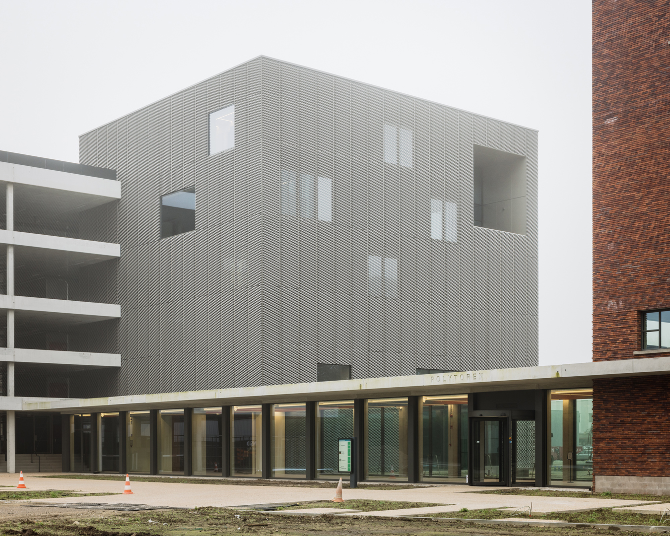 Polytoren transformeert een historische fabriek tot een toekomstbestendig kantoor binnen een bestaande site. Het gebouw opereert fossielvrij dankzij lucht-waterwarmtepompen, free-cooling, energie-efficiënte verlichting en zonne-energie aangesloten op een bestaand netwerk van PV-panelen op het terrein. Door een intelligent, adaptief ontwerp kunnen parkeervloeren flexibel omgevormd worden tot kantoorruimte, waardoor CO2-impact wordt beperkt. Behoud van de structuur, gebruik van recycleerbare materialen en lokaal geproduceerde bakstenen combineren ecologie met circulair bouwen. Een fietsenstalling, laadpunten en doucheruimtes voor personeel moedigen duurzame mobiliteit aan. Flexibele werk- en ontmoetingsruimtes versterken sociale en economische meerwaarde voor de omgeving.