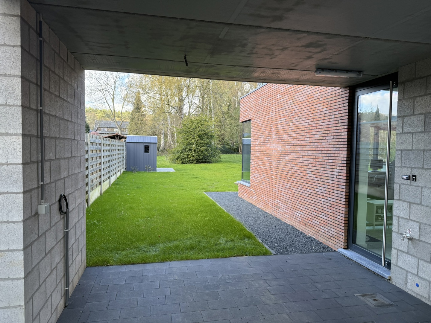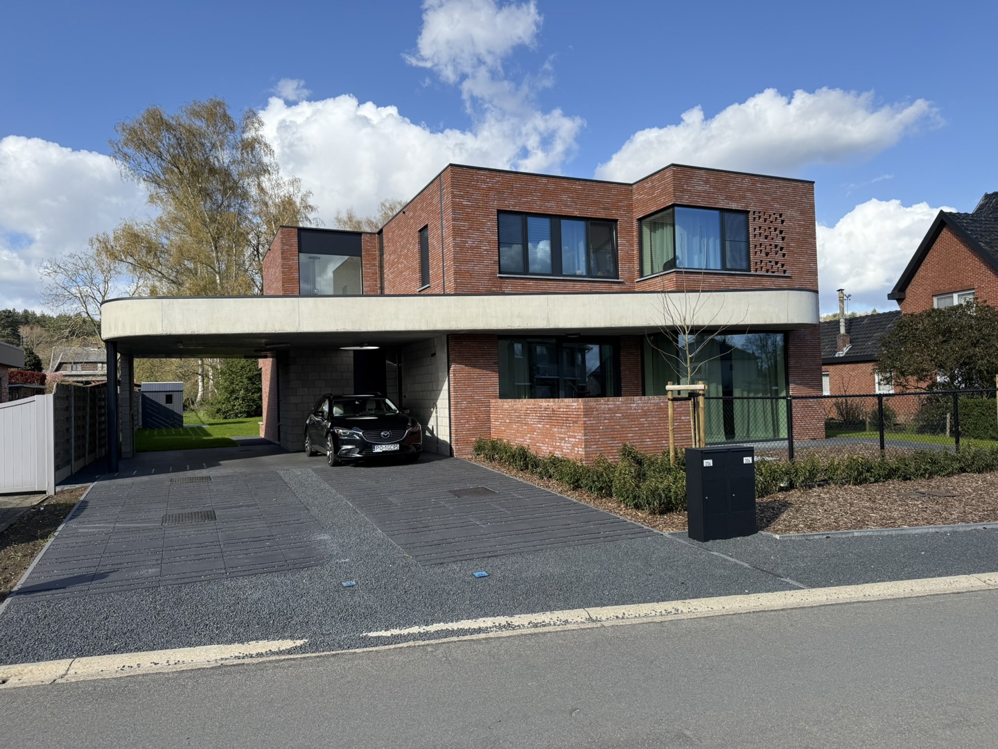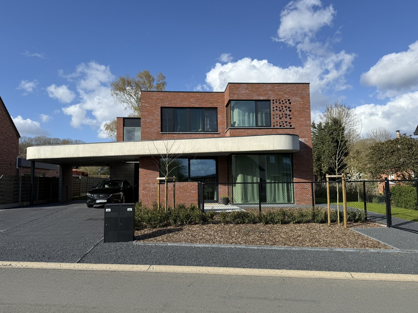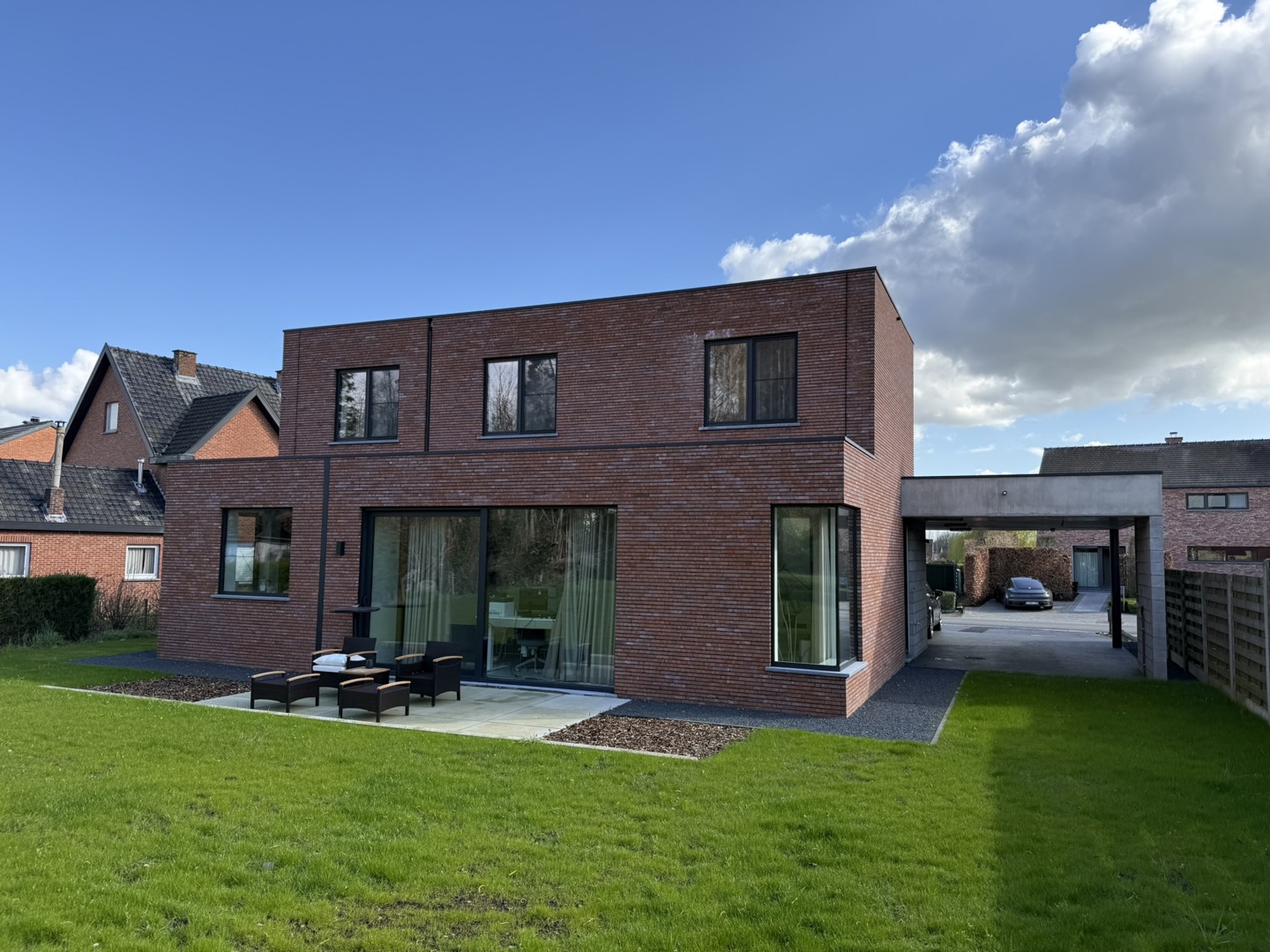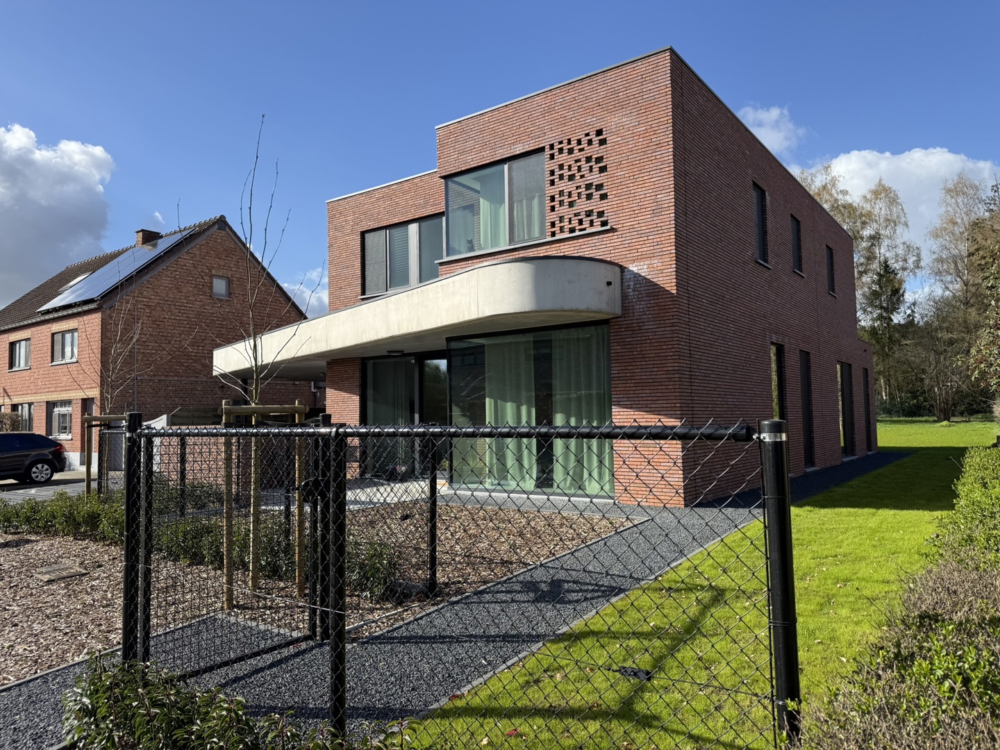 De opdracht was het realiseren van een BEN (E2/E6) dubbelwoonst op een perceel voor open bebouwing, waarbij het volume de uitstraling behoudt van één uniforme woning. In plaats van de klassieke nevenschikking, kiest dit project voor een innovatieve schakeling van de woningen achter elkaar. Hiermee anticipeert het ontwerp direct op de Vlaamse 'betonstop'. - Maximale natuurwaarde: Door de woningen achter elkaar te plaatsen, voorkomen we versnippering van de tuinzone. - Minimale verharding: Carports zijn gebundeld aan de linkerzijde, waardoor de rechterzijde volledig groen blijft. - Klimaatadaptief ontwerp: Twee strategisch geplaatste platanen in de voortuin aan de straatzijde fungeren als natuurlijke zonwering en versterken het collectieve groene straatbeeld.