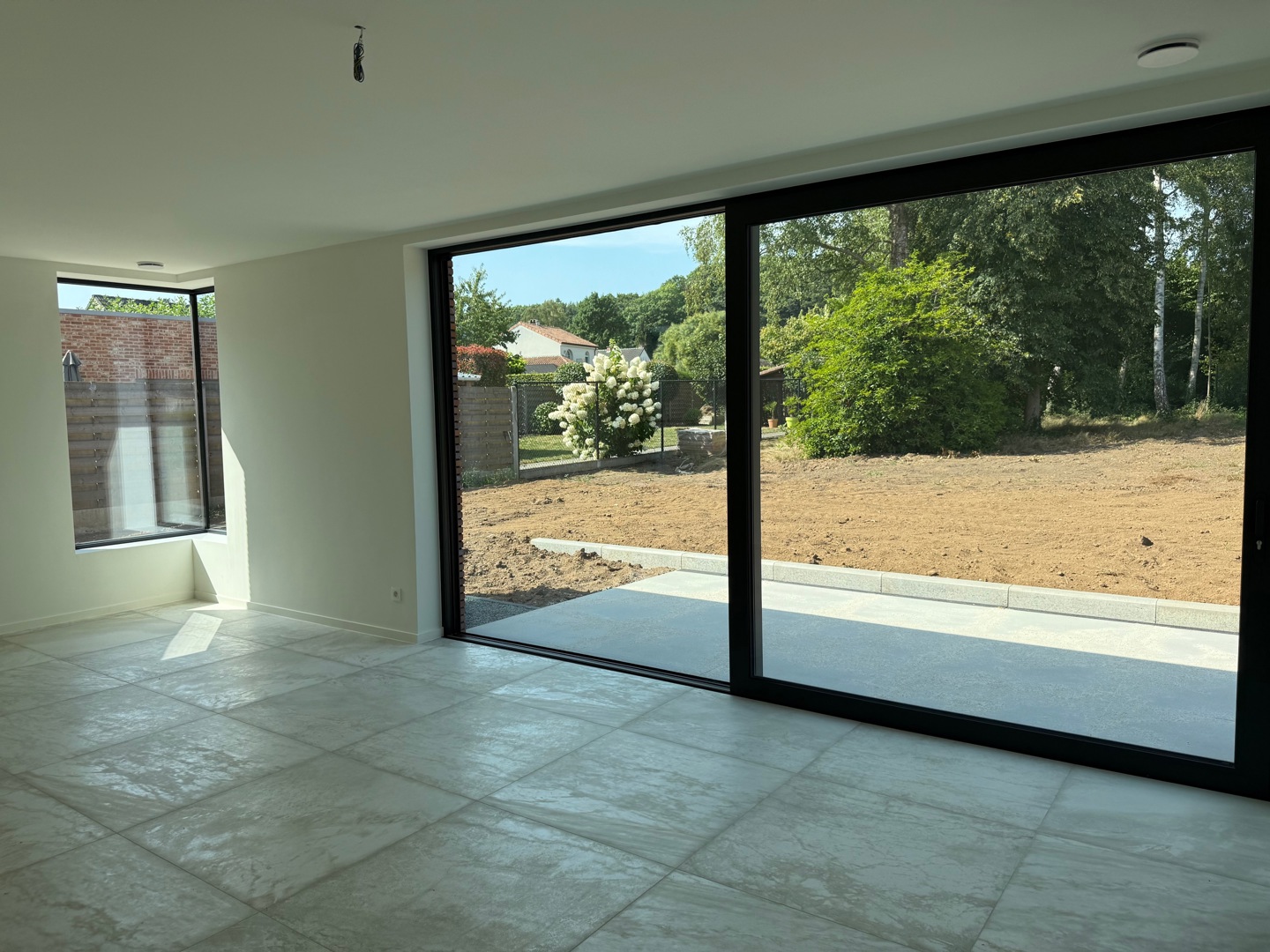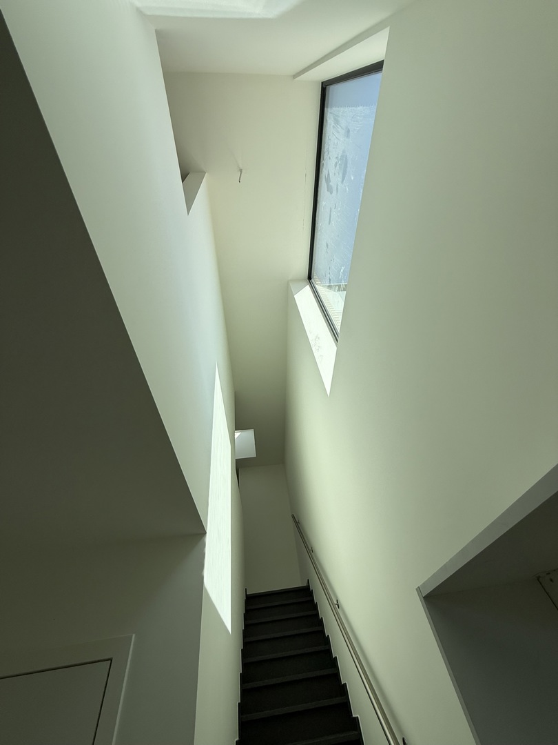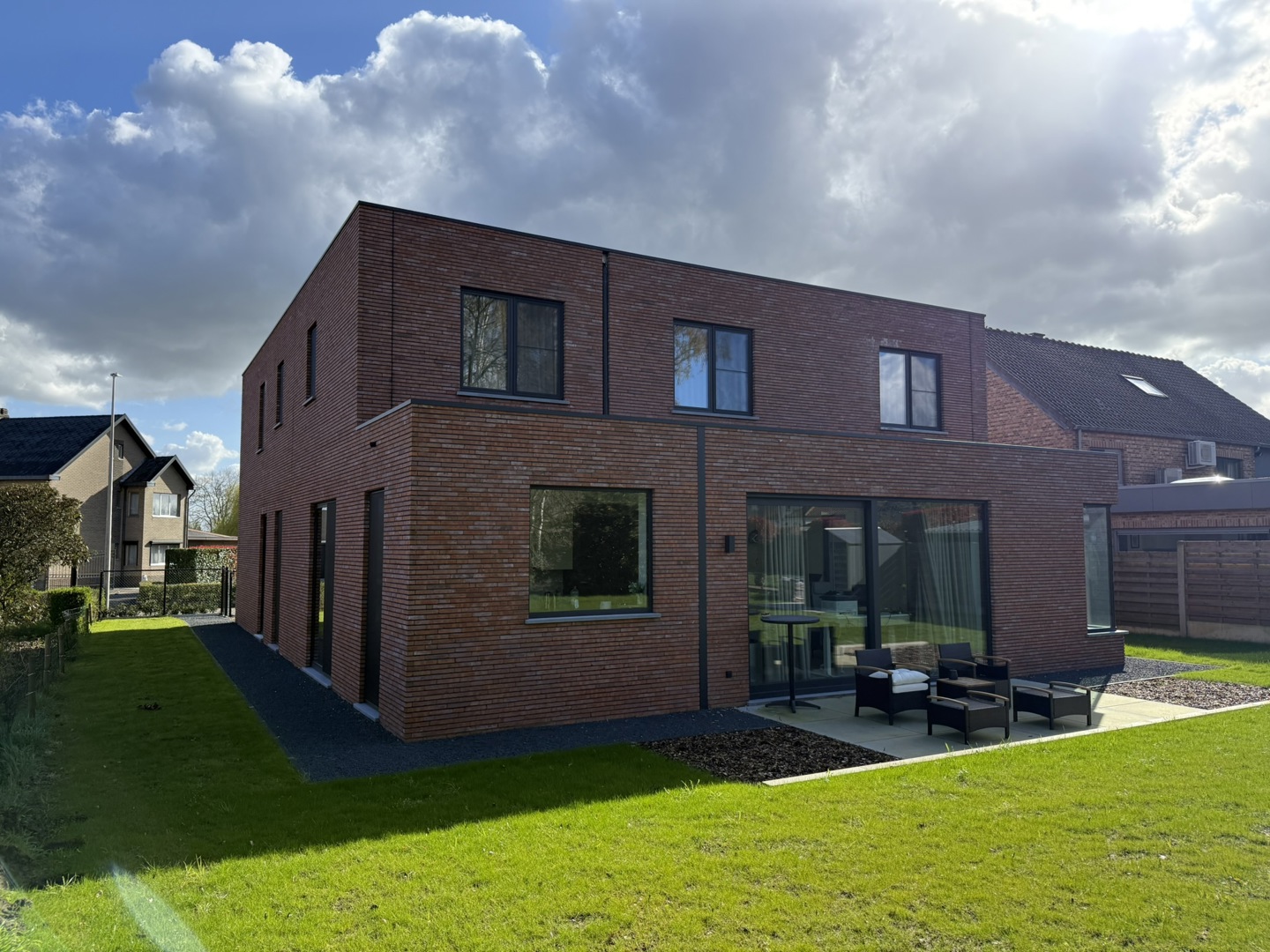 De grootste uitdaging was de beperkte perceelbreedte, die een traditionele dubbelwoonst onmogelijk maakt. De gekozen 'back-to-back' schakeling lost dit op, maar vraagt om een creatieve regie van licht en privacy: - Lichtinval in de diepte: De noordgerichte achterste woning baadt toch in het zonlicht dankzij een royale vide met een zuidgericht bovenraam. Hierdoor dringt direct daglicht diep door tot in de leefruimte. - Gewaarborgde privacy: Voor de voorste woning wordt de intimiteit gewaarborgd door een doordachte voortuin met hagen, een strategisch geplaatst tuinmuurtje en 2 platanen. - Ruimtelijke winst: Het perceel werd getransformeerd tot een kwalitatieve woonomgeving met een onversnipperde, grote achtertuin. Hoekramen met glashoeken vervagen de grens tussen binnen en buiten.