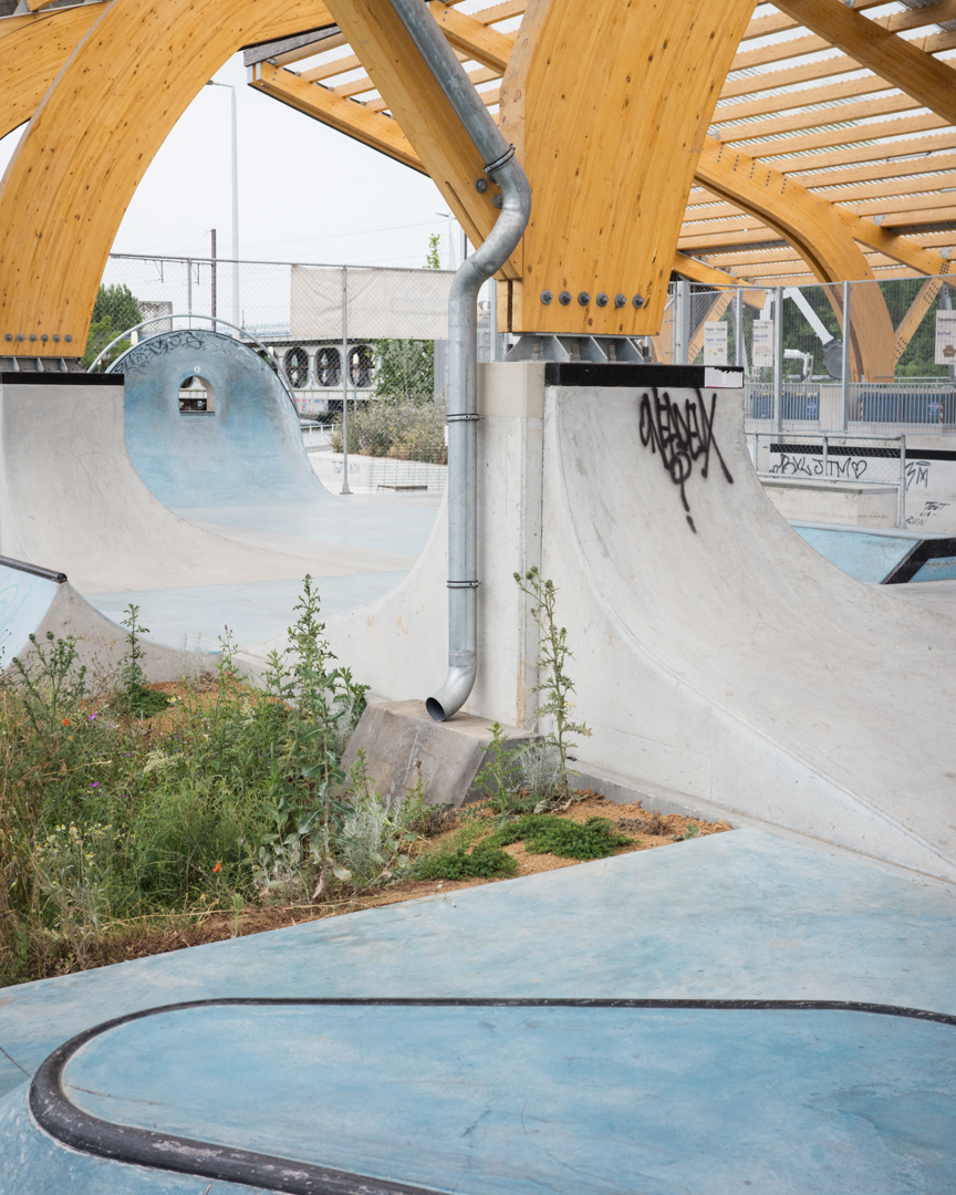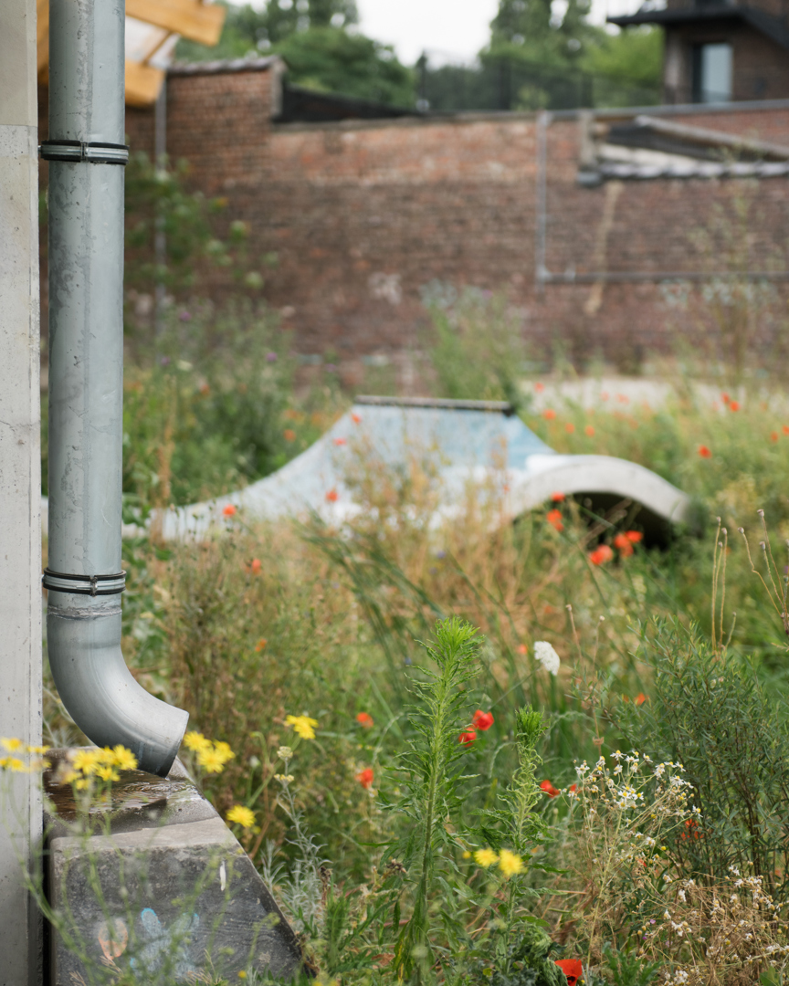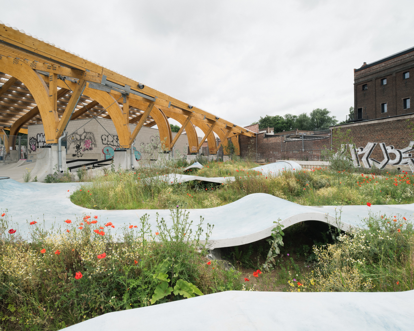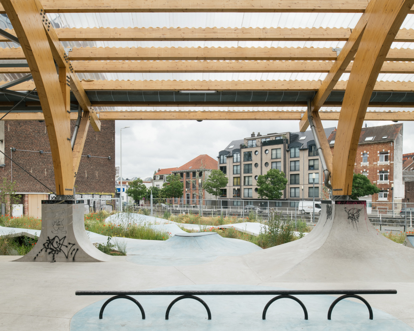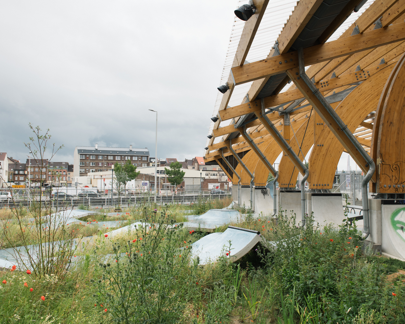 Het ontwerpproject van deze nieuwe openbare ruimte draagt bij aan de hydrologische functie met als doel de ontkoppeling van het afstromende water van het zuidelijke dak van de hal om dit te temporiseren, te infiltreren en te evapotranspireren. Naast de gunstige hydrologische impact op de overbelasting van de gecombineerde riolering, zal deze inrichting een zeer interessante landschappelijke en milieukwaliteit aan de wijk toevoegen. De inrichting van deze toekomstige openbare ruimte biedt de kans om niet alleen een voorziening te creƫren die past binnen de skatesport op regionale schaal, maar ook binnen de complementariteit van natuurlijke locaties en die een echt koeleiland vormt voor de wijk.