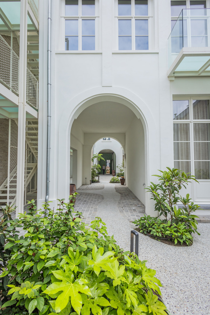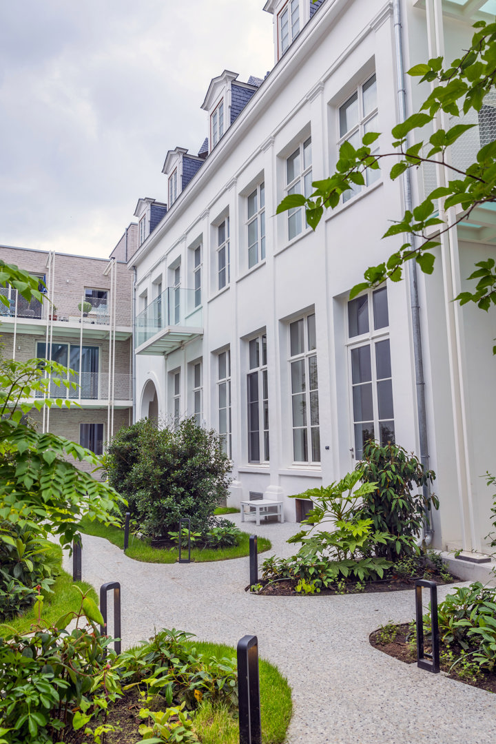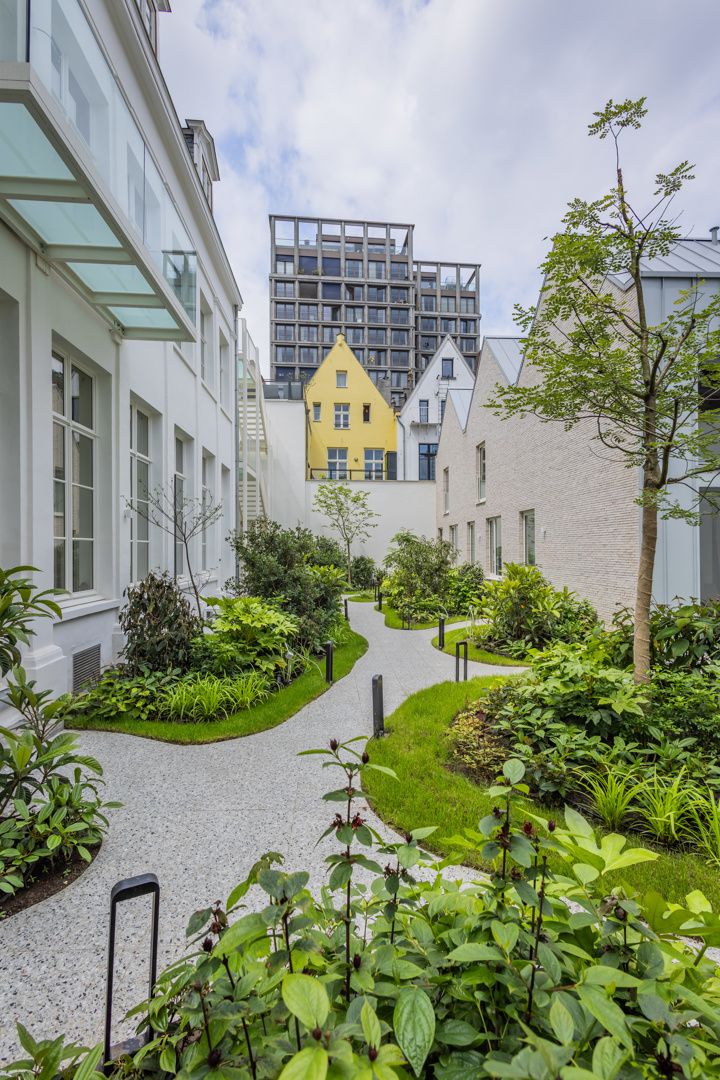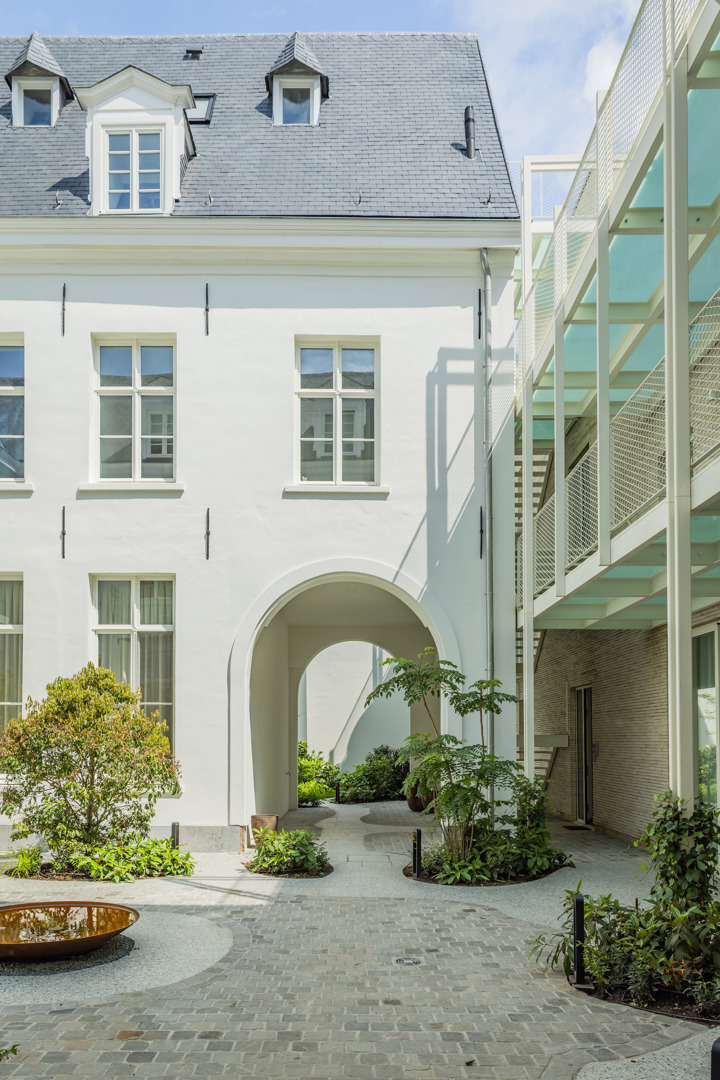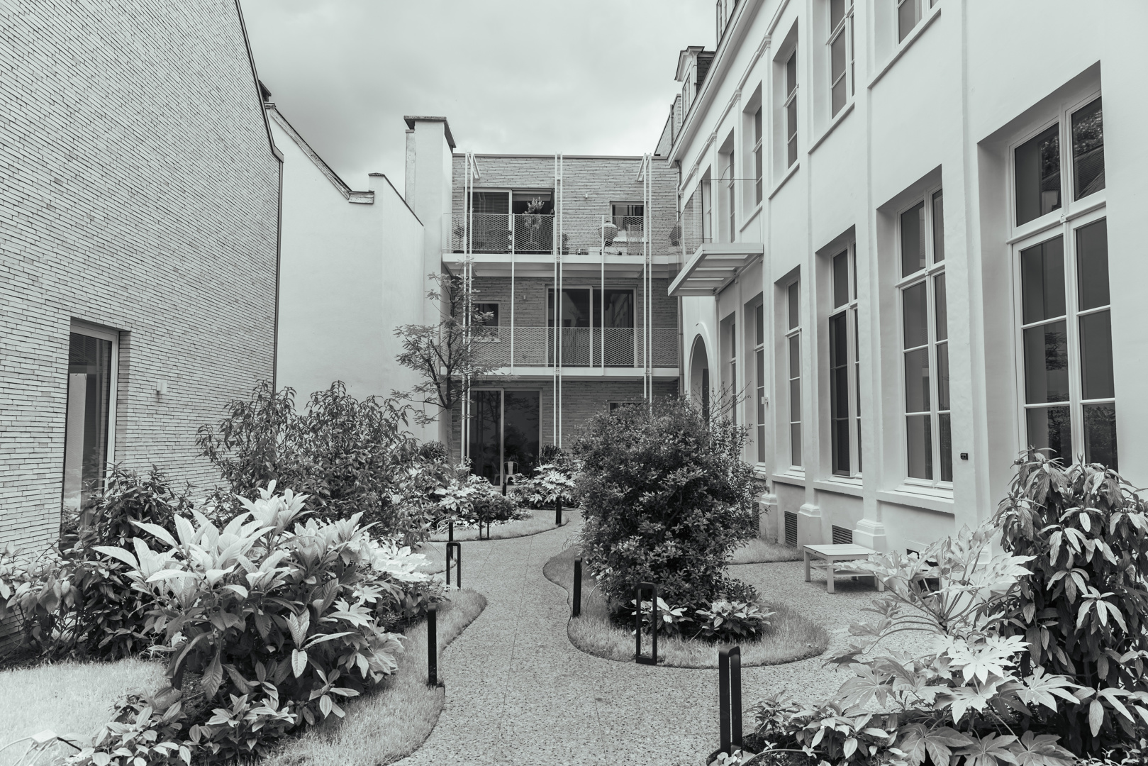 De grootste uitdaging lag in het herstellen van ruimtelijke kwaliteit binnen een dense historische context. - Balans tussen erfgoedbehoud en nieuwbouw - Ontpitten van een dens bouwblok - Oplossen van niveauverschillen - de lichte staalstructuur functioneert zowel op vlak van circulatie als structureel en architecturaal, zonder dominant te worden. - Het creëren van voldoende licht en zicht in compacte stedelijke opgeving. - Het organiseren van collectieve binnentuin die zowel rust als sociale interactie mogelijk maakt. - Het combineren van 2-laagse ondergrondse parking naast/tegen monument. - Coherentie brengen binnen een grillige context: creëren van een architecturale eenheid via materialiteit, kleurgebruik en detaillering, zonder homogenisering van de geschiedenis.