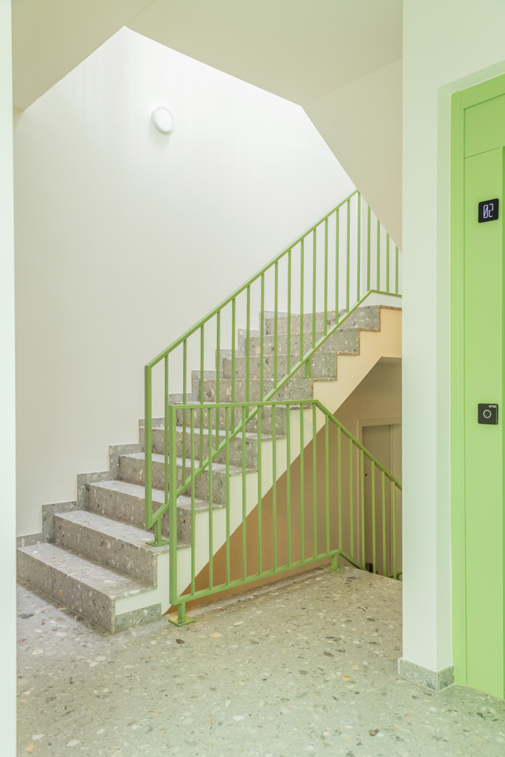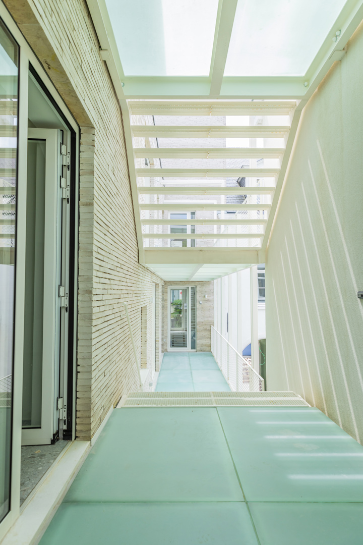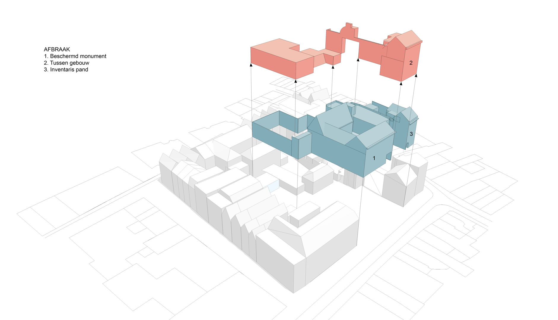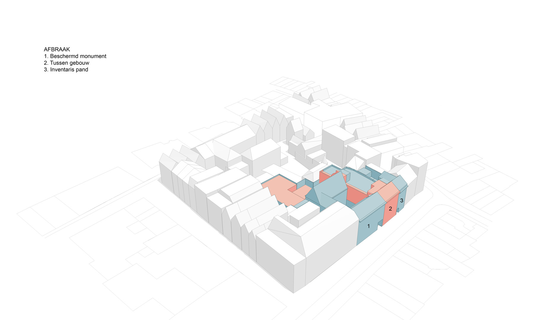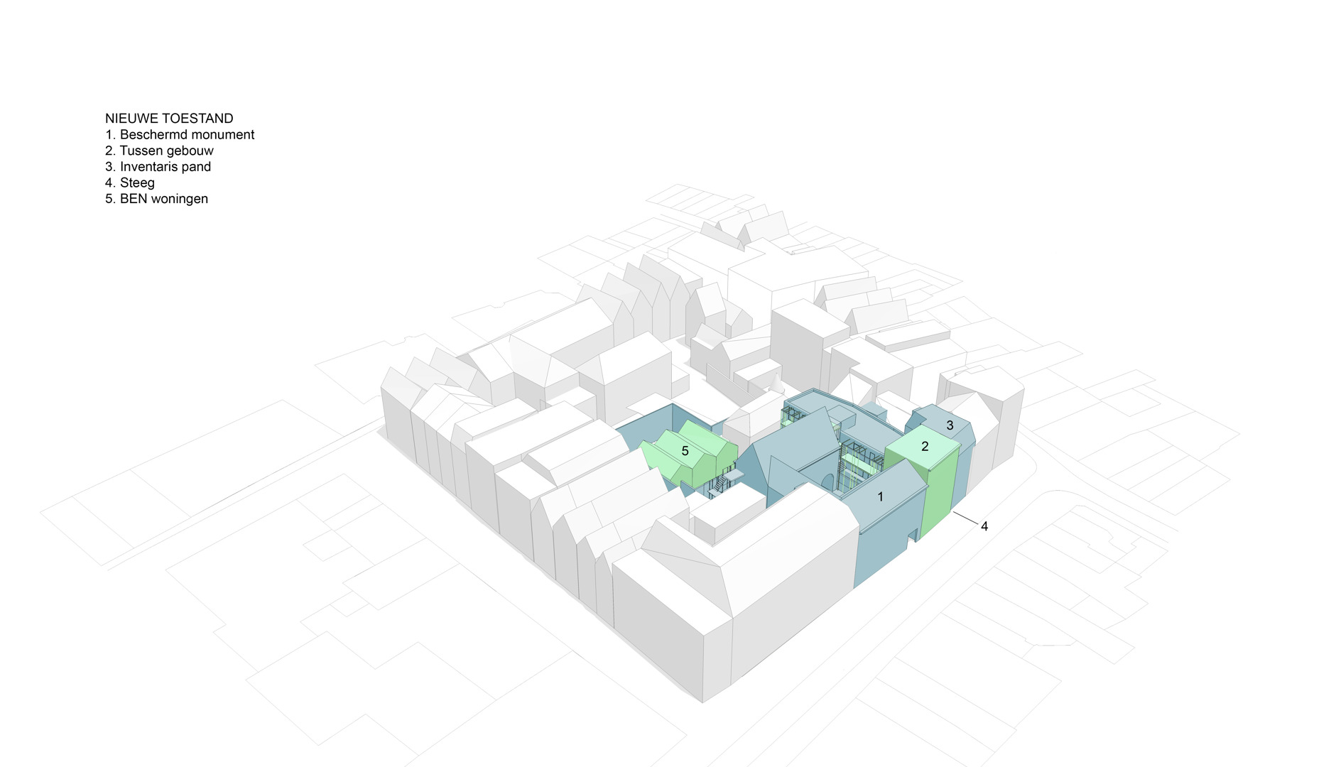 De grootste uitdaging lag in het herstellen van ruimtelijke kwaliteit binnen een dense historische context. - Balans tussen erfgoedbehoud en nieuwbouw - Ontpitten van een dens bouwblok - Oplossen van niveauverschillen - de lichte staalstructuur functioneert zowel op vlak van circulatie als structureel en architecturaal, zonder dominant te worden. - Het creëren van voldoende licht en zicht in compacte stedelijke opgeving. - Het organiseren van collectieve binnentuin die zowel rust als sociale interactie mogelijk maakt. - Het combineren van 2-laagse ondergrondse parking naast/tegen monument. - Coherentie brengen binnen een grillige context: creëren van een architecturale eenheid via materialiteit, kleurgebruik en detaillering, zonder homogenisering van de geschiedenis.
