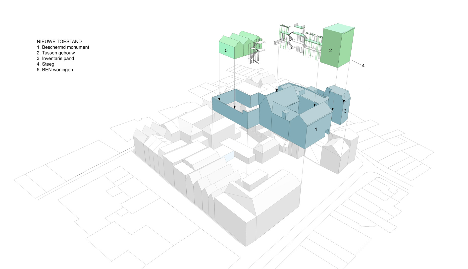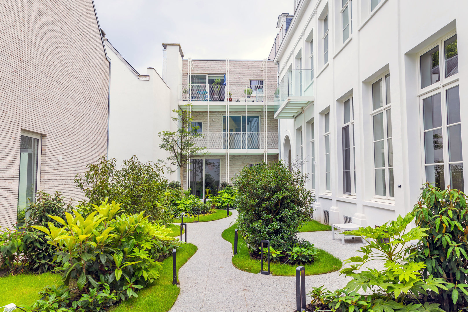 Duurzaamheid wordt integraal benaderd. Het hergebruik en herstel van het monument vormt de eerste ecologische daad. De ontpitting verbetert lichttoetreding, ventilatie en microklimaat. De BEN-prestaties van de drie grondgebonden woningen maken het project energie-efficiënt en toekomstgericht. - Duurzaamheid door herbestemming en hergebruik bestaand patrimonium. - Bijna-energieneutrale (BEN) prestaties voor de nieuwbouwvolumes. - Eenduidige en robuuste materiaalkeuze met lange levensduur en onderhoudsvriendelijkheid. - Toekomstgerichte constructielogica. - Ruimtelijke duurzaamheid: oriëntatie op nieuwe centrale binnentuin, als collectieve groene ruimte. - Diversiteit aan woontypologieën (appartementen, woningen, kangoeroewoning, voor-en achterhuis) die inspelen op veranderende woonnoden.