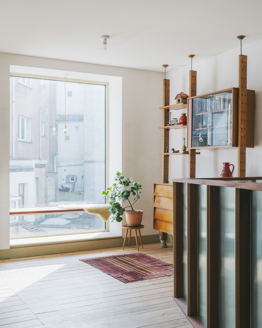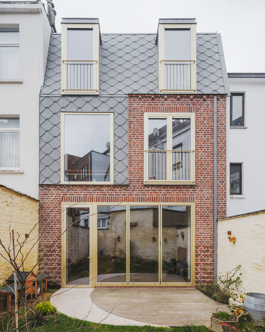 Totaalrenovatie van een Brussels herenhuis voor een gezin van vijf waarbij de ruimtes intern verbonden worden met vides en doorzichten, van de tuin, door het huis, tot het dakterras. We ontpitten de buitenruimte en het huis, en we zorgen dat elke kamer in het huis er een is om echt te willen bewonen. Een bureauruimte, eetkamer en keuken op het gelijkvloers; verbonden door een vide met de leefruimte op het eerste. De leefruimte kijkt door het schemerende glas van de dressing naar boven, naar het tweede verdiep, waar de zon doorheen de koepels valt en de kinderen spelen op de overmaatse gang. En doorheen de grootste koepel ten slotte, leidt een nieuwe trap ons naar het grote dak waar een moestuin en dakterras ons permanent toegang verlenen tot licht, frisse lucht, en doorzicht op de boomtopp