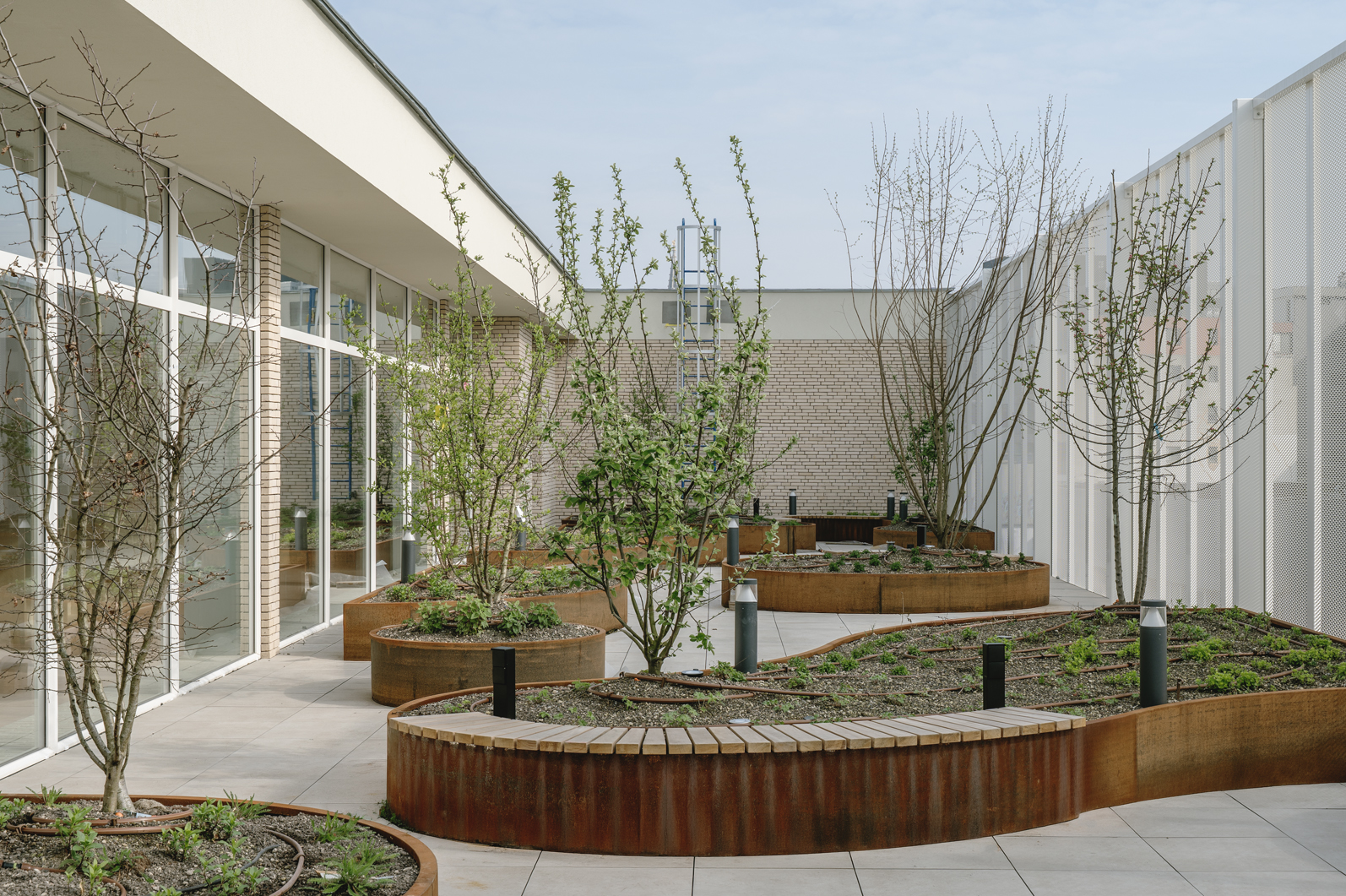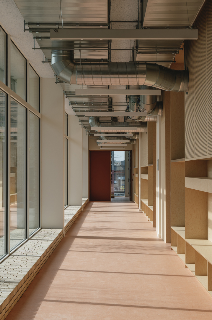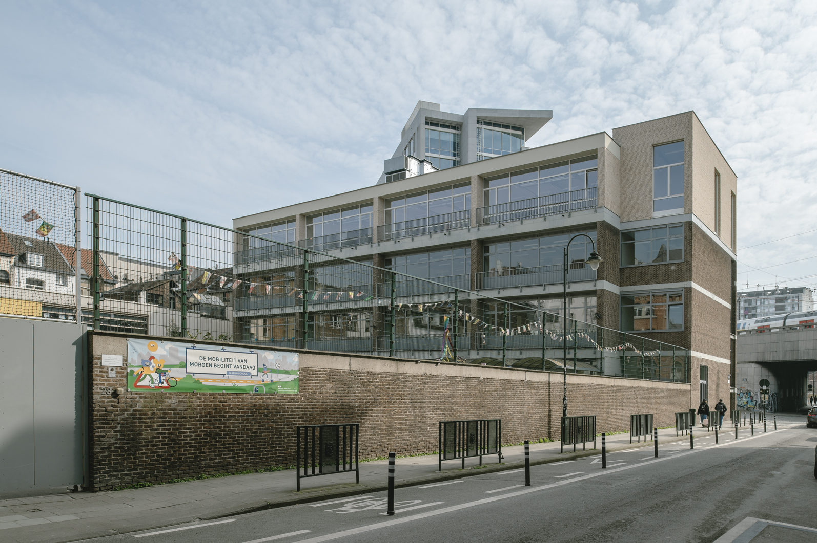 Het project is een toonbeeld van klimaatbestendig bouwen door maximaal in te zetten op hergebruik van de bestaande structuur en het beperken van bijkomende verharding. De lichte ophoging in houtskelet reduceert de CO₂-impact aanzienlijk. De pedagogische daktuin introduceert groen in een dense stedelijke context, draagt bij aan waterbuffering, vermindert hittestress en versterkt de biodiversiteit. Daarnaast zorgen doorgedreven isolatie, performante ventilatie en lage temperatuurverwarming voor een energie-efficiënt geheel. Zonnewering aan de voorgevel beperkt oververhitting. Tot slot is het gebouw flexibel en aanpasbaar opgevat, waardoor het duurzaam kan inspelen op toekomstige noden.