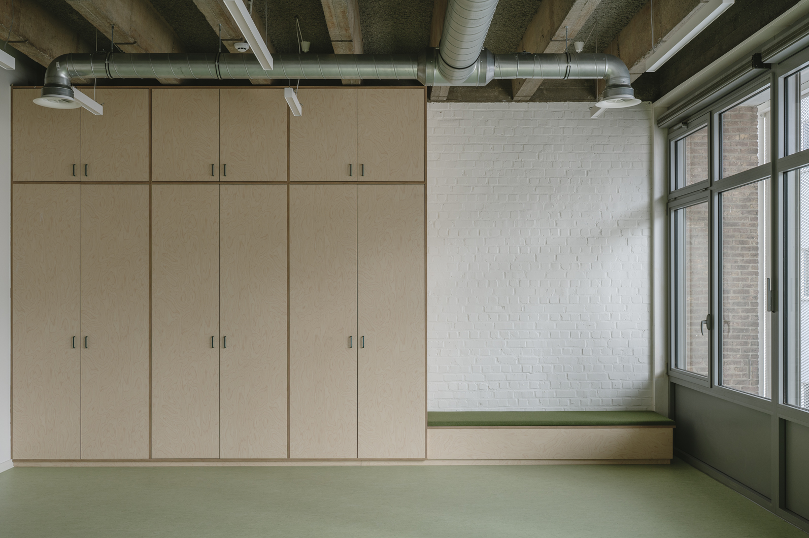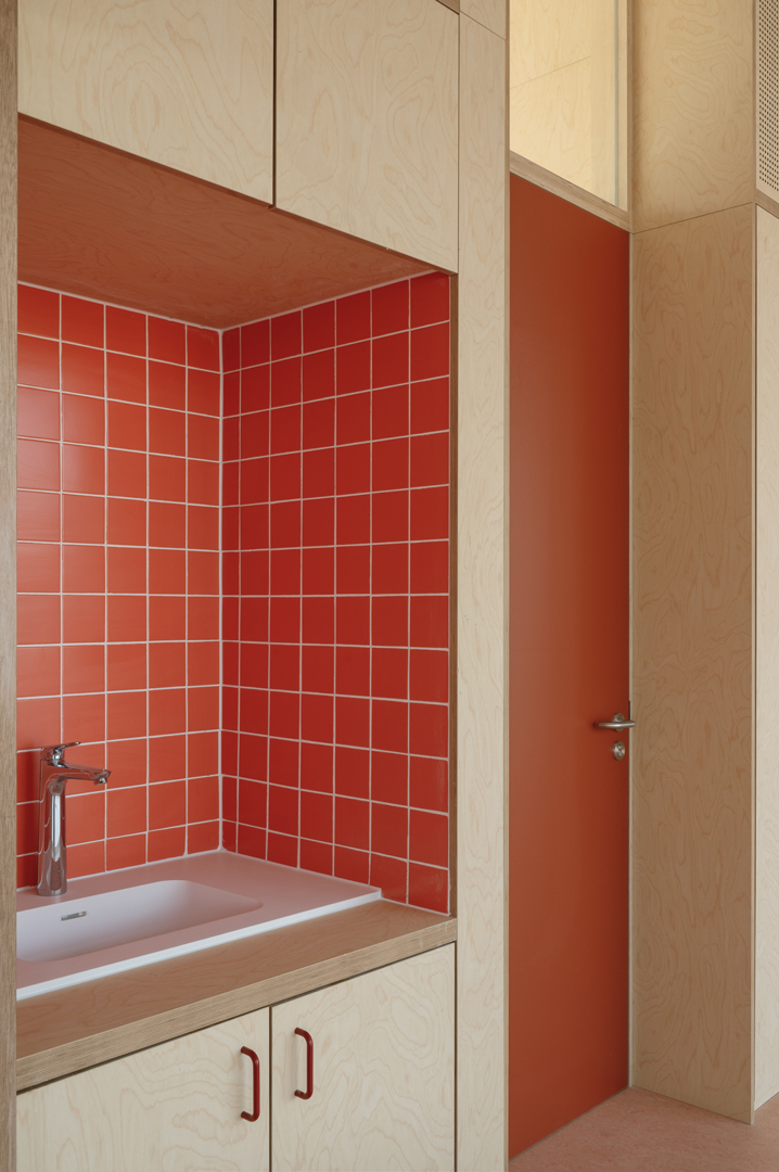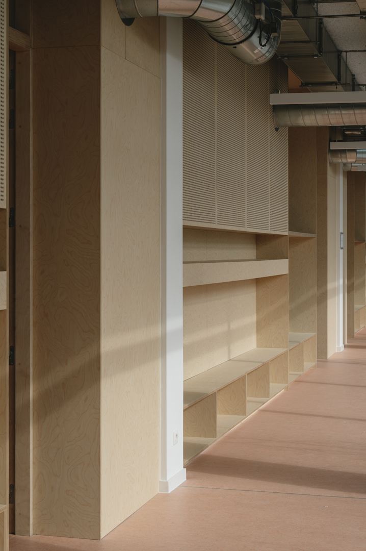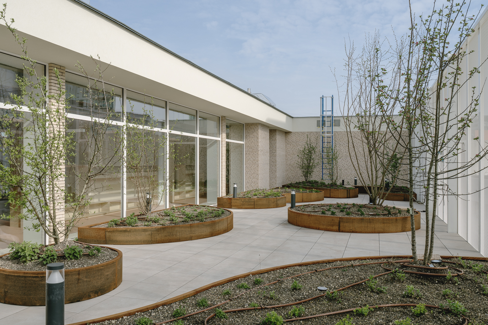 Het project is een toonbeeld van klimaatbestendig bouwen door maximaal in te zetten op hergebruik van de bestaande structuur en het beperken van bijkomende verharding. De lichte ophoging in houtskelet reduceert de CO₂-impact aanzienlijk. De pedagogische daktuin introduceert groen in een dense stedelijke context, draagt bij aan waterbuffering, vermindert hittestress en versterkt de biodiversiteit. Daarnaast zorgen doorgedreven isolatie, performante ventilatie en lage temperatuurverwarming voor een energie-efficiënt geheel. Zonnewering aan de voorgevel beperkt oververhitting. Tot slot is het gebouw flexibel en aanpasbaar opgevat, waardoor het duurzaam kan inspelen op toekomstige noden.
