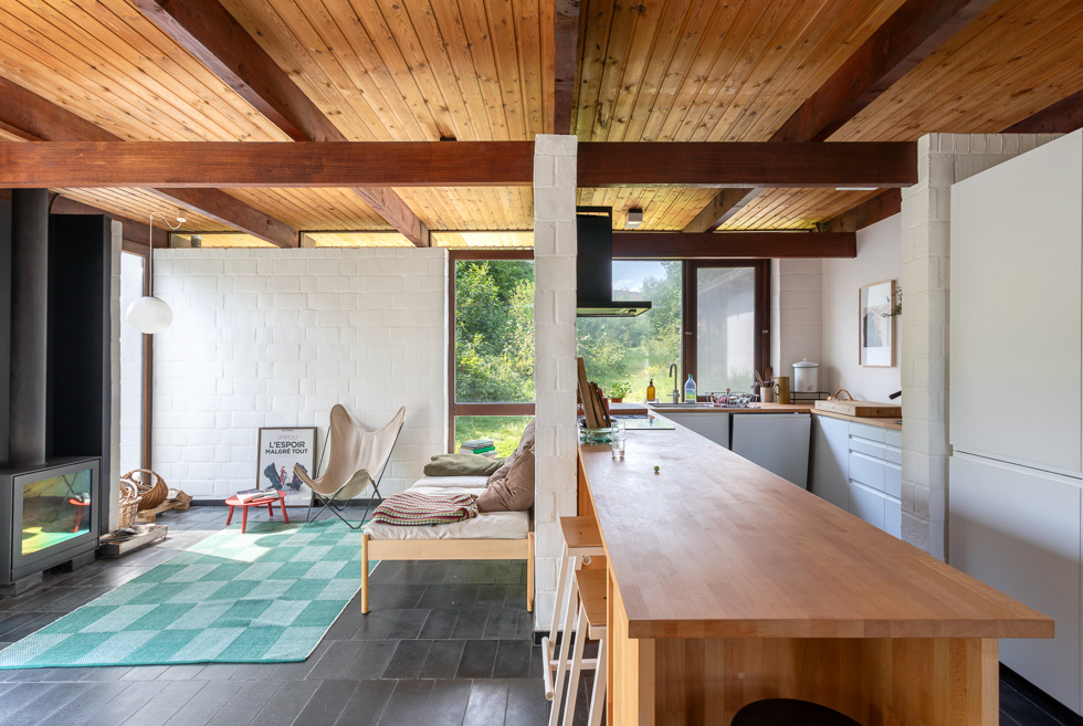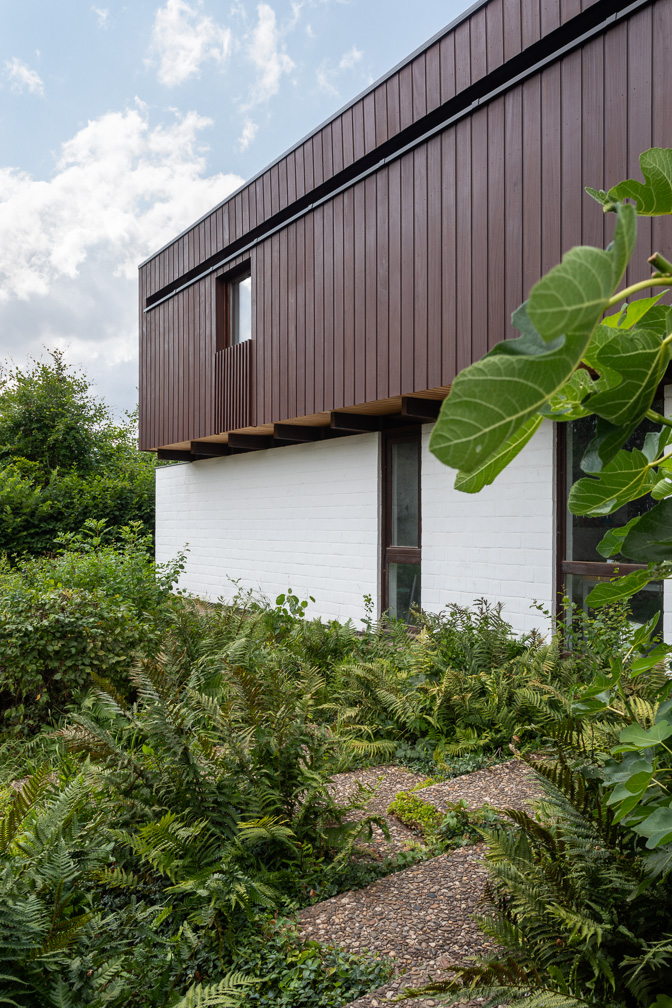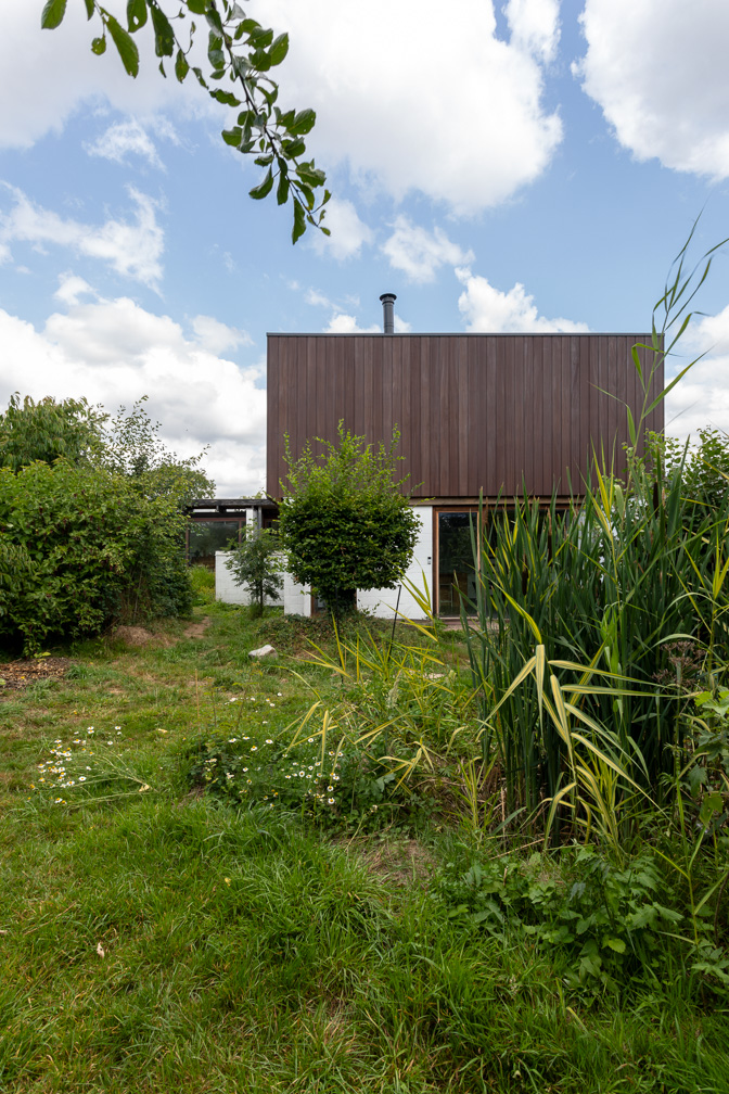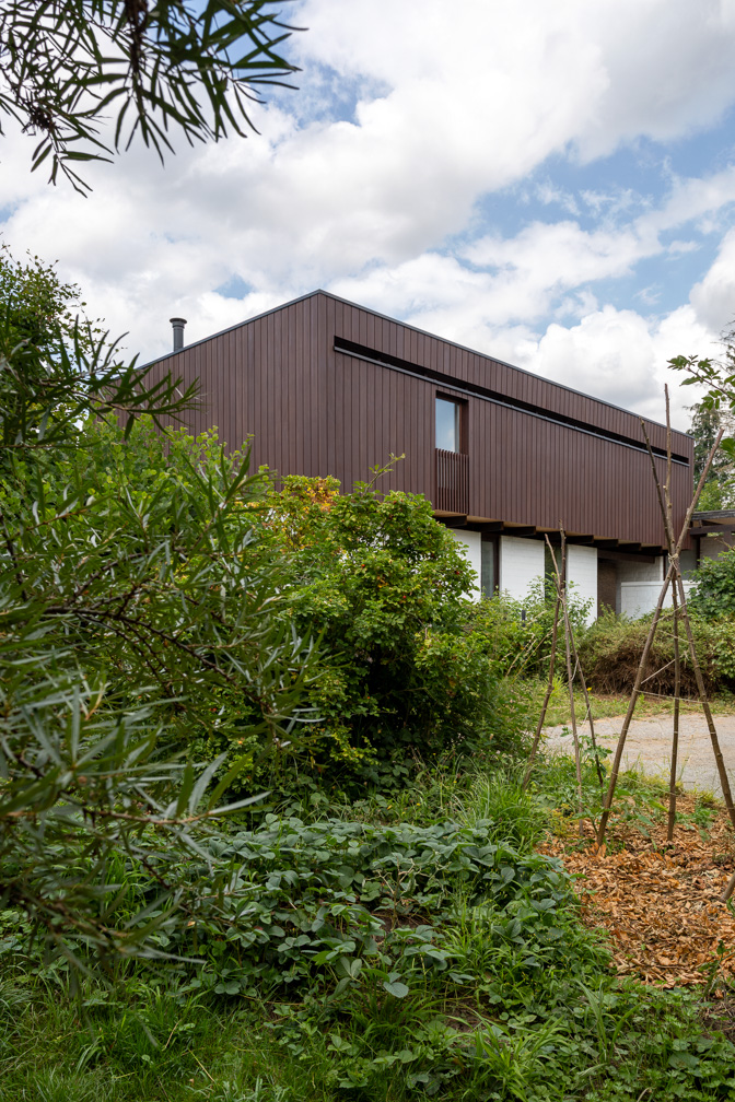 De grootste uitdaging bij deze renovatie was om een ontwerp van Louis Everaert te moderniseren zonder afbreuk te doen aan de sobere en rationele esthetiek uit 1964. Om aan de duurzaamheidseisen te voldoen, werd de buitengevel van buitenaf geïsoleerd en werd de houten gevelbekleding identiek vervangen, terwijl door een lichte verhoging van het dak op discrete wijze zonnepanelen werden geïntegreerd. Een andere belangrijke uitdaging was de functionele transformatie tot een ‘kangoeroewoning’. Het bestaande volume werd heringedeeld in twee autonome eenheden met afzonderlijke technische voorzieningen, waardoor de onafhankelijkheid van de bewoners gewaarborgd is. Ten slotte voorkomt het behoud van de tuin en het evenwicht tussen bebouwde en onbebouwde ruimte elke vorm van bodemverstoring.