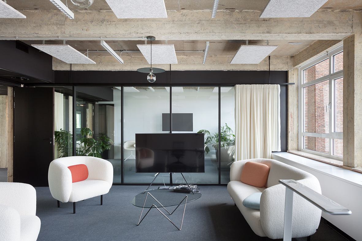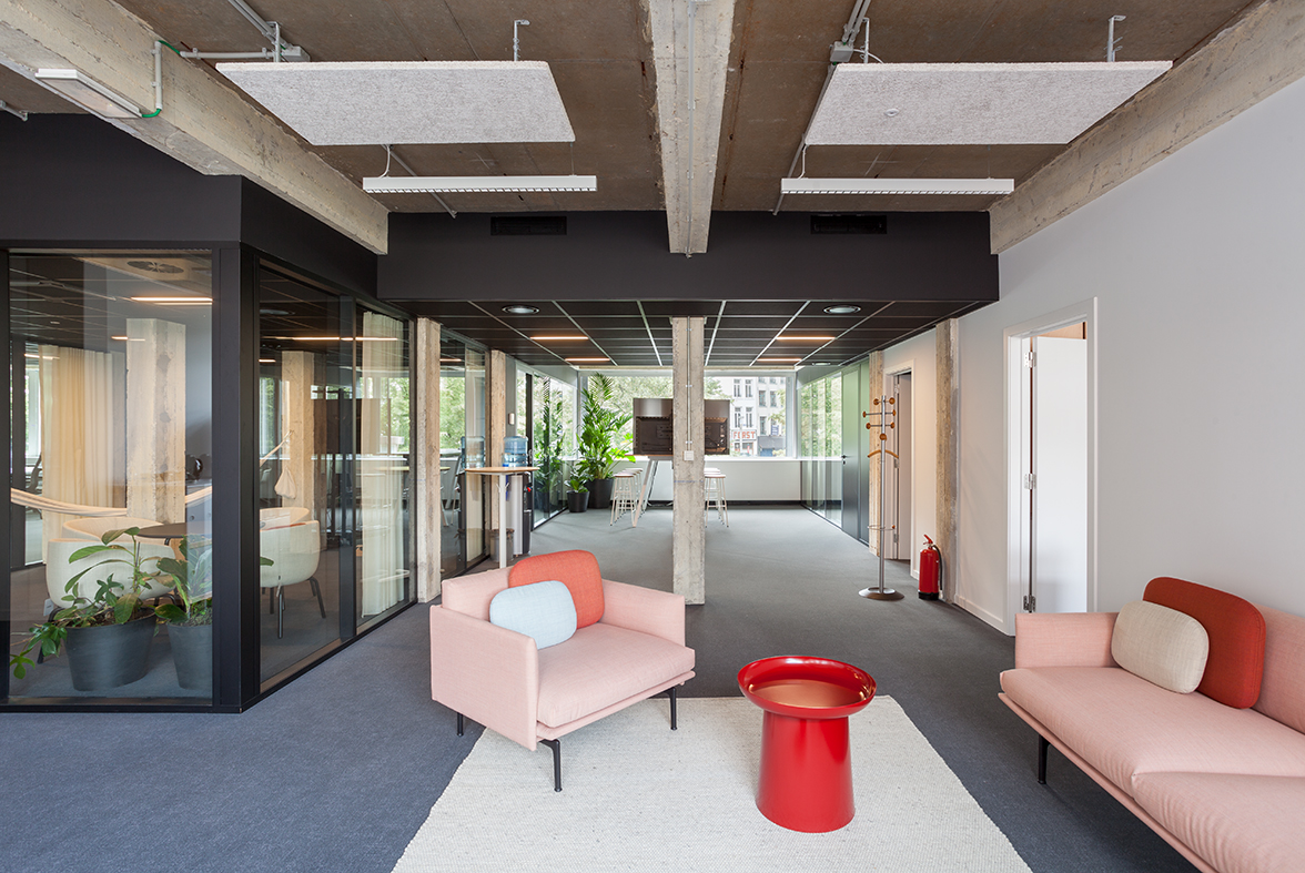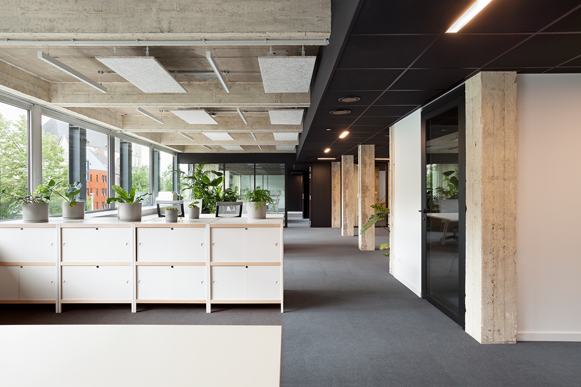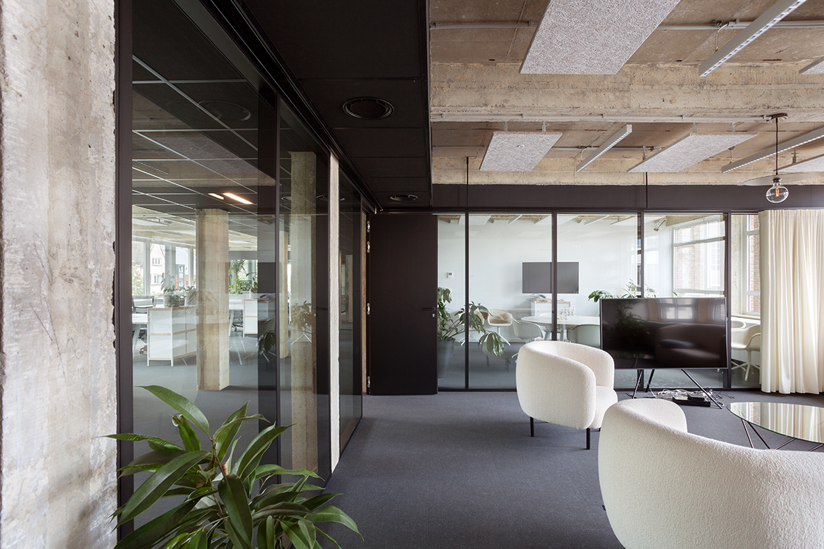 De grootste uitdaging was om het modernistische erfgoed van Maxime Brunfaut te verzoenen met de ingrijpende veranderingen in de werkwijzen na 2020. Om hierop in te spelen, hebben we de betonnen structuur blootgelegd om de verdiepingen vrij te maken, wat totale modulariteit biedt. Gezien de opkomst van telewerken en de akoestische behoeften, is de ruimte voorzien van hybride zones: telefooncellen, videoconferentieruimtes en gezellige ruimtes zoals de bar. We hebben de codes van het klassieke kantoor doorbroken door een huiselijke sfeer te creëren met hout, planten en gordijnen van gerecycled vilt. Deze architectonische aanpak legt de nadruk op vloeiende overgangen en comfort, waardoor doorgangen worden omgevormd tot ontmoetingsplekken.