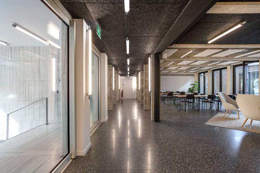 Deze modernistische renovatie is een toonbeeld van holistische duurzaamheid, waarbij het behoud van het bestaande gebouw voorop staat. Door de kolom-balkconstructie van Brunfaut bloot te leggen, maakt RESERVOIR A gebruik van de open plattegrond om ruimtelijke flexibiliteit te bieden, wat de levensduur van het gebouw garandeert met het oog op toekomstige bestemmingen. De sociale dimensie komt tot uiting in een functionele mix en een openstelling van de begane grond naar de openbare ruimte. De milieuvriendelijke en circulaire aanpak vertaalt zich in de keuze voor lokale materialen (Kewlox), gerecyclede stoffen en het hergebruik van het oude meubilair.