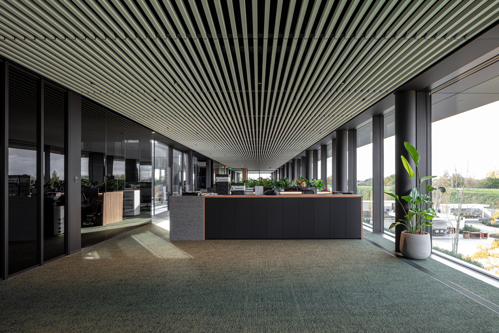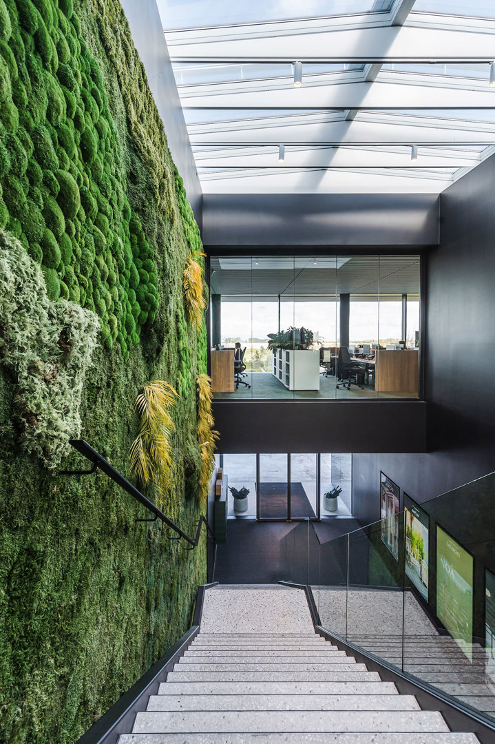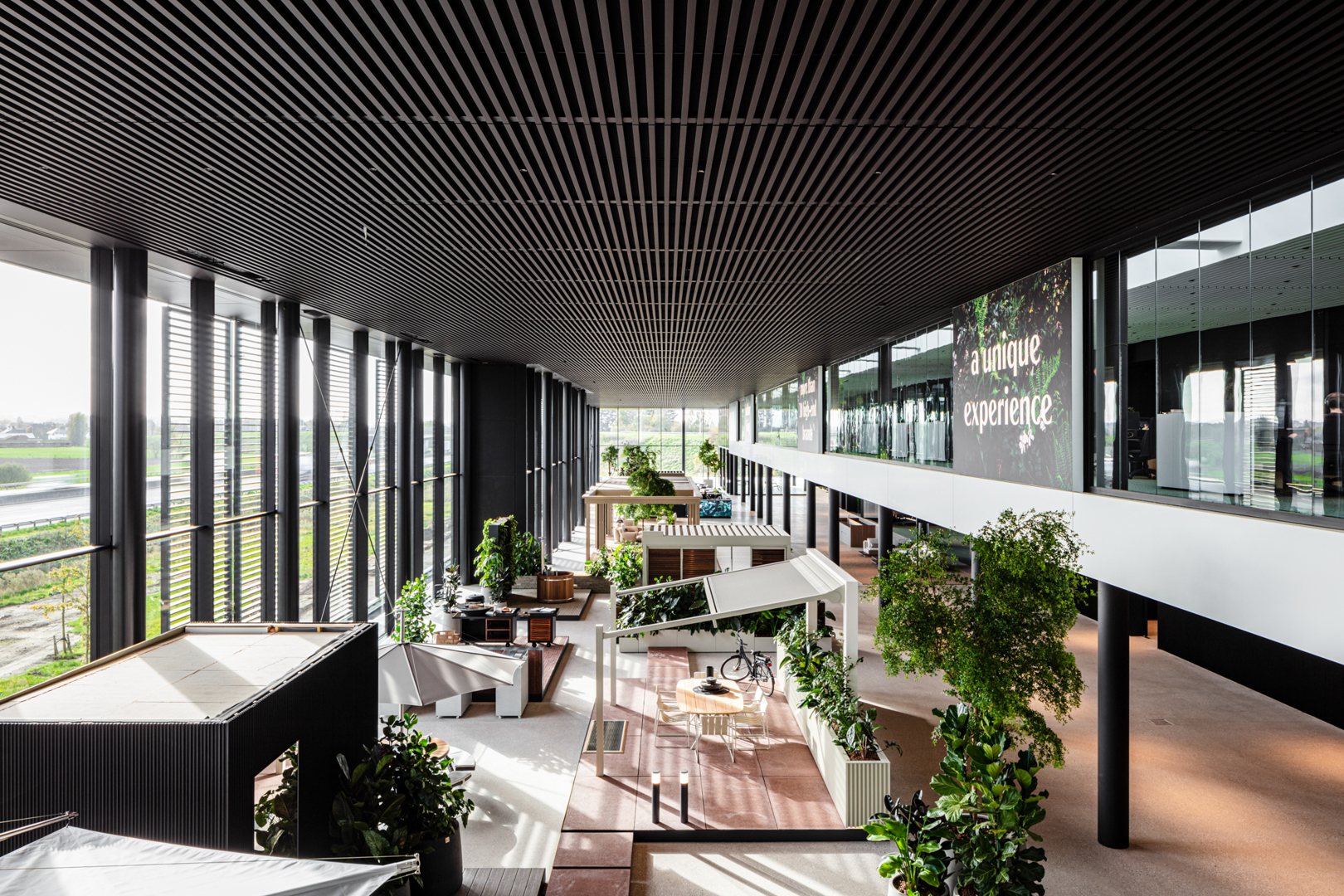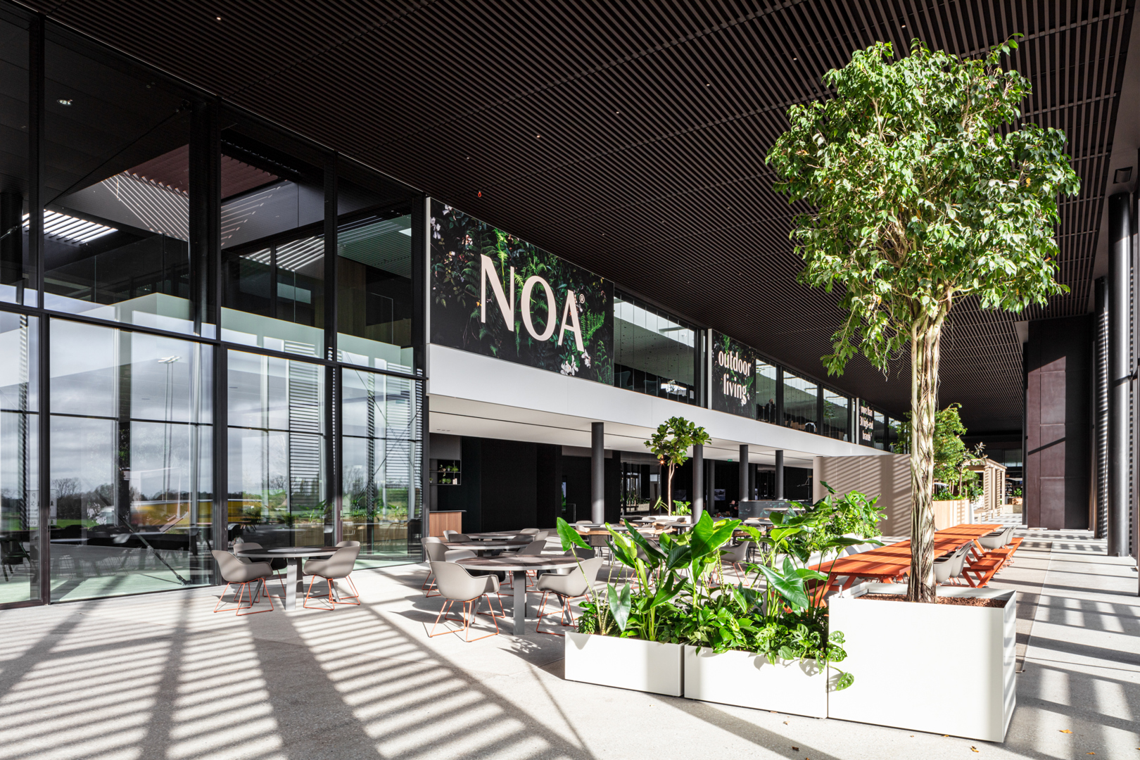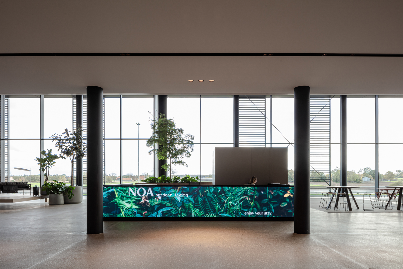 De ontwerpopdracht voor de NOA-site bestond uit het creëren van een interieurconcept dat Rensons internationale outdoor-ambities ruimtelijk en zintuiglijk vertaalt. Binnen een 380 m lange site langs de E17 moest een totaalbeleving ontstaan waarin showroom, werkplekken, onthaal, conferentiefaciliteiten en circulatie naadloos op elkaar aansluiten. Het interieur werd opgevat als een verlengde van het outdoorverhaal: open, licht, groen en sterk verbonden met de buitenruimtes. Materialiteit, zichtlijnen, scenografie en beleving stonden centraal, met als doel een inspirerende omgeving te creëren die zowel bezoekers als medewerkers onderdompelt in de wereld van buitenleven, design en innovatie.