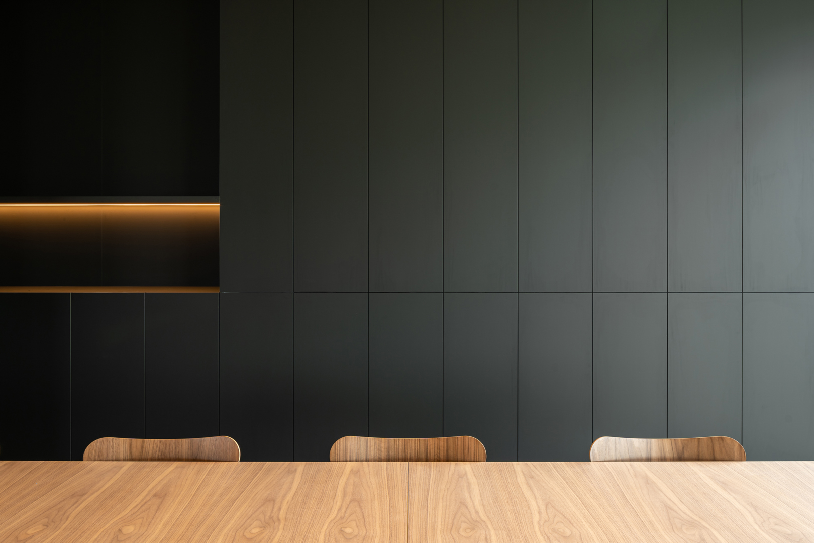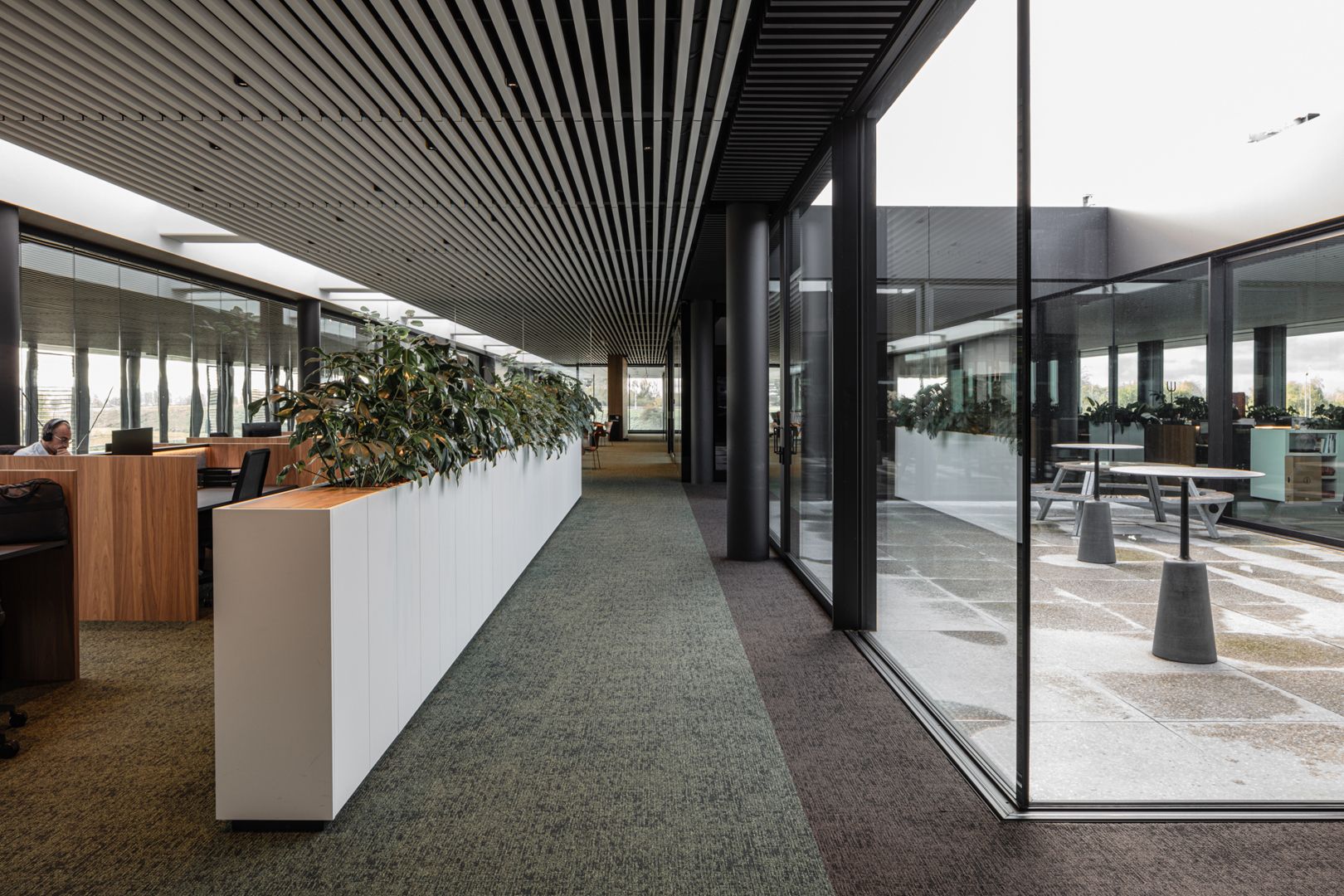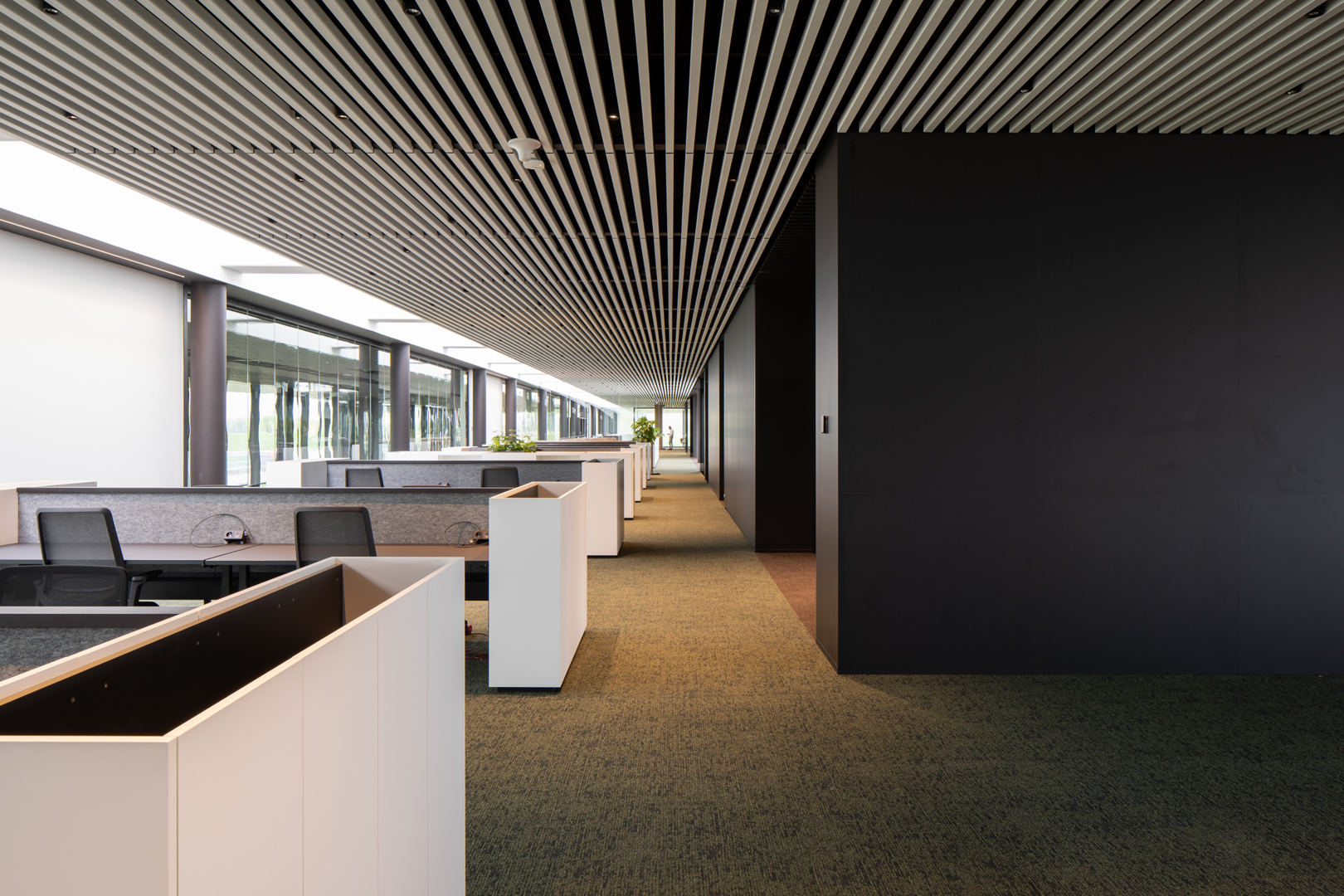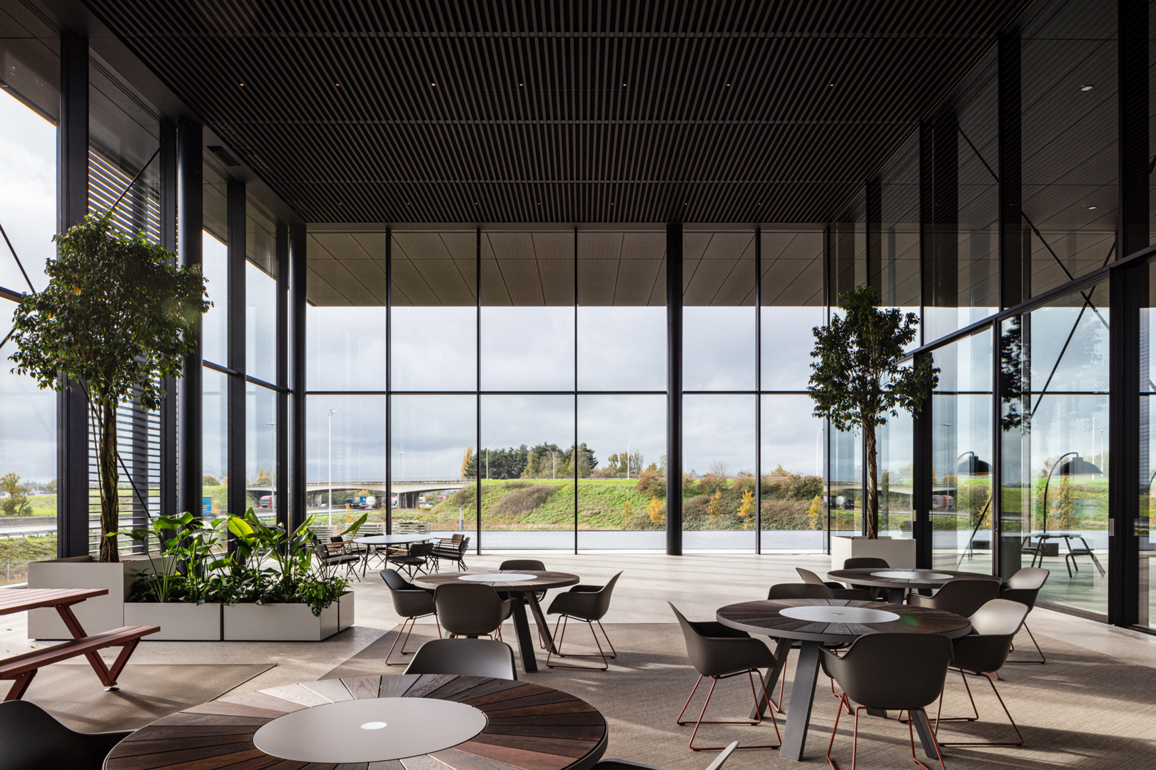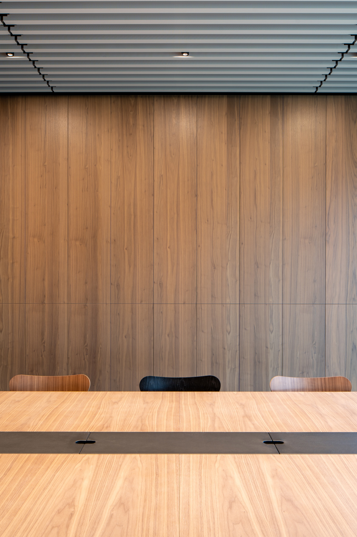 De grootste uitdaging was om een 380 m lange site met uiteenlopende functies te laten aanvoelen als één samenhangende interieurbeleving. Showroom, werkplekken, onthaal, meeting- en conferentiezones moesten niet alleen functioneel op elkaar aansluiten, maar ook een consistente merk- en ruimtebeleving uitdragen. Daarnaast vroeg de sterke relatie tussen binnen en buiten om een interieur dat evenveel landschappelijk als architecturaal werkt. Hierop werd geantwoord met een doordachte scenografie, heldere circulatie, sterke zichtlijnen en een zorgvuldig afgestemde materialisatie. Zo ontstond een interieur dat tegelijk inspirerend, gebruiksvriendelijk en representatief is voor Rensons outdoor-DNA.
