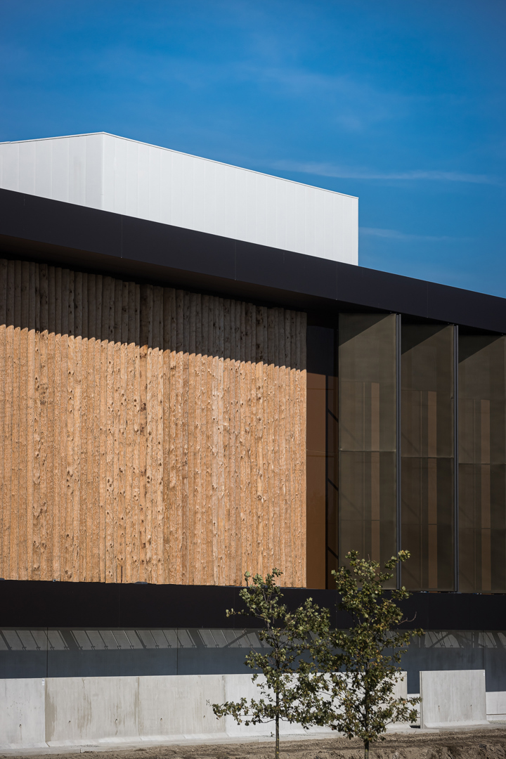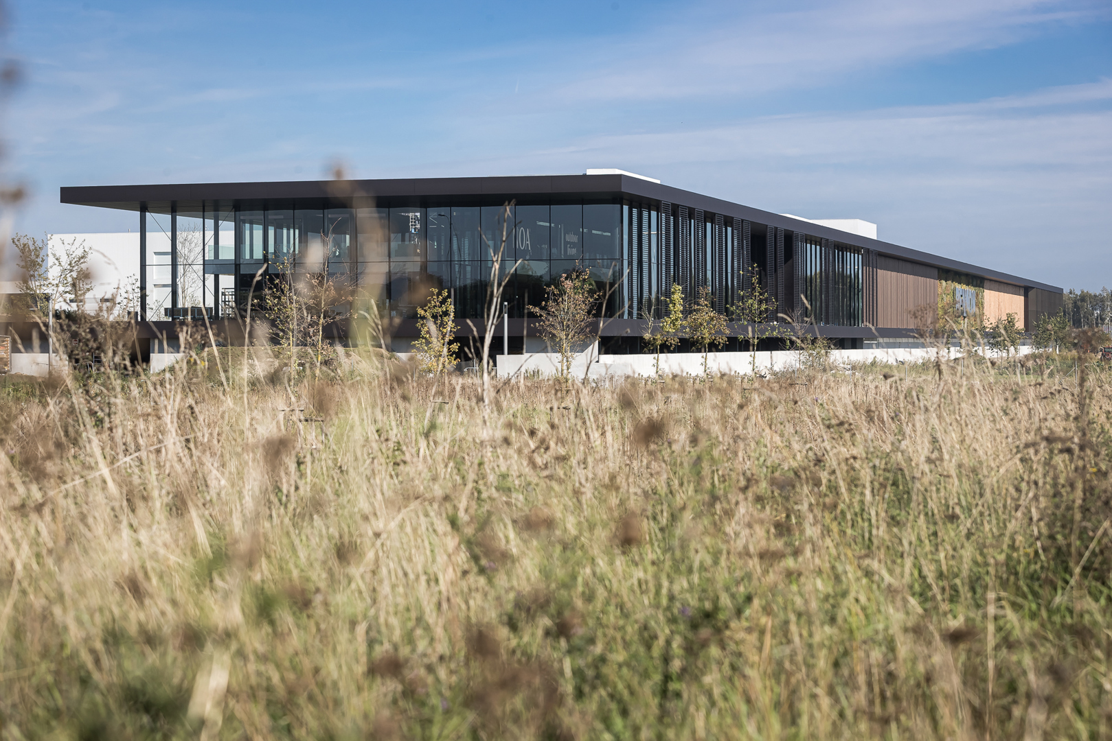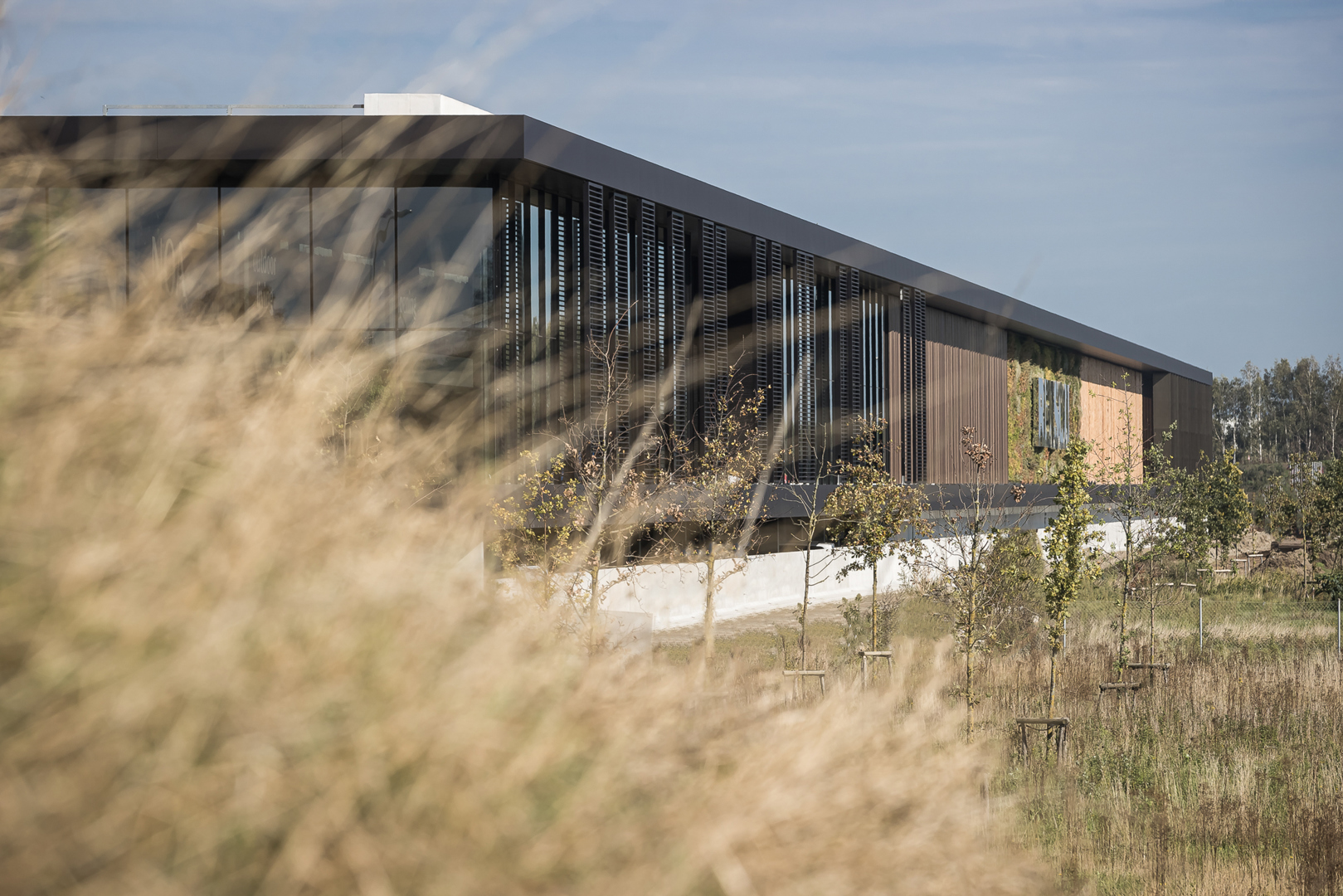 De NOA-site, bijna 380 m lang en zichtbaar vanaf de E17, vroeg coördinatie van vijf geveldelen: showroom, golvende gevel, groengevel, stammengevel en vouwpanelen. Elk deel vereiste apart ontwerp, productie en montage, van stalen gordijngevels tot lokaal hout. Technische uitdagingen zoals betonkernactivering, ventilatiesysteem C, airdeck-integratie en toleranties tussen industriële ruwbouw en hoogwaardige afwerking werden opgelost via precieze engineering, losmaakbare verbindingen, drone-gecontroleerde montage en gescheiden aannemingsformules met vier leveranciers buitenschrijnwerk.