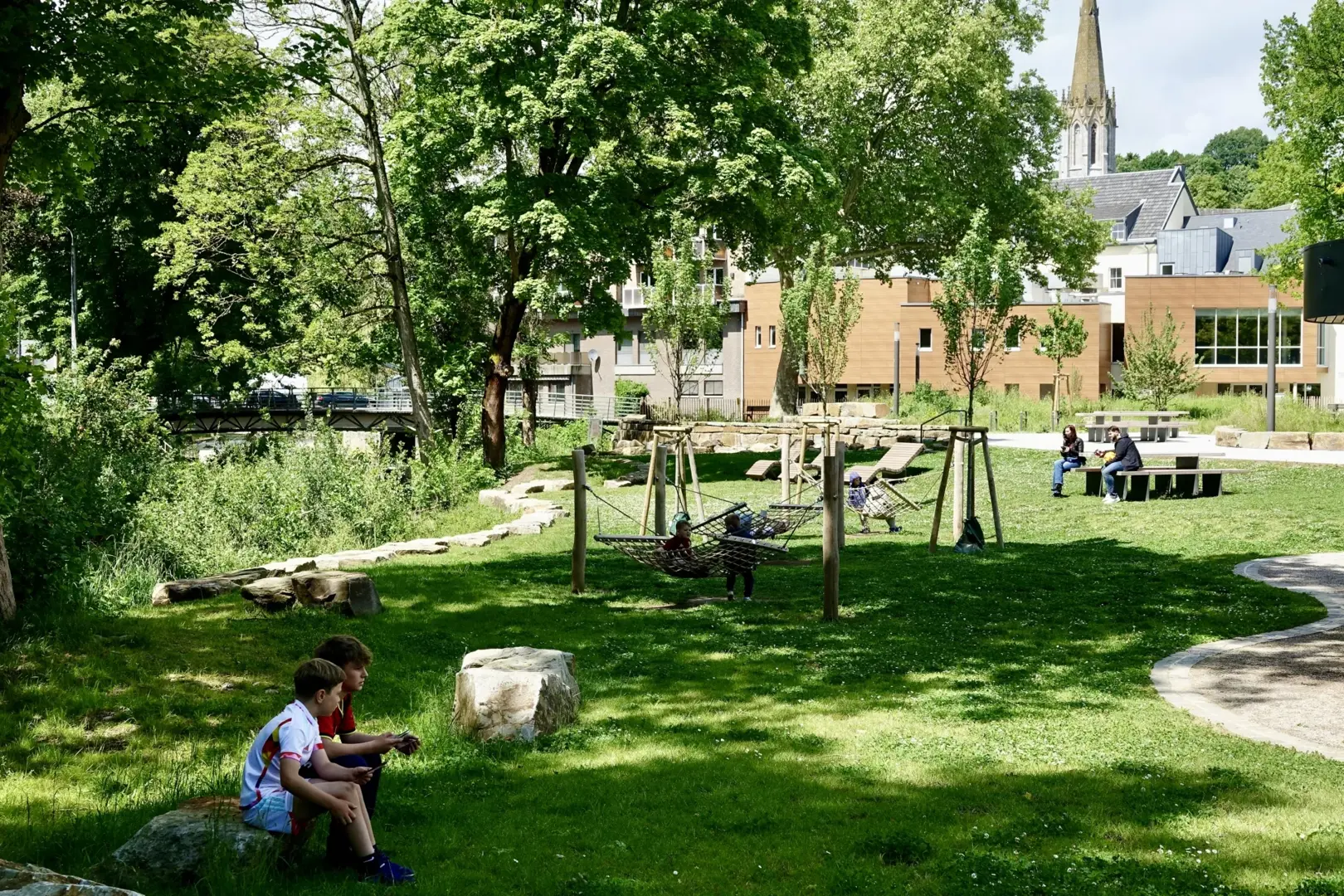 Het project houdt in dat een strategische locatie gelegen aan de samenvloeiing van de Vesder en de Helle in Eupen, die zwaar werd getroffen door de overstromingen van 2021, wordt herkwalificeerd tot een natuurpark. De ontwerpopdracht is om een verhard gebied te transformeren tot een multifunctionele, veerkrachtige ruimte die geïntegreerd is in zijn omgeving. Geselecteerd door het Waals Gewest in het kader van de strijd tegen klimaatverandering, omvat het demeniralisatie, renaturatie, vergroening, oppervlaktewaterbeheer en het creëren van schaduwzones. Het project bevordert biodiversiteit, zachte mobiliteit en intergenerationeel gebruik. Het draagt ook bij aan het herstel van ecologische en landschappelijke continuïteit op stadsniveau.