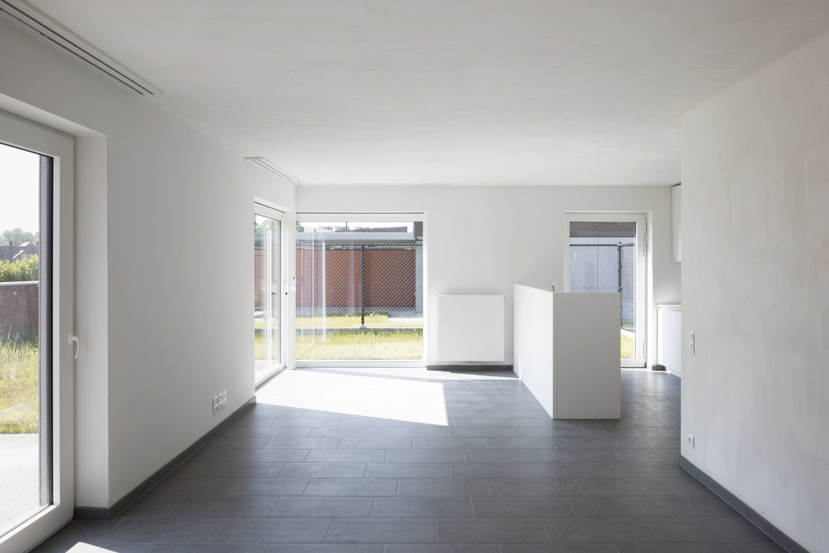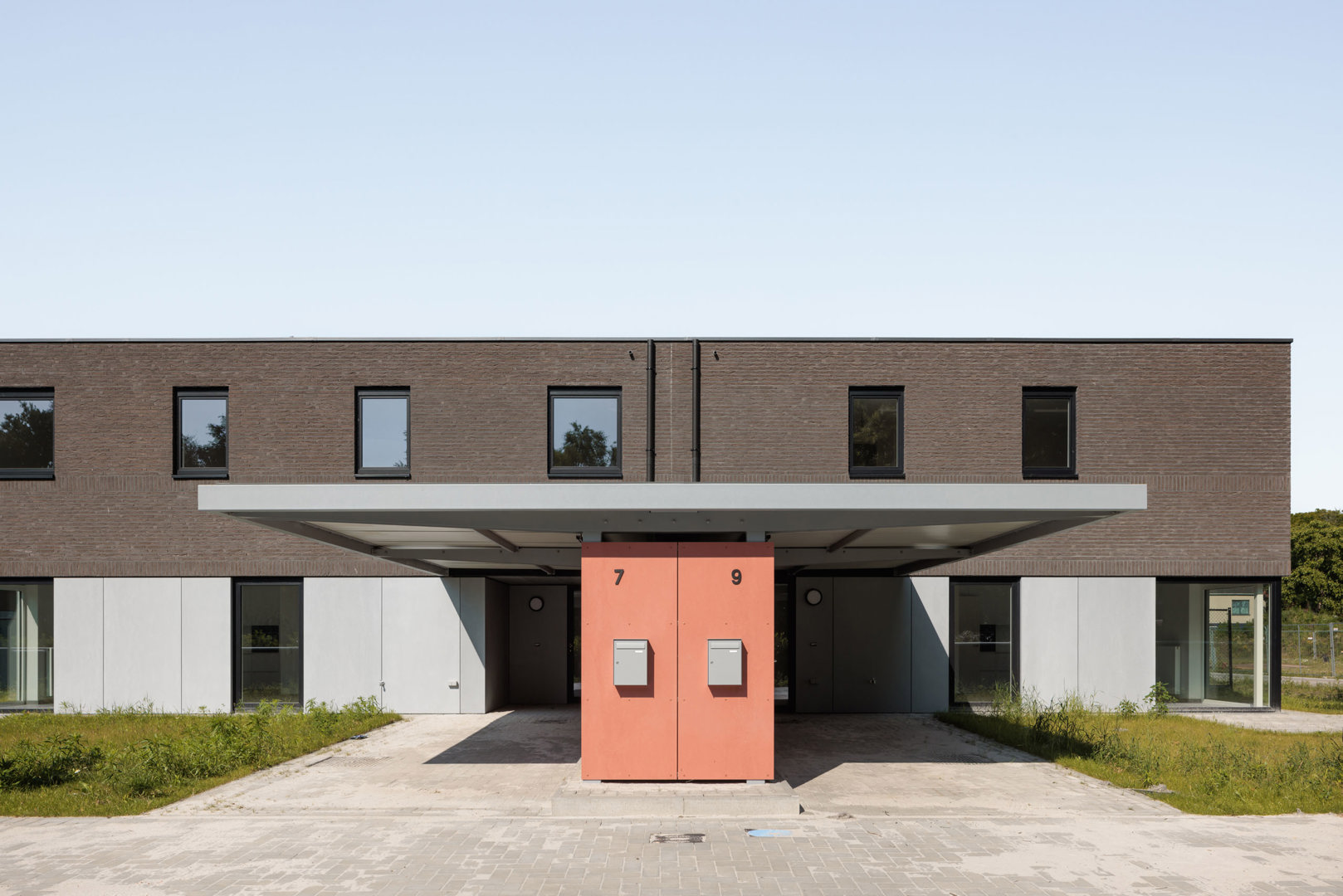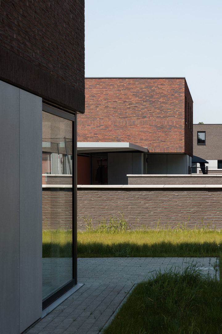 De belangrijkste uitdaging lag in het combineren van densiteit, betaalbaarheid en woonkwaliteit binnen een landschappelijke context. Door woningen te clusteren in acht compacte volumes ontstaat een efficiënte bebouwing met een bemiddelende korrel, terwijl grote delen van het terrein open en doorwaadbaar blijven. De woningen worden rug aan rug georganiseerd rond dienende kernen, waardoor leefruimtes steeds twee oriëntaties krijgen en maximaal profiteren van daglicht en uitzicht. De private buitenruimtes worden opgevat als ‘buitenkamers’ rond de clusters, afgebakend met hagen en claustra-muren. Zo ontstaat een helder en rationeel systeem dat tegelijk flexibiliteit, privacy en een sterke relatie met het landschap garandeert.