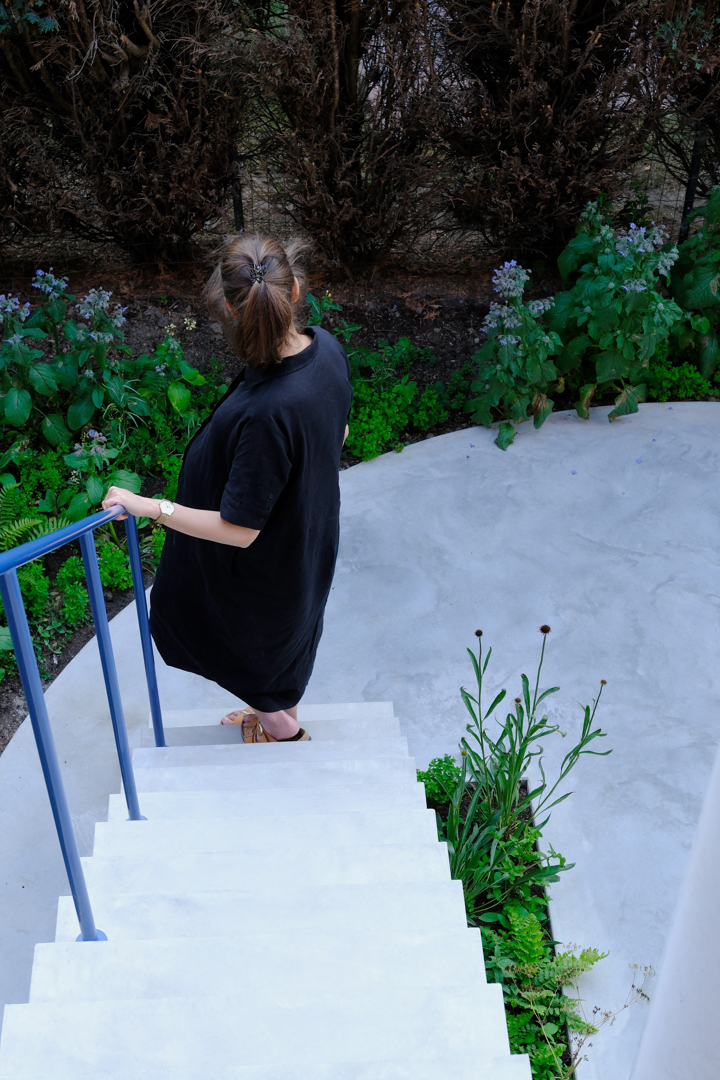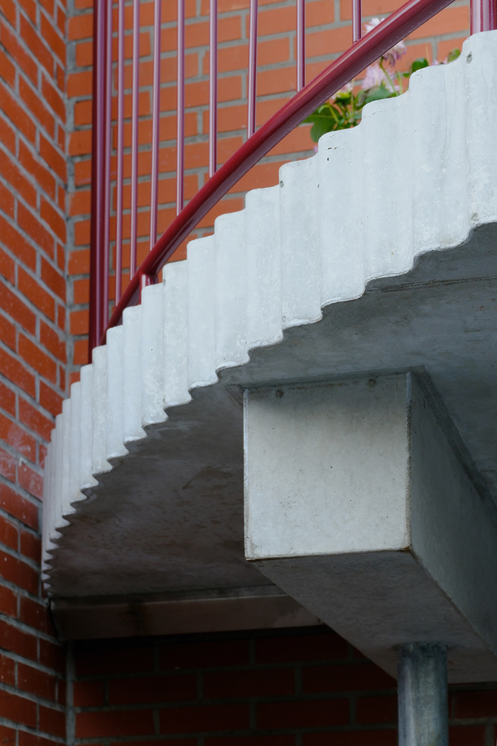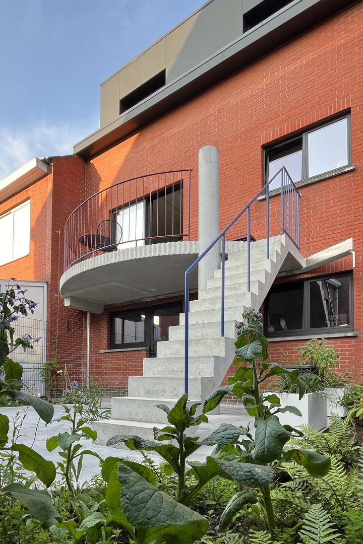 De uitdaging zat erin om op beperkte ruimte twee complementaire buitenplekken te creëren die elkaar versterken. De compositie is zorgvuldig: een halfrond balkon treedt via een strakke steektrap in dialoog met het ronde terras beneden. De constructie is de architectuur – een slanke gegalvaniseerde kolom ondersteunt een betonnen console en vormt zo een tegengewicht voor de massieve betonnen zuil. Geribbelde randen accentueren de speelsheid van het ontwerp en tonen de veelzijdigheid van beton. Kleurrijke balustrades brengen het geheel in harmonie met de bestaande, felrode achtergevel.