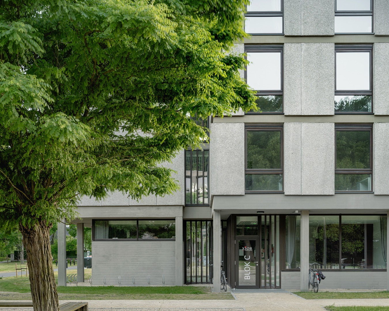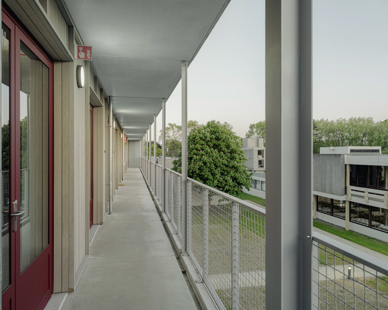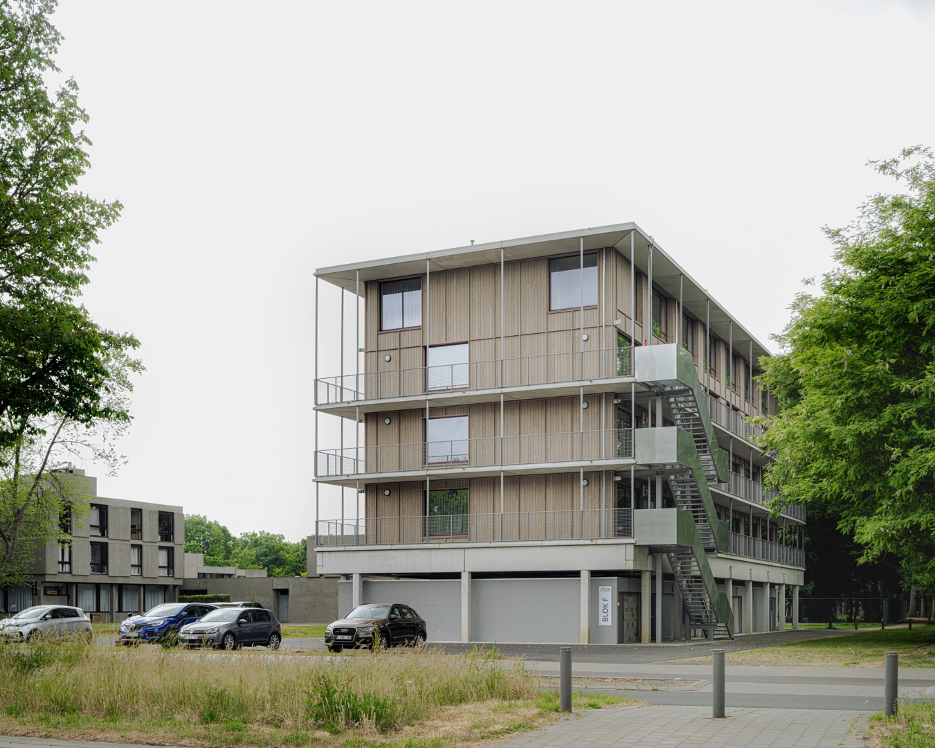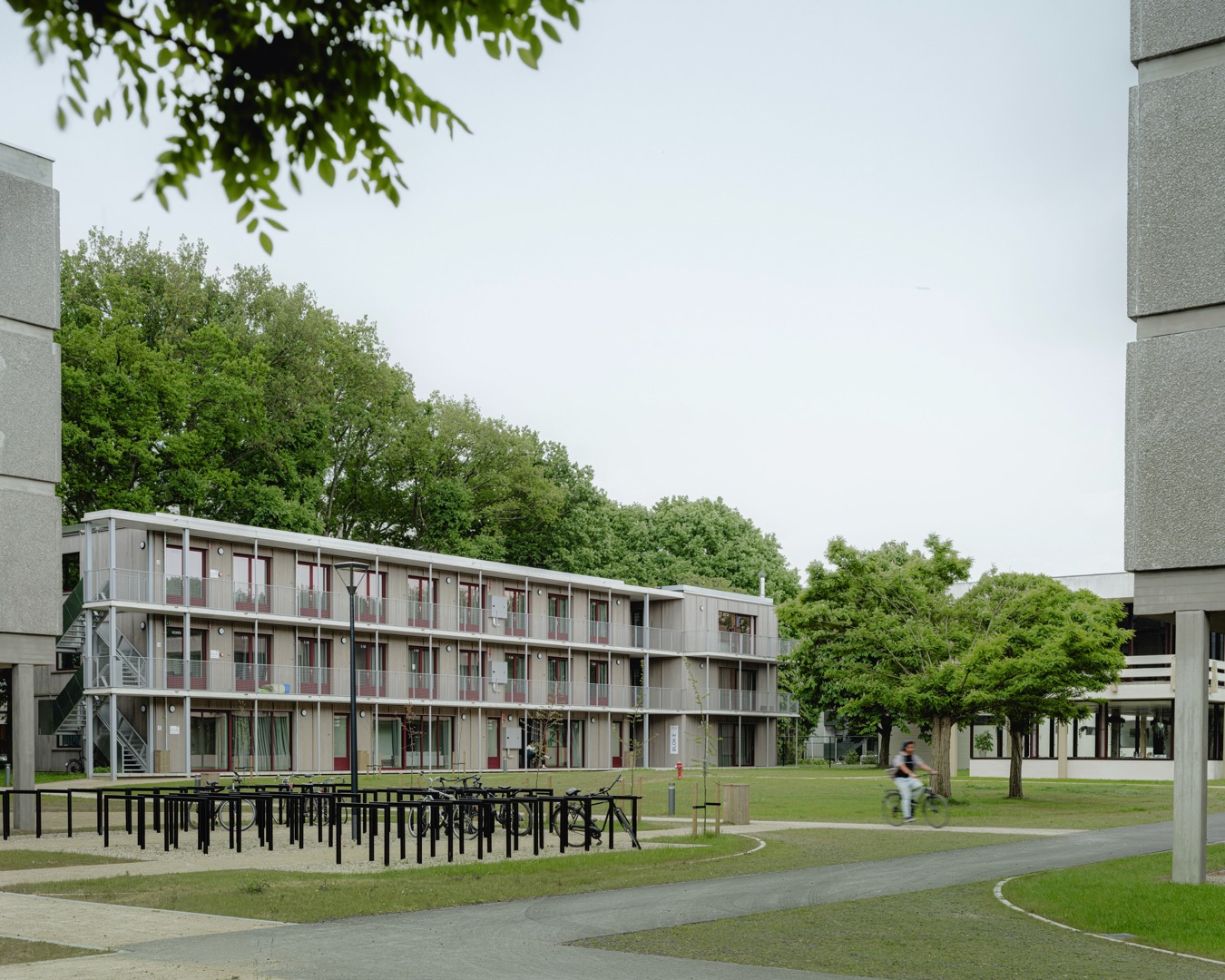 De hoofduitdaging was verdichten zonder de open, harmonieuze paviljoenstructuur van Felix te doorbreken. We vertrokken vanuit zijn "constructieve eerlijkheid": de historische structuur primeert, nieuw sanitair kwam als lichte 'plug-ins'. Een tweede uitdaging was bouwen in een fragiel landschap. Daarom is gebouw F ontworpen als optopping op een bestaande garage, en gebouw E ingebed langs een bomendreef. Waar de circulatie in de oorspronkelijke paviljoenen intern verloopt, keren de nieuwe toevoegingen dit principe bewust om. De circulatie wordt geëxternaliseerd via collectieve passerelles, wat de relatie tussen het studentenleven en de omringende natuur fundamenteel versterkt en een gediversifieerd woonaanbod creëert.