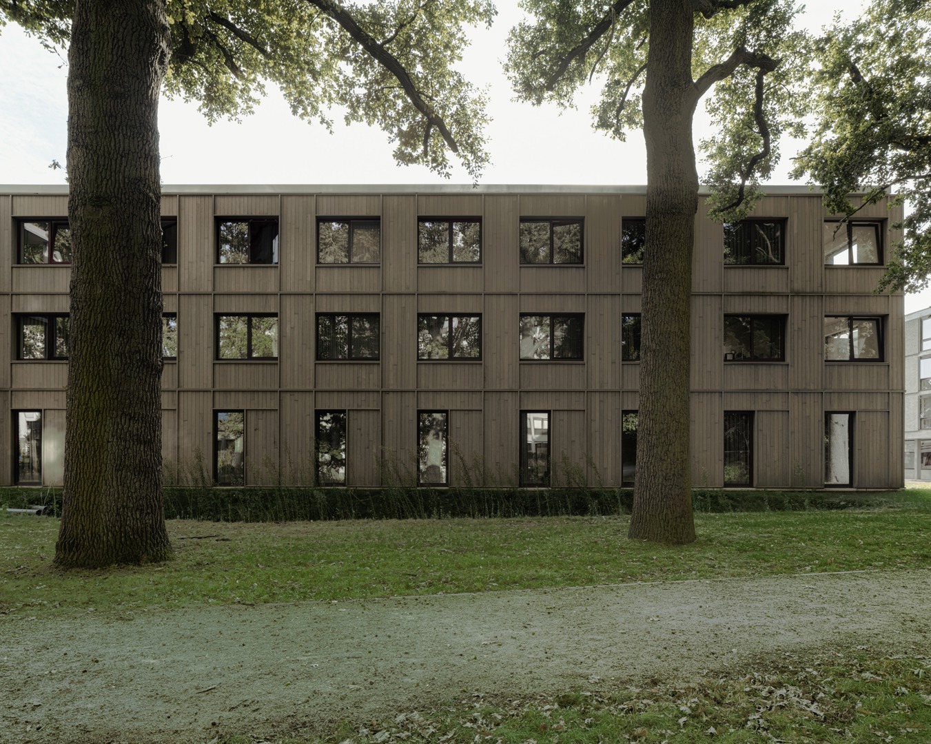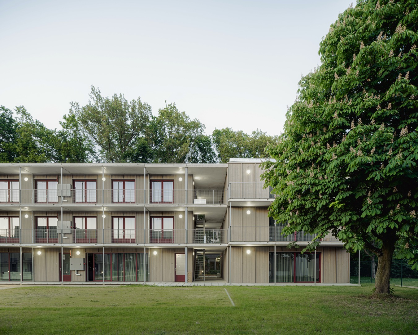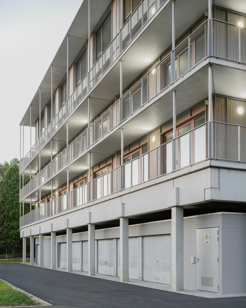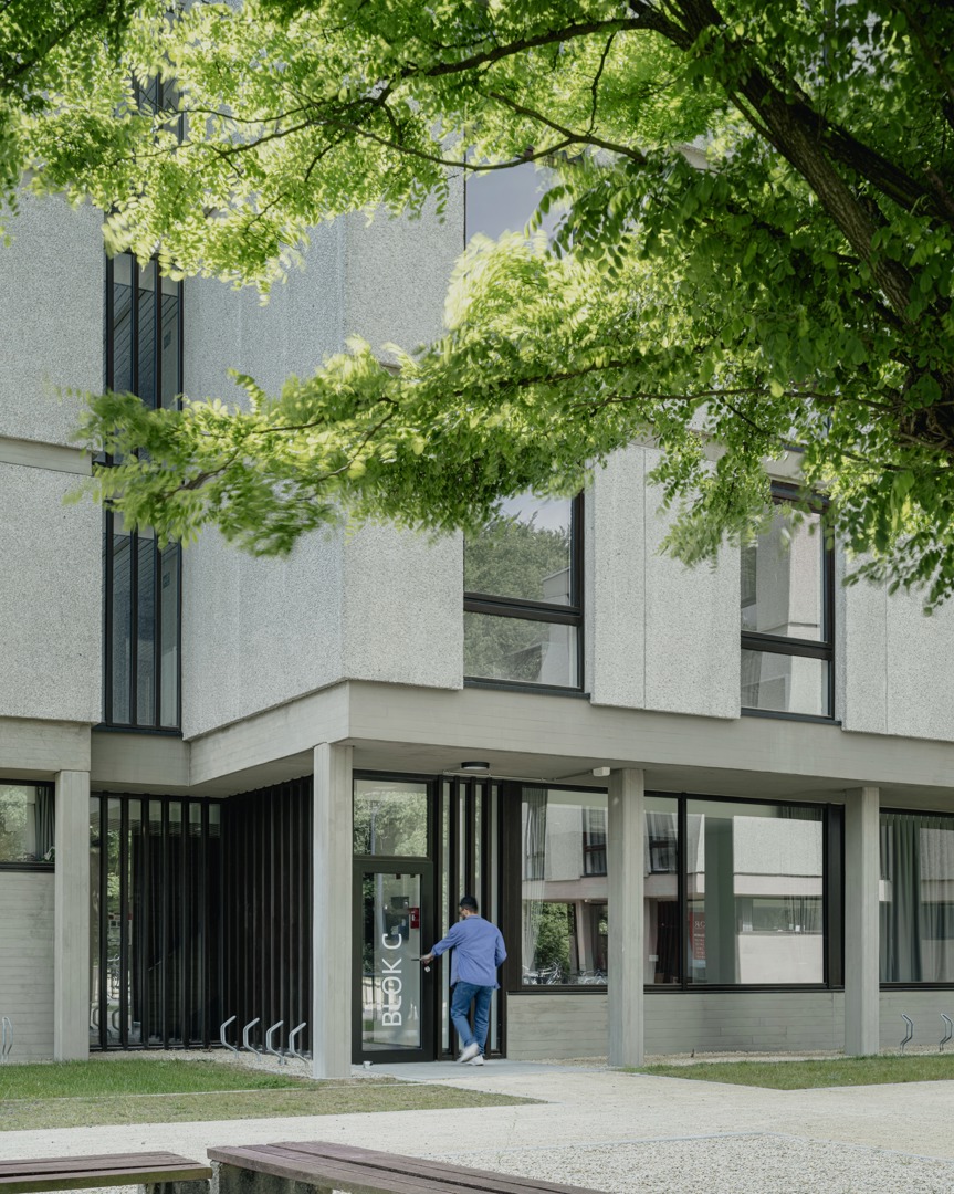 De hoofduitdaging was verdichten zonder de open, harmonieuze paviljoenstructuur van Felix te doorbreken. We vertrokken vanuit zijn "constructieve eerlijkheid": de historische structuur primeert, nieuw sanitair kwam als lichte 'plug-ins'. Een tweede uitdaging was bouwen in een fragiel landschap. Daarom is gebouw F ontworpen als optopping op een bestaande garage, en gebouw E ingebed langs een bomendreef. Waar de circulatie in de oorspronkelijke paviljoenen intern verloopt, keren de nieuwe toevoegingen dit principe bewust om. De circulatie wordt geëxternaliseerd via collectieve passerelles, wat de relatie tussen het studentenleven en de omringende natuur fundamenteel versterkt en een gediversifieerd woonaanbod creëert.