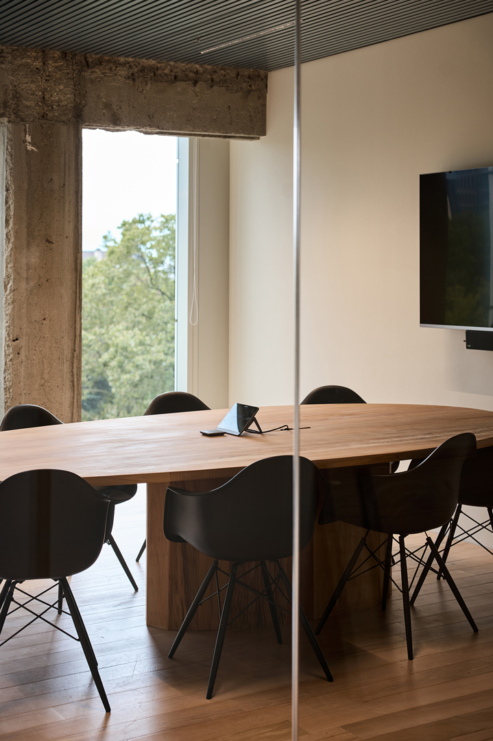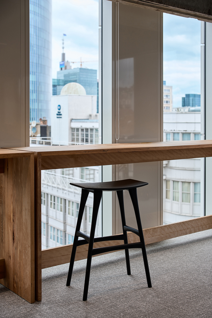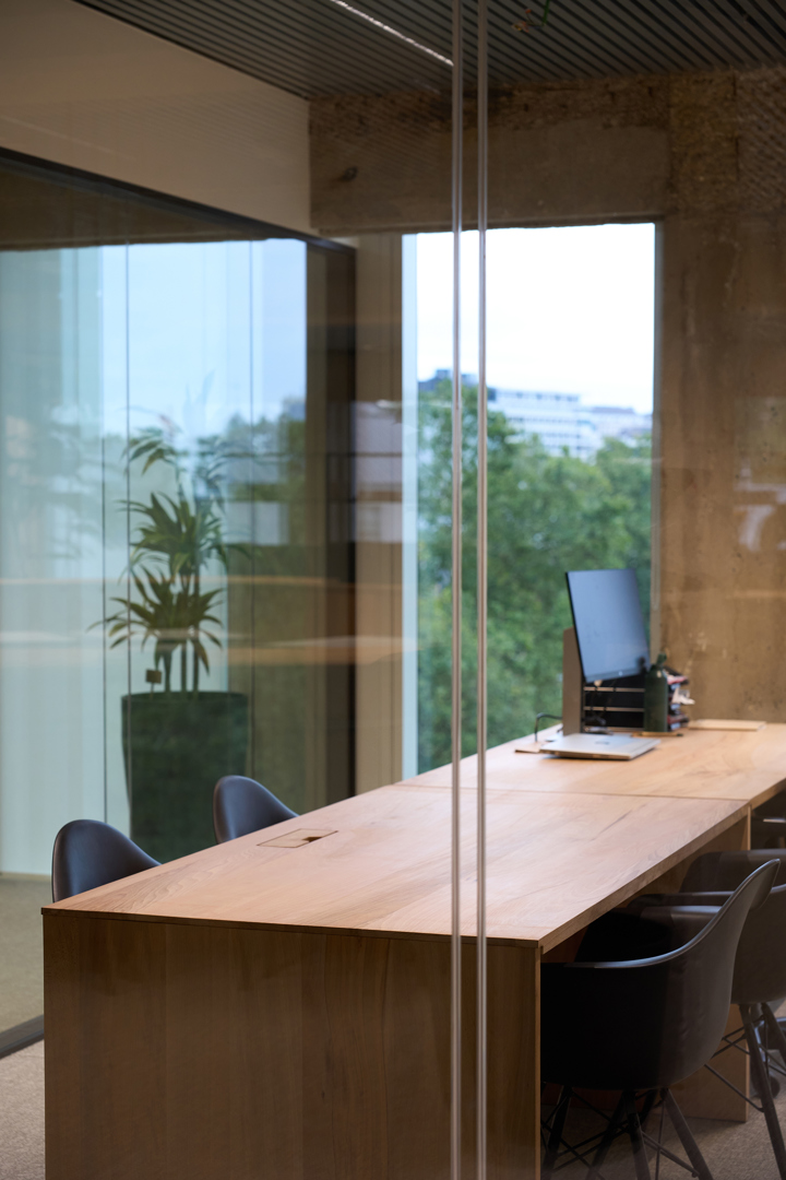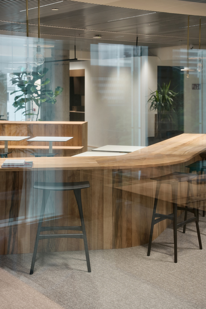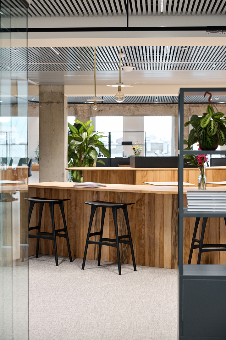 Doel was duurzaamheidsambities te vertalen zonder in te boeten aan ruimtelijke kwaliteit & gebruikservaring. Uitgangspunt: gezellige maar professionele activity-based werkomgeving waarin welzijn, flexibiliteit & circulariteit centraal staan. WELL-principes akoestiek, licht, voeding & mentale gezondheid zijn geïntegreerd in een concept dat inspeelt op hedendaagse werkvormen. Een open kern faciliteert ontmoeting, overleg, presentaties en flexibel werken. Daarrond diverse werkzones; stille werkplekken; bureaus, informele overlegplekken en phone booths. Strategisch geplaatste volumes zorgen voor zonering in geluidsniveaus. Werkplekken langs de gevel maximaliseren toegang tot daglicht. Een nap room, hoogwaardige akoestiek, gezonde luchtkwaliteit en groen dragen bij aan een gezonde werkomgeving