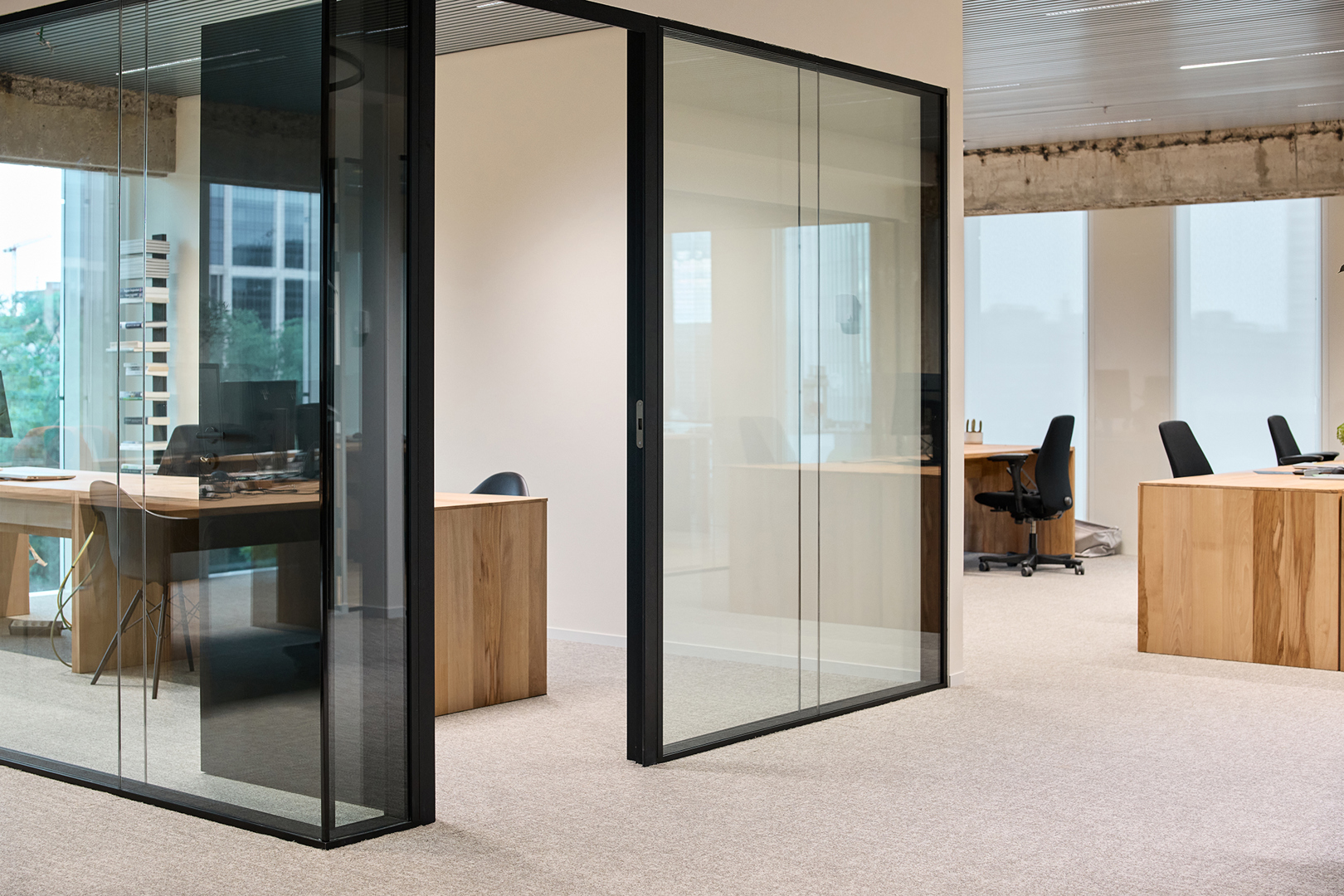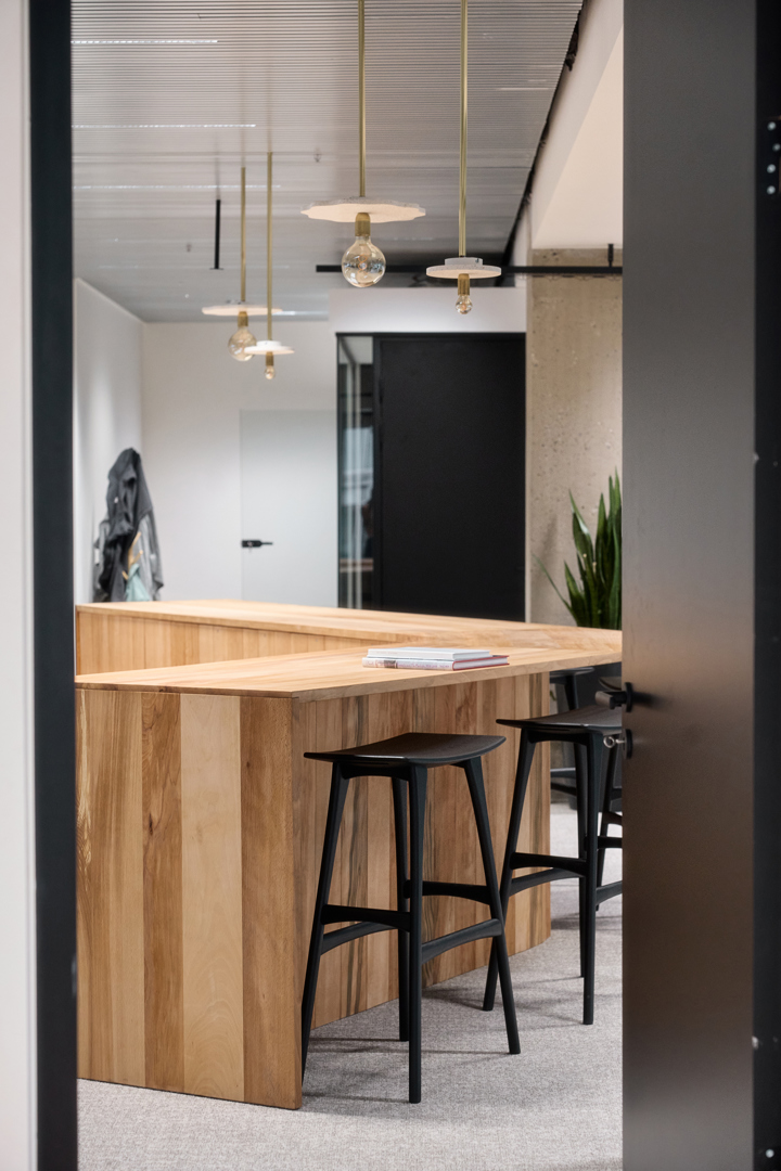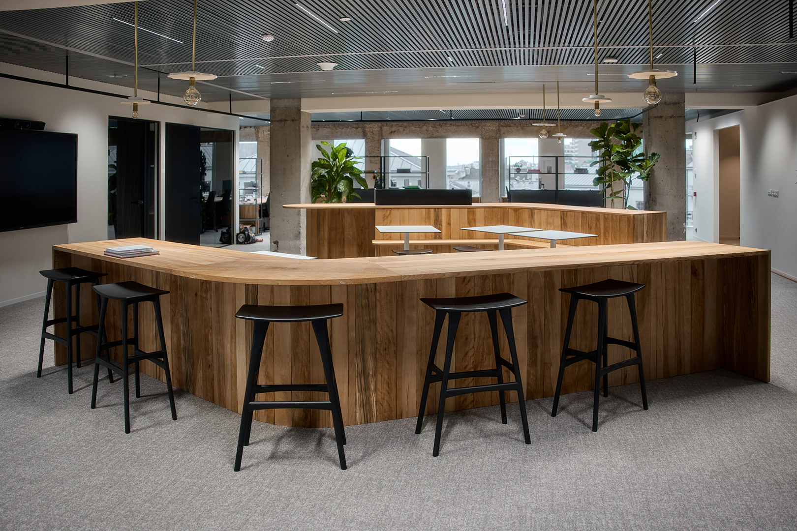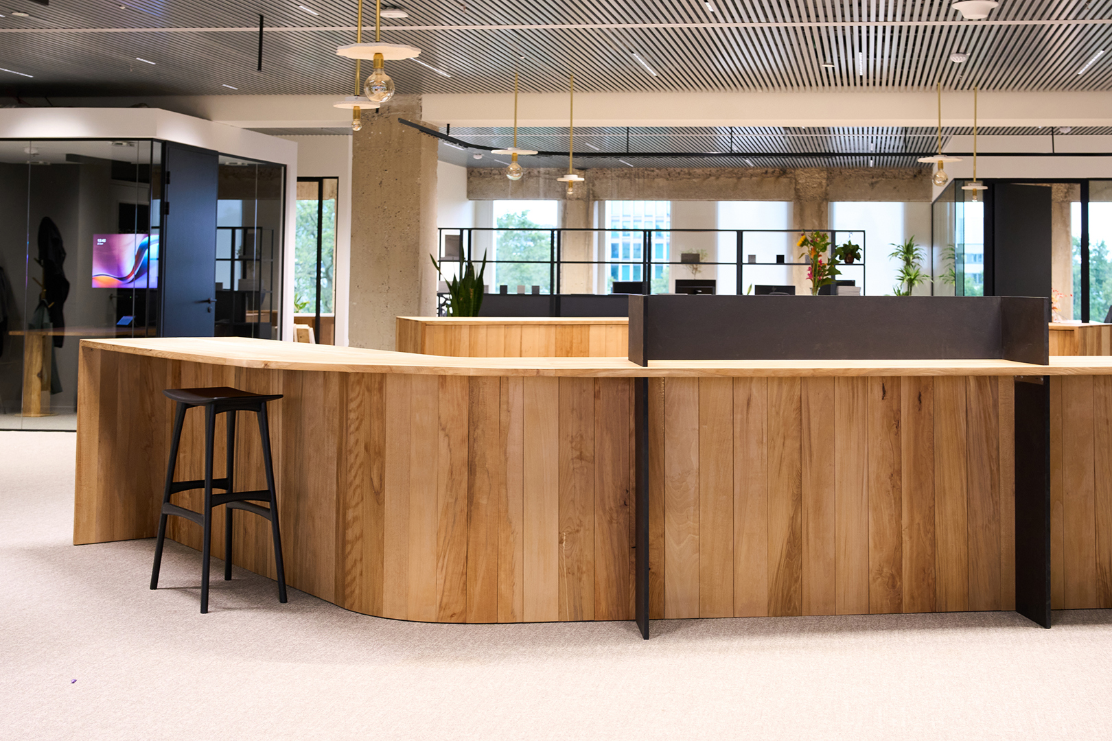 Doel was duurzaamheidsambities te vertalen zonder in te boeten aan ruimtelijke kwaliteit & gebruikservaring. Uitgangspunt: gezellige maar professionele activity-based werkomgeving waarin welzijn, flexibiliteit & circulariteit centraal staan. WELL-principes akoestiek, licht, voeding & mentale gezondheid zijn geïntegreerd in een concept dat inspeelt op hedendaagse werkvormen. Een open kern faciliteert ontmoeting, overleg, presentaties en flexibel werken. Daarrond diverse werkzones; stille werkplekken; bureaus, informele overlegplekken en phone booths. Strategisch geplaatste volumes zorgen voor zonering in geluidsniveaus. Werkplekken langs de gevel maximaliseren toegang tot daglicht. Een nap room, hoogwaardige akoestiek, gezonde luchtkwaliteit en groen dragen bij aan een gezonde werkomgeving