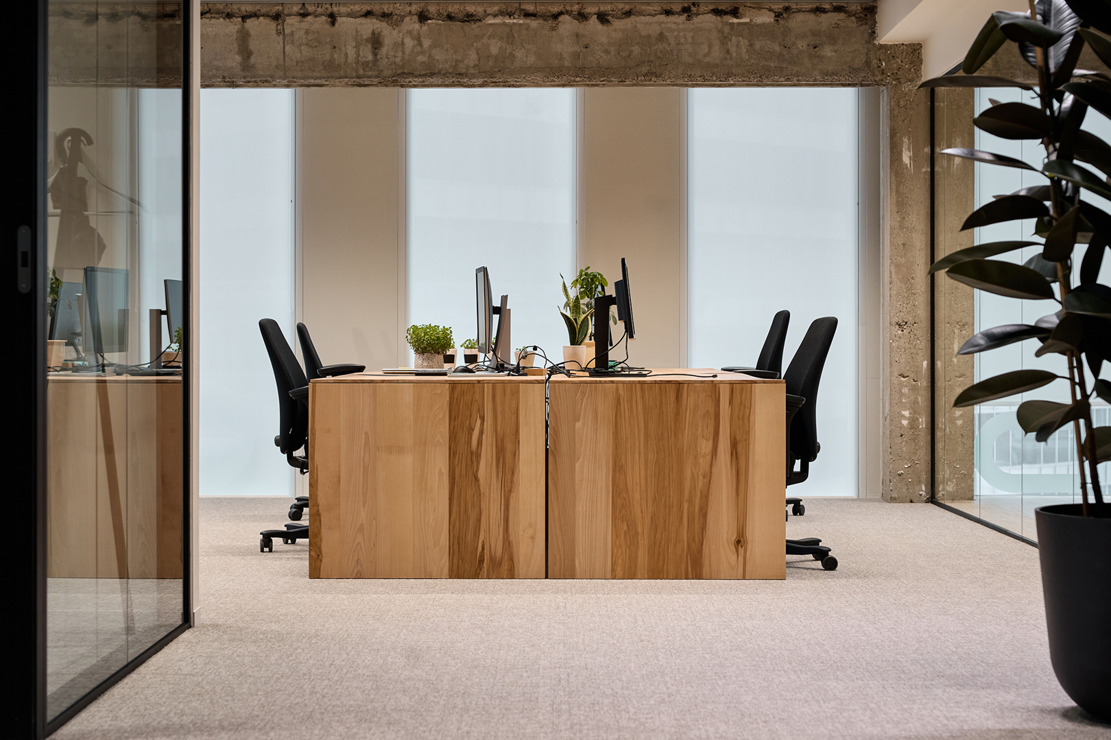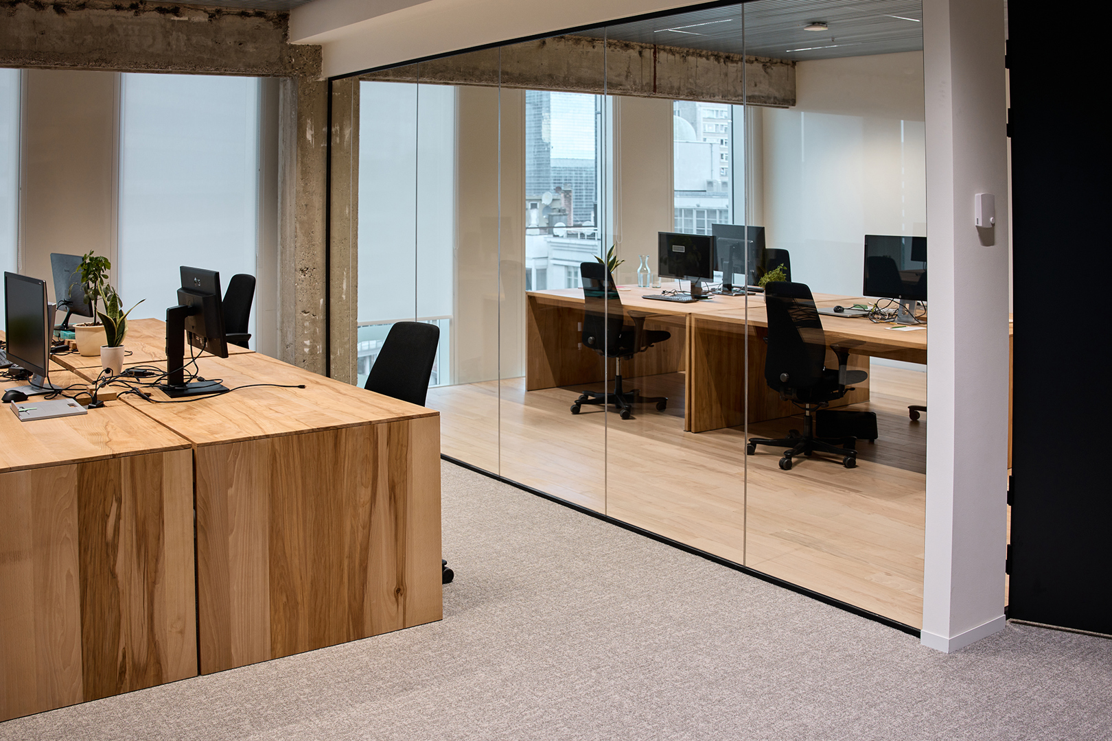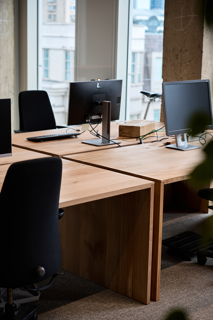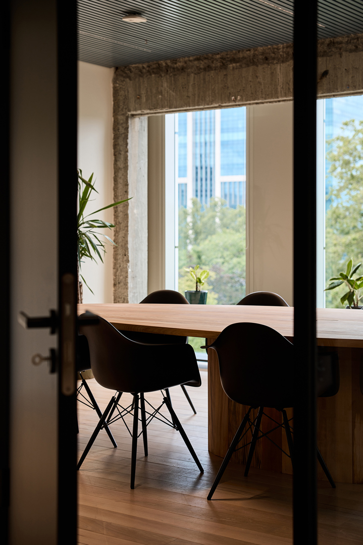 Practice what you preach – De opdracht van B2Ai interior design bestond uit het ontwerpen van een kantooromgeving voor SuReal binnen de bestaande structuur van de herbestemde IBM-toren in Brussel. (Als duurzaamheidsconsultant voor deze opdracht geen toevallige keuze). SuReal ondersteunt bedrijven en overheden in het verduurzamen van gebouwen, stadsprojecten en organisaties, met een sterke focus op het welzijn van gebruikers. Vanuit die expertise, en hun rol in het begeleiden van duurzaamheid, circulariteit en bredere ESG-vraagstukken, lag de ambitie hoog: een werkplek ontwerpen die SuReals duurzaamheidsvisie tastbaar maakt en hun adviesprincipes vertaalt naar de praktijk. Geen greenwashing of oppervlakkige ingrepen, maar realistische en toekomstgerichte keuzes met maatschappelijke impact.
