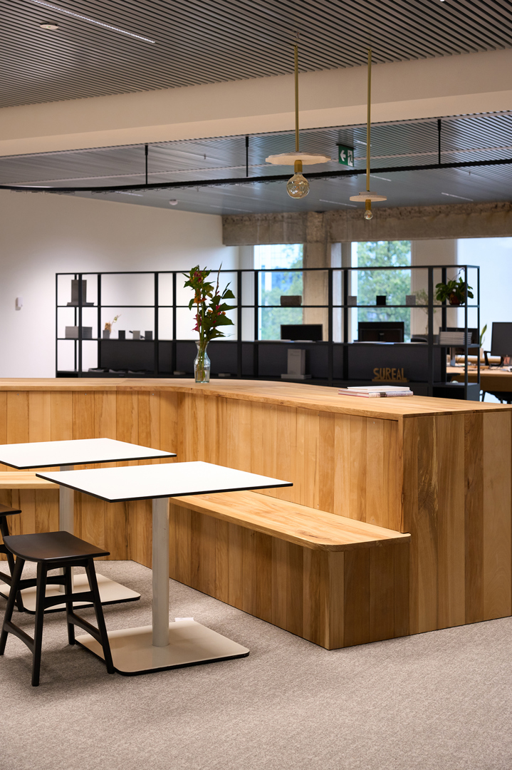 Het personeel werd actief betrokken in het ontwerpproces, waardoor de werkplek aansluit bij hun noden. Open werklandschappen zijn bewust kleinschalig om focus te bevorderen. Strategisch geplaatste, akoestisch afgesloten ruimtes fungeren als bufferzones. Elementen zoals een ‘nap room’, standing desks, kwalitatieve akoestiek, gezonde luchtkwaliteit en visuele connecties met groen dragen bij aan een werkomgeving die zowel fysiek als mentaal ondersteunend is. “Alle bezoekers hebben steeds een WAUW effect. “Hier zou ik ook wel willen werken” Zelf ben ik dankzij dit kantoor een ‘kantoormus’ geworden ipv een huismus. Niet alle collega’s nemen hun thuiswerkdag omdat het op kantoor zo aangenaam is. En dat niet alleen tijdens hittegolven” Filip Grillet, Operations manager, founding partner SuReal