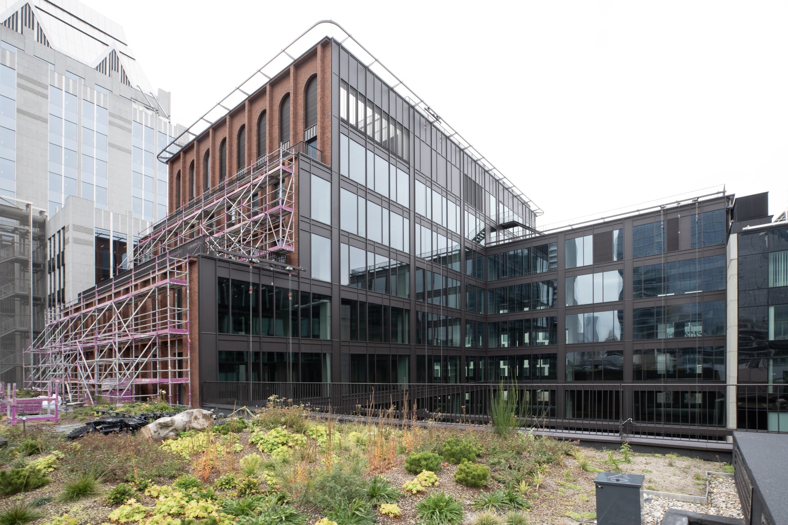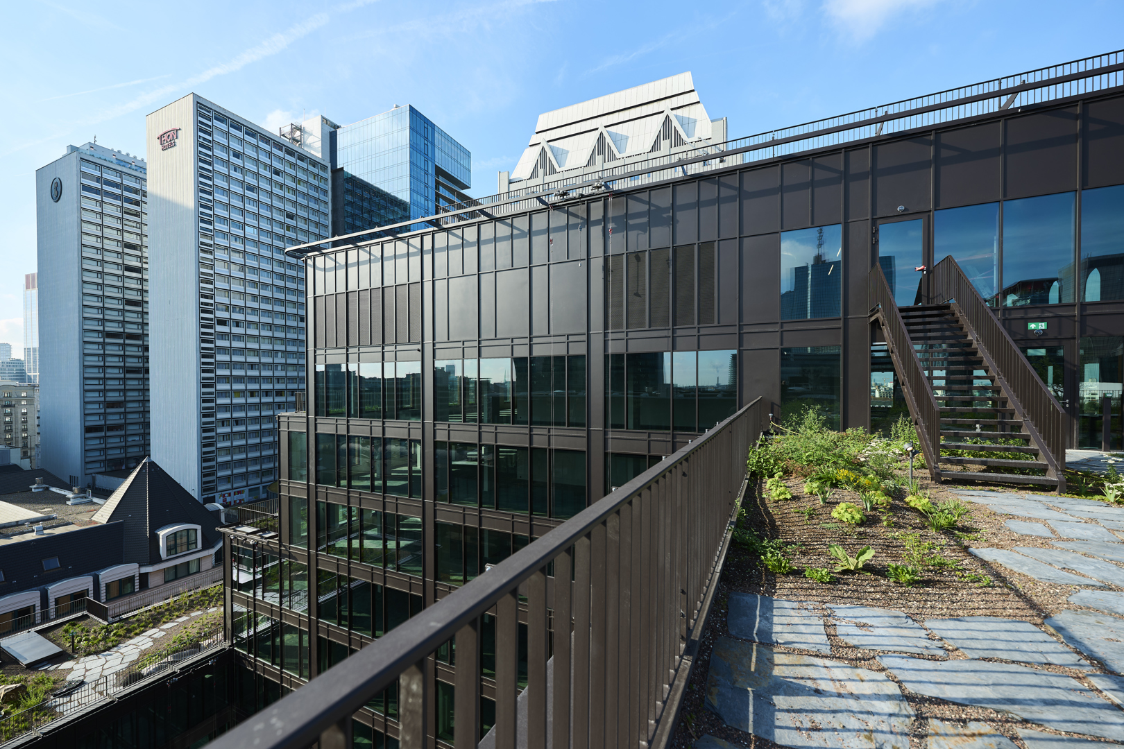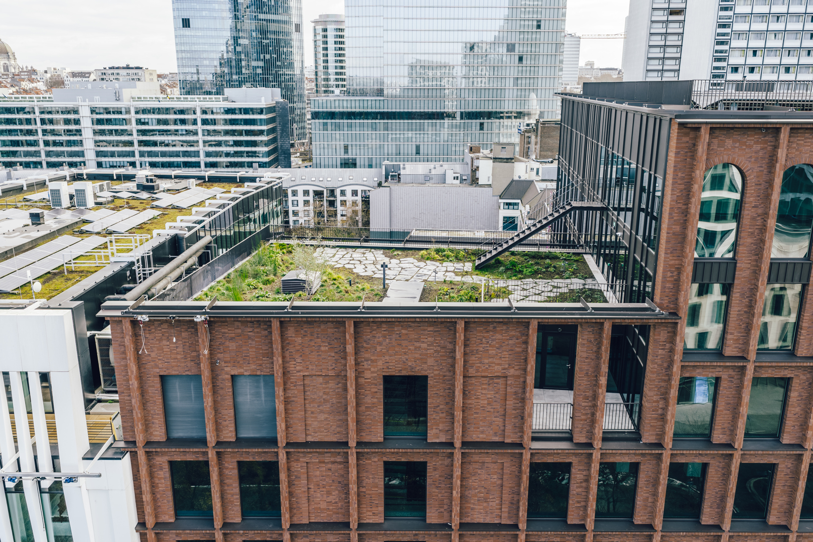 De grootste uitdaging van het project was het aanleggen van een tuin met uitsluitend inheemse planten op een kunstmatige, droge ondergrond met een beperkte substraatdikte, die bovendien aan strenge eisen moest voldoen: zonlicht, blootstelling aan wind en regen, brandveiligheidsnormen, enz. In de plantenkeuze is ook veel aandacht besteed aan honingdragende planten om de biodiversiteit te bevorderen en bestuivende insecten te voeden. Alle daktuinen zijn uitgerust met een intelligent en gecontroleerd waterreservoirsysteem met geïntegreerde irrigatiefunctie. Het doel is om een positieve waterbalans te bereiken, zoveel mogelijk water op te slaan en beschikbaar te stellen als nodig is voor de planten, maar ook voor verdamping en de koeling van de gebouwen.