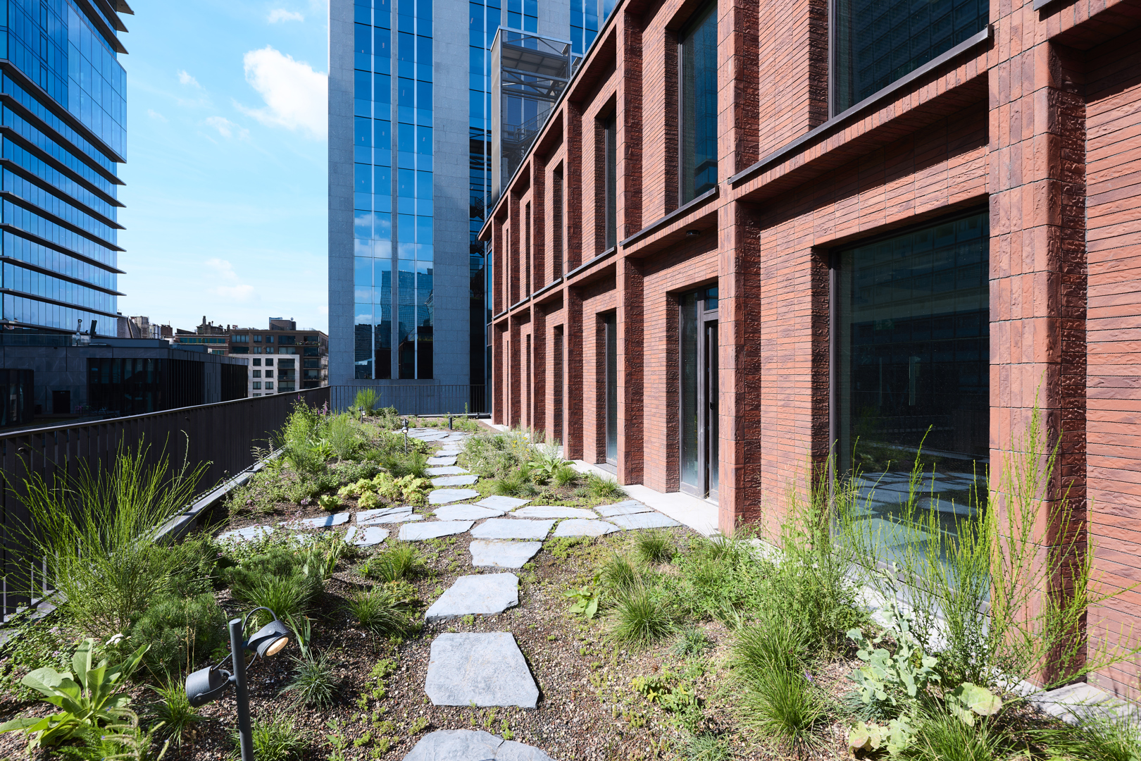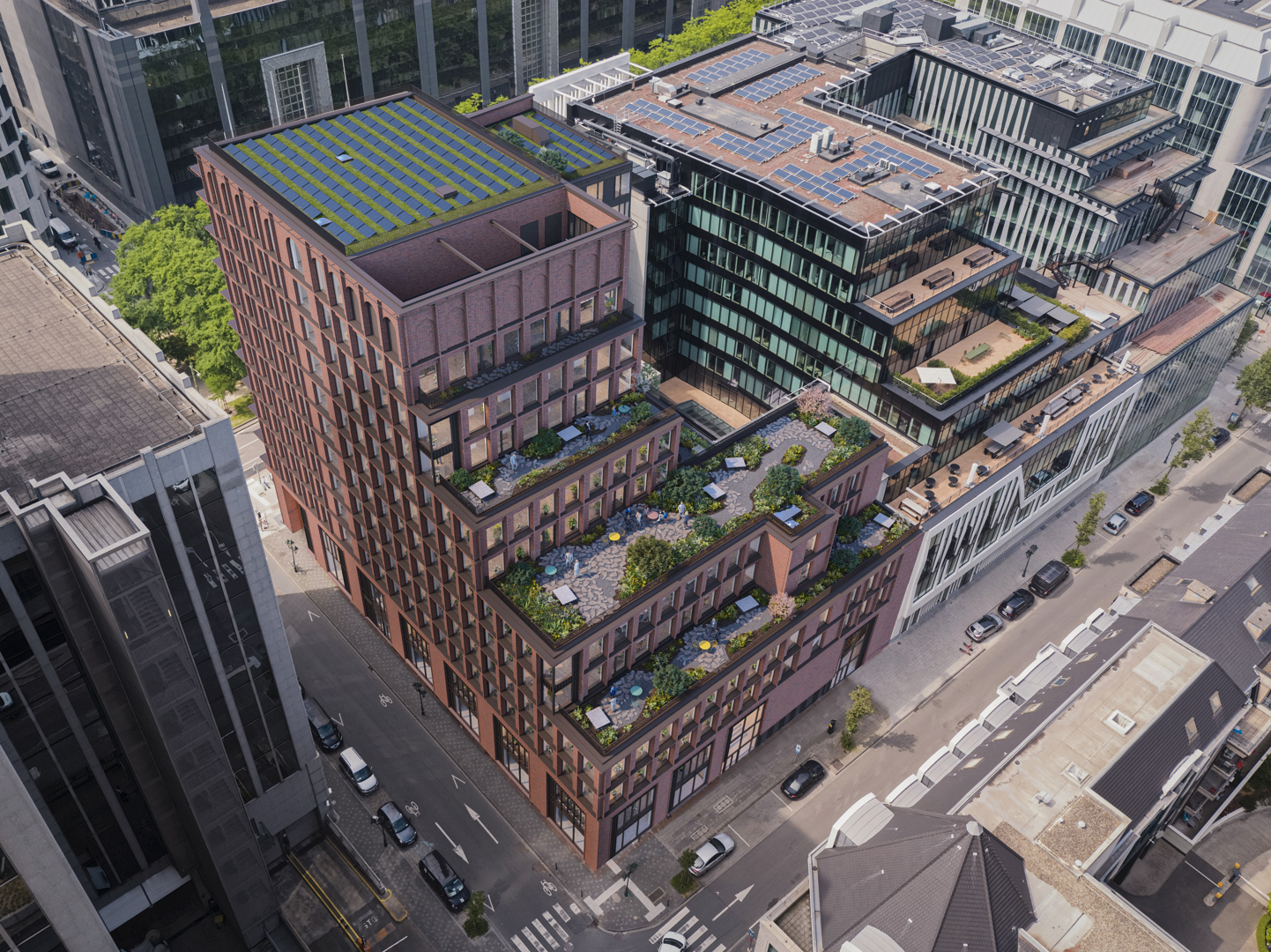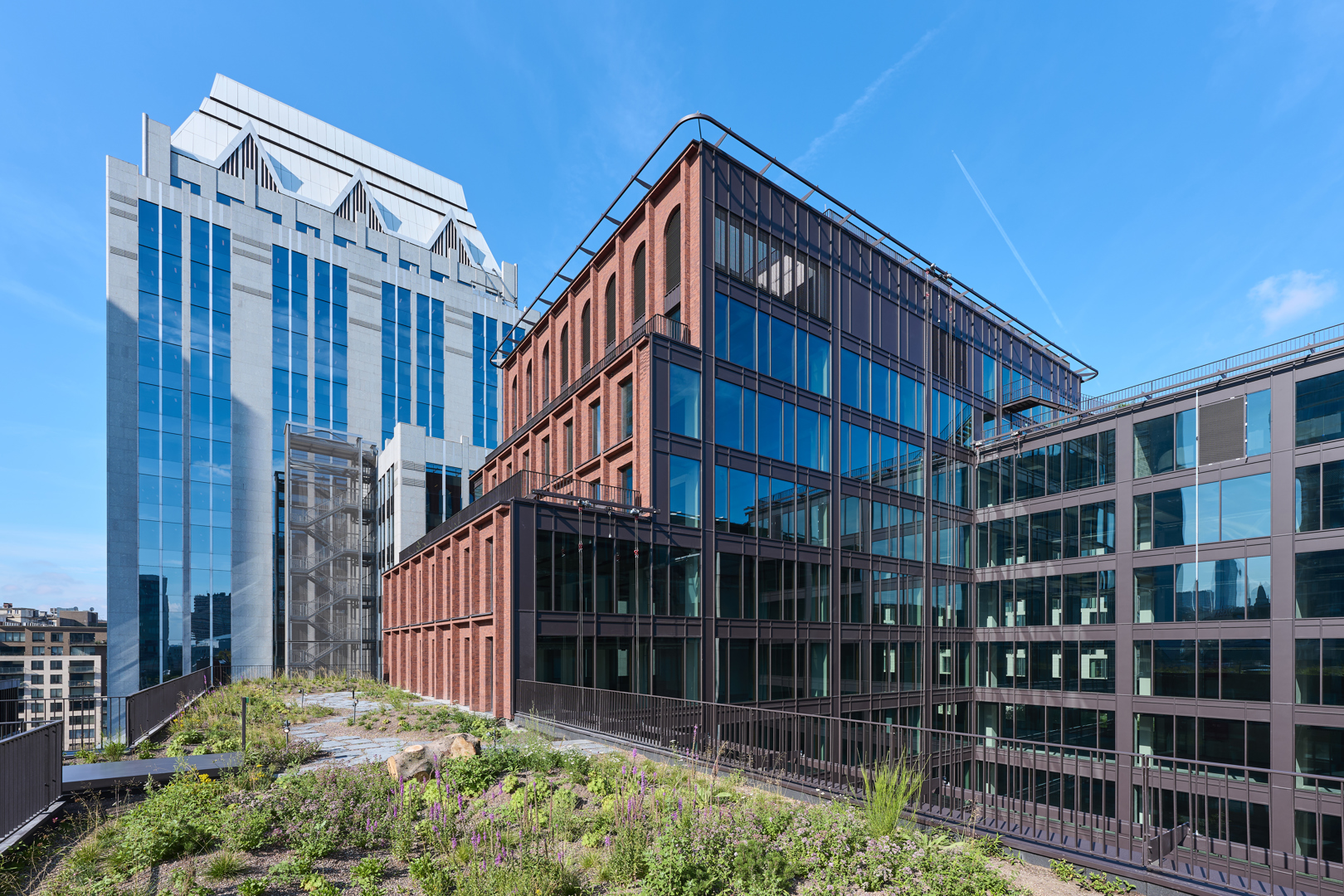 De grootste uitdaging van het project was het aanleggen van een tuin met uitsluitend inheemse planten op een kunstmatige, droge ondergrond met een beperkte substraatdikte, die bovendien aan strenge eisen moest voldoen: zonlicht, blootstelling aan wind en regen, brandveiligheidsnormen, enz. In de plantenkeuze is ook veel aandacht besteed aan honingdragende planten om de biodiversiteit te bevorderen en bestuivende insecten te voeden. Alle daktuinen zijn uitgerust met een intelligent en gecontroleerd waterreservoirsysteem met geïntegreerde irrigatiefunctie. Het doel is om een positieve waterbalans te bereiken, zoveel mogelijk water op te slaan en beschikbaar te stellen als nodig is voor de planten, maar ook voor verdamping en de koeling van de gebouwen.