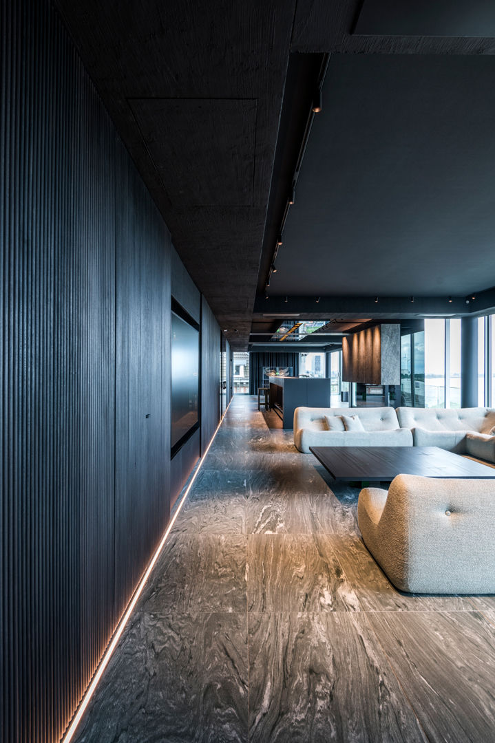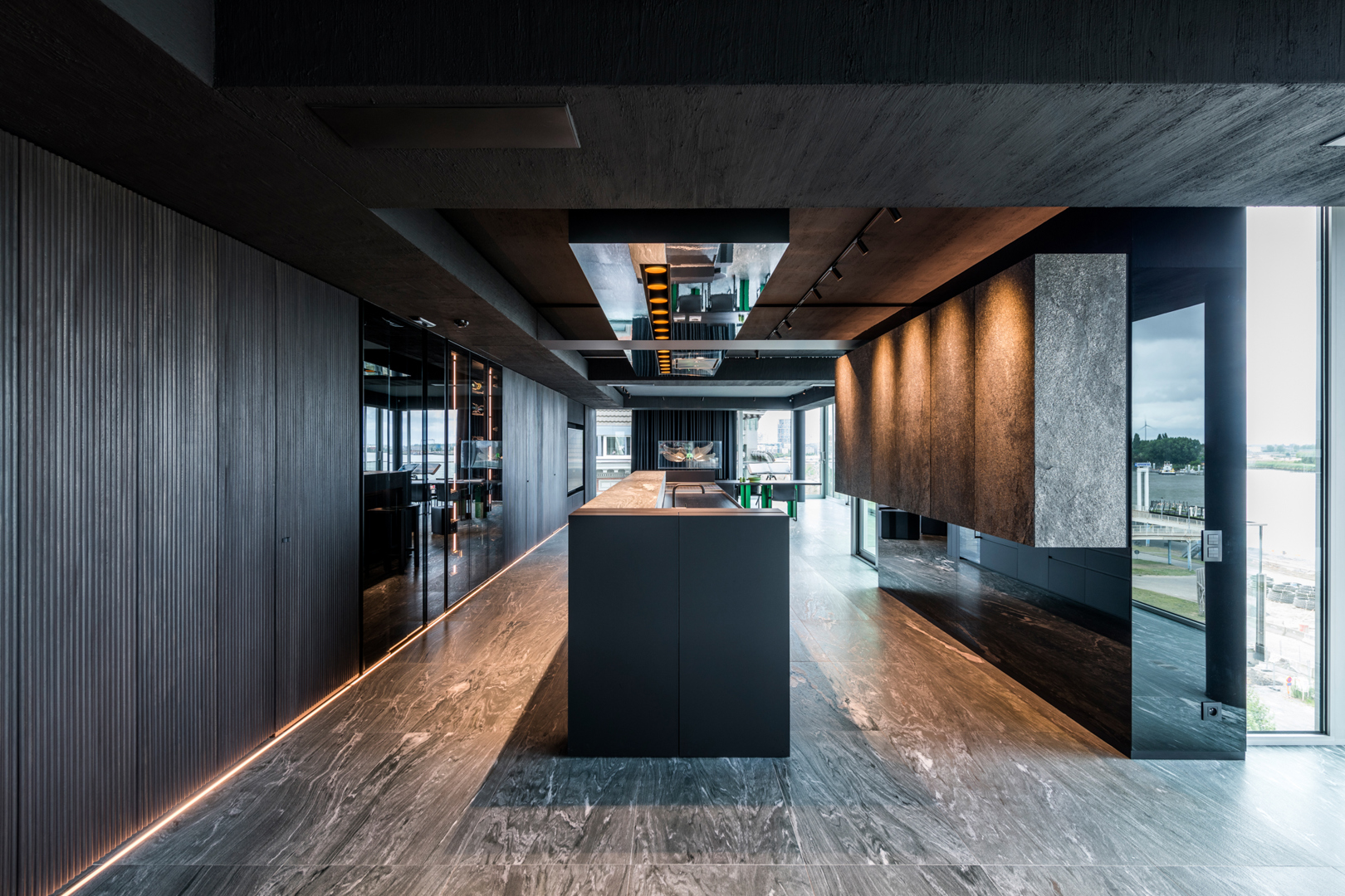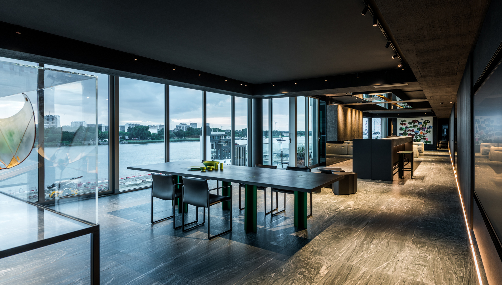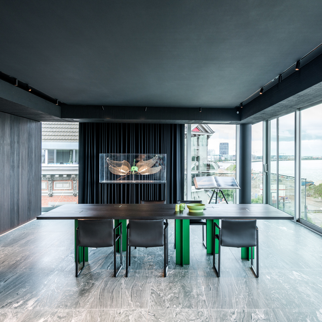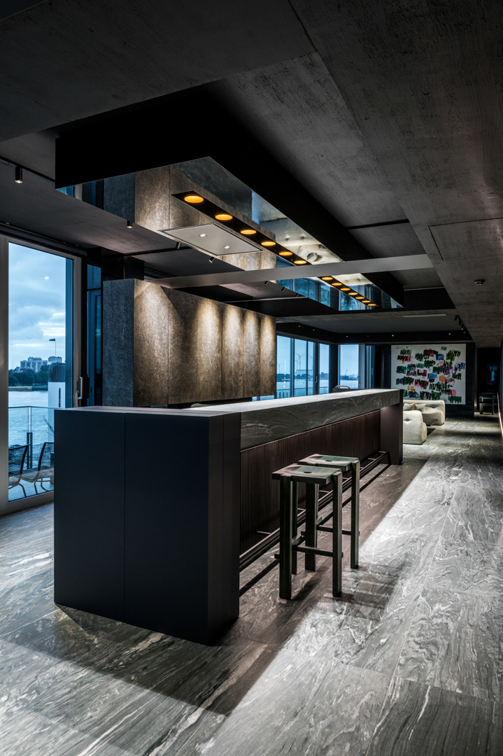 De ontwerpopdracht bestond uit het samenvoegen van twee appartementen tot één 32 meter lange loft met een panoramisch zicht op de Scheldekaaien. Binnen deze atypische ruimte werd gezocht naar een hedendaagse woonvorm waarin beleving, flow en functionaliteit centraal staan. De keuken werd opgevat als verbindend bar-element tussen leef- en eetruimte. Materialen en maatmeubilair verwijzen subtiel naar de rivier en versterken de ruimtelijke samenhang. Het doel was een coherent, krachtig interieur te creëren met een uitgesproken identiteit, afgestemd op de context van de vijfde verdieping.
