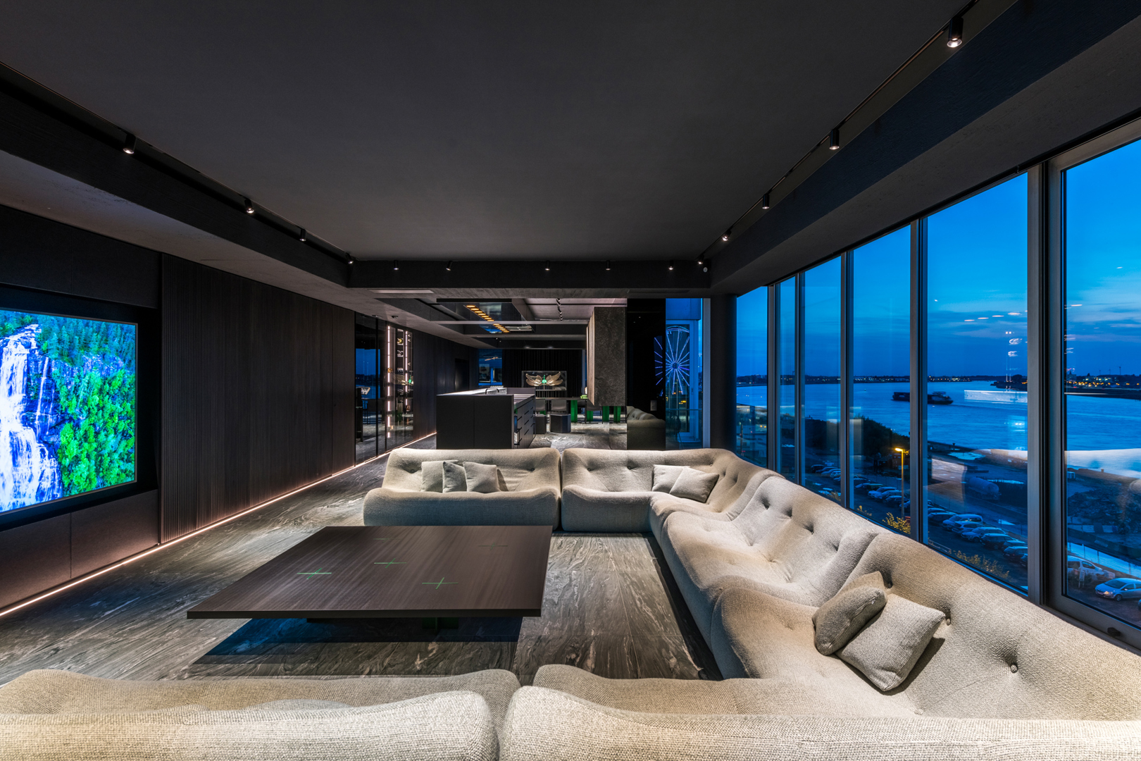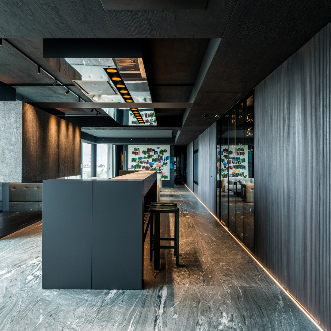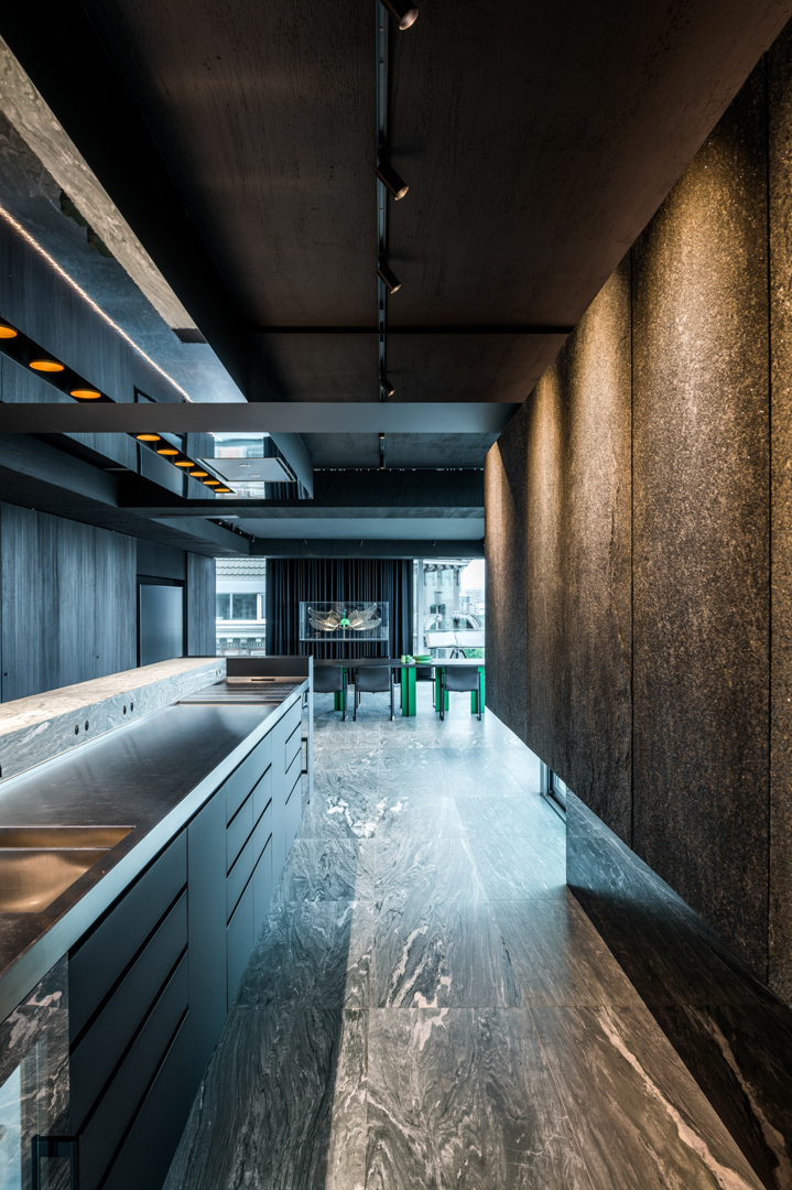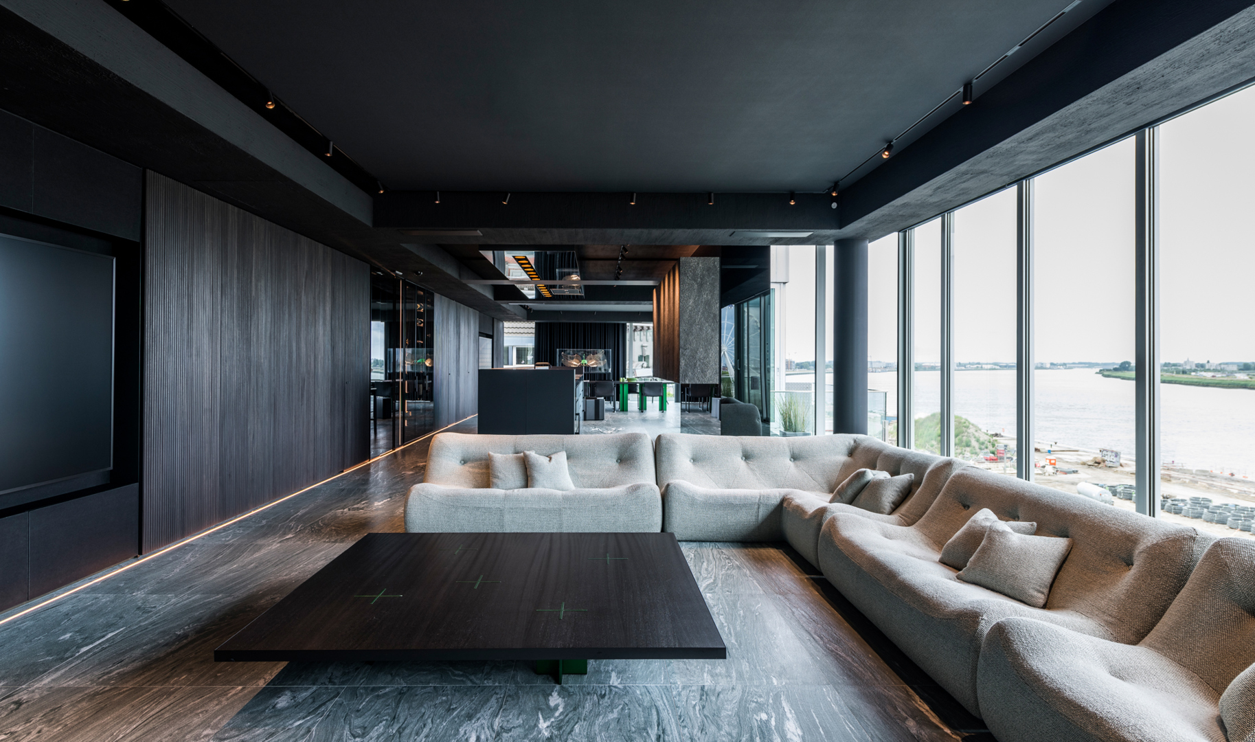 De ontwerpopdracht bestond uit het samenvoegen van twee appartementen tot één 32 meter lange loft met een panoramisch zicht op de Scheldekaaien. Binnen deze atypische ruimte werd gezocht naar een hedendaagse woonvorm waarin beleving, flow en functionaliteit centraal staan. De keuken werd opgevat als verbindend bar-element tussen leef- en eetruimte. Materialen en maatmeubilair verwijzen subtiel naar de rivier en versterken de ruimtelijke samenhang. Het doel was een coherent, krachtig interieur te creëren met een uitgesproken identiteit, afgestemd op de context van de vijfde verdieping.