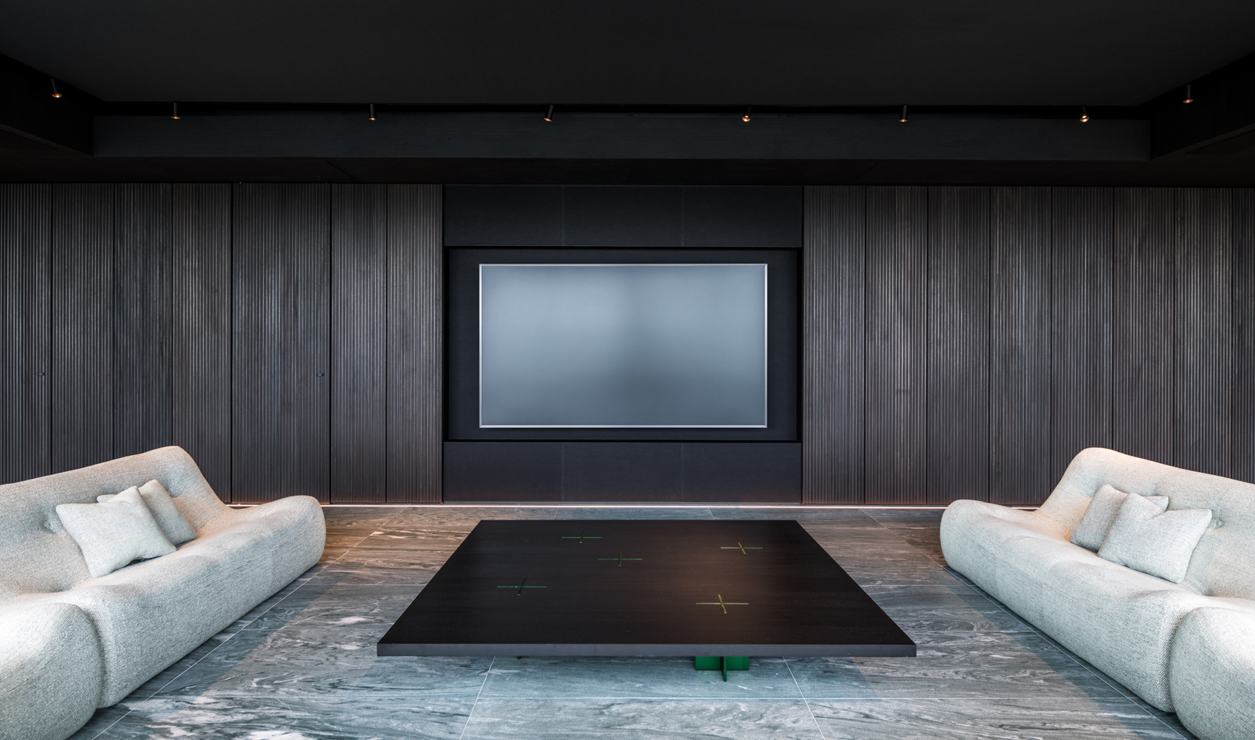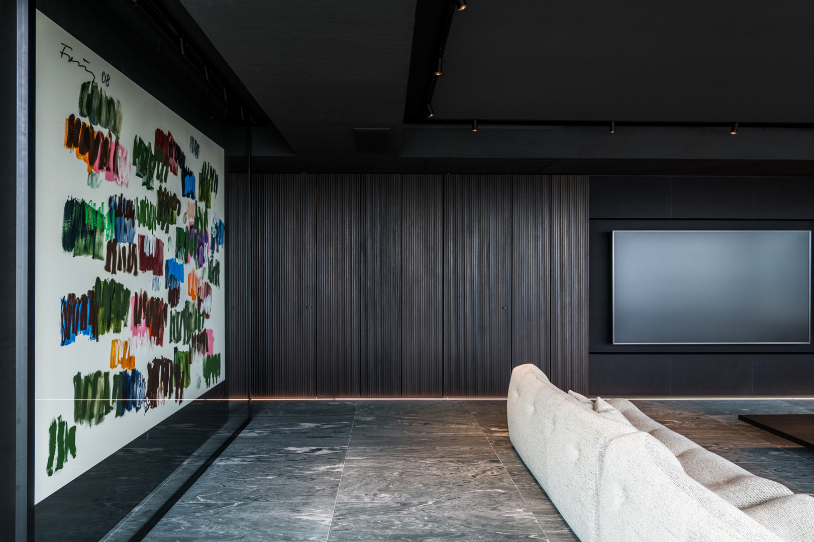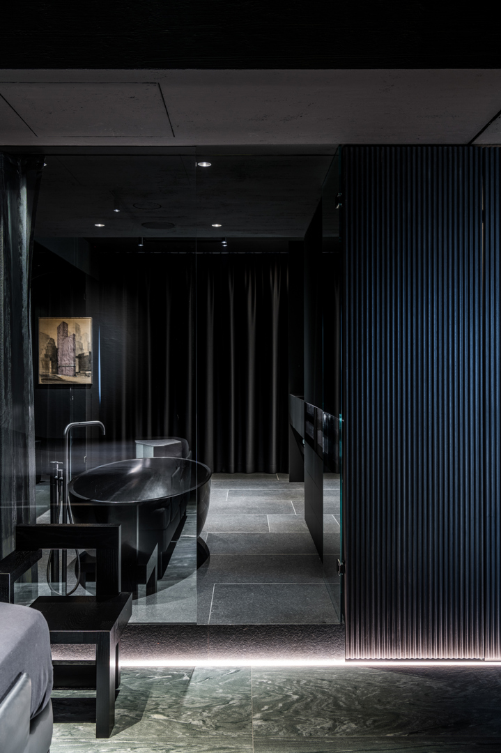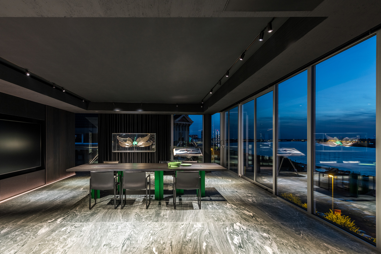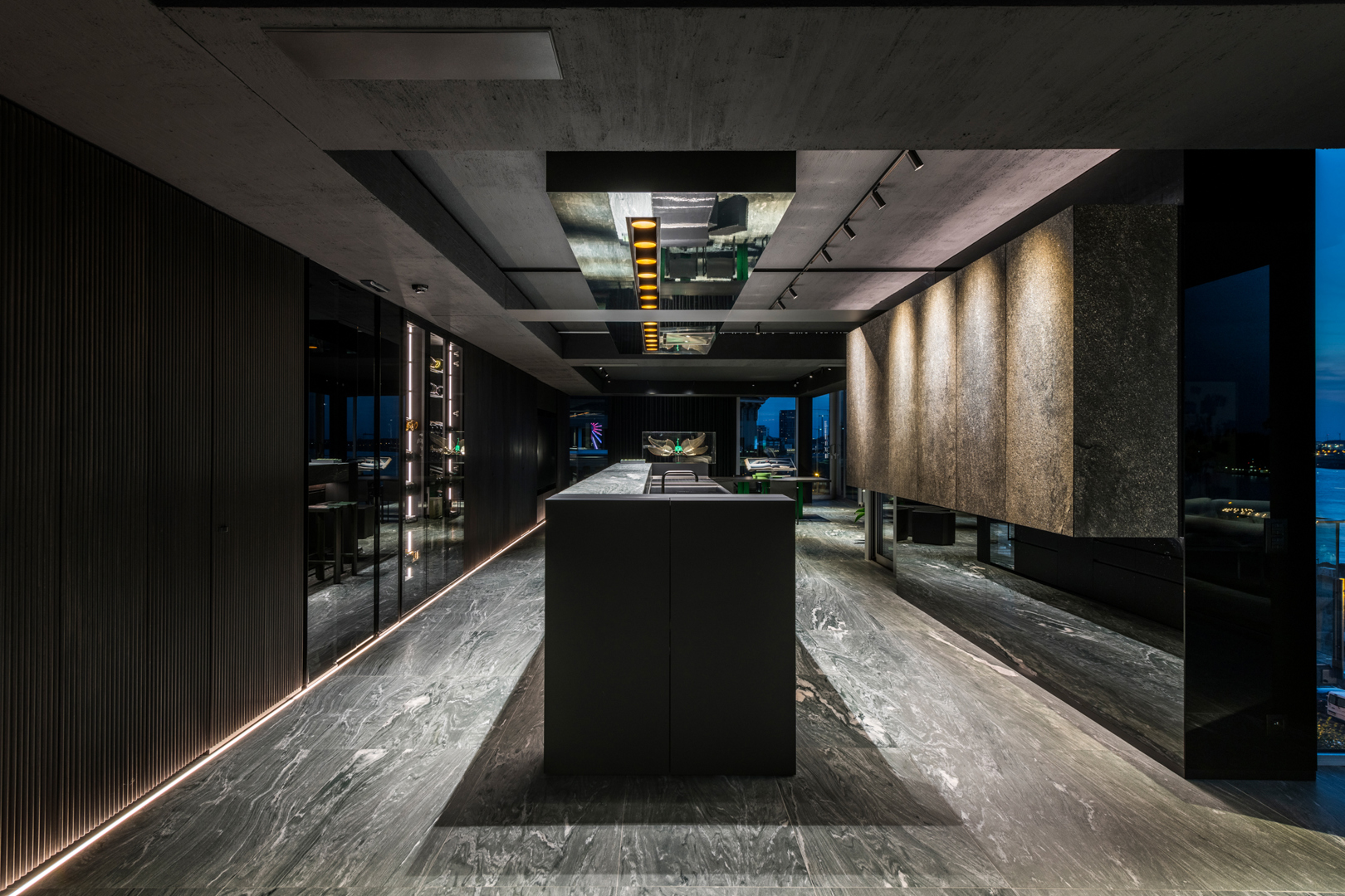De ontwerpopdracht bestond uit het samenvoegen van twee appartementen tot één 32 meter lange loft met een panoramisch zicht op de Scheldekaaien. Binnen deze atypische ruimte werd gezocht naar een hedendaagse woonvorm waarin beleving, flow en functionaliteit centraal staan. De keuken werd opgevat als verbindend bar-element tussen leef- en eetruimte. Materialen en maatmeubilair verwijzen subtiel naar de rivier en versterken de ruimtelijke samenhang. Het doel was een coherent, krachtig interieur te creëren met een uitgesproken identiteit, afgestemd op de context van de vijfde verdieping.