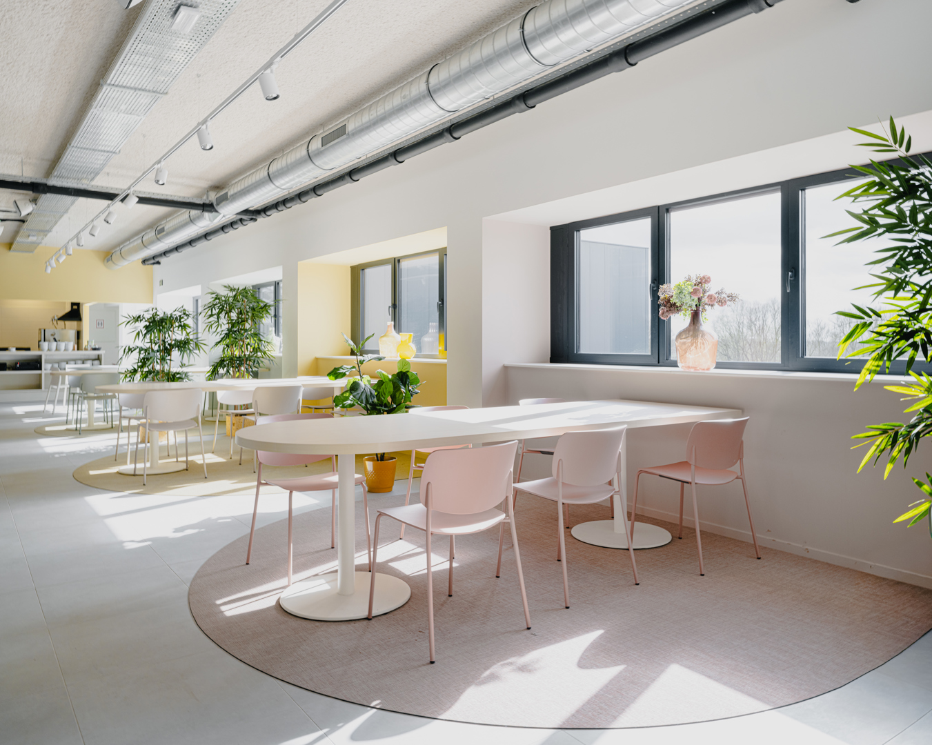 Het project zet sterk in op hergebruik en optimalisatie van bestaande structuren. Door een deel van het distributiecentrum te herbestemmen tot kantooromgeving werd nieuwbouw vermeden en de impact op embodied carbon beperkt. De ingrepen blijven doelgericht en minimaal, met maximale benutting van bestaande volumes en daglichttoetreding via dakkoepels en raamopeningen. Daarnaast draagt de clustering van alle medewerkers op één site bij aan efficiënter ruimtegebruik en versterkte interne werking. De duurzame waarde zit ook in de lange termijn: een flexibele, toekomstgerichte werkomgeving die meegroeit met de organisatie.