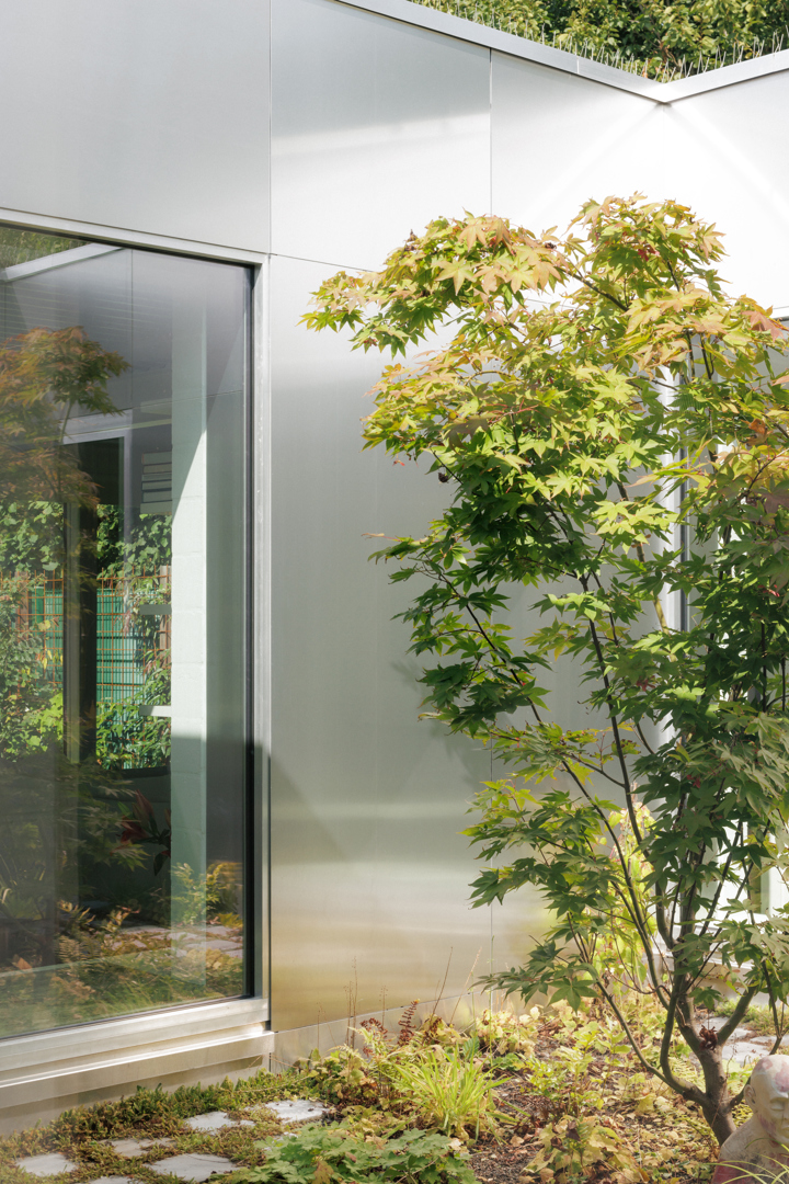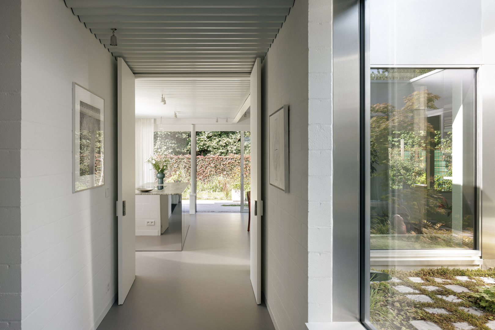 De magazijnwoning heeft maar twee volwaardige gevels waardoor drie kamers en de centrale circulatie amper licht en zicht hebben. We stellen drie interventies. Ten eerste een patio die licht in het hart van de woning binnen brengt. Via lange zichten doorheen andere kamers ontstaan nieuwe zichten. Ten tweede laten we drie raamopeningen samenvloeien tot een lang raam over de volledige breedte van de leefruimte. De grens tussen binnen en buiten vervaagt, met voldoende privacy ten opzichte van de woning vooraan het perceel. Ten derde vervangen we in drie raamopeningen het witte pvc-schrijnwerk door bruut aluminium met bovenaan een slank luifeltje. De bestaande gevelsteen komt hierdoor beter tot zijn recht, de luifels doorbreken de vlakheid van de gevel en begroeten gasten aan de voordeur.
