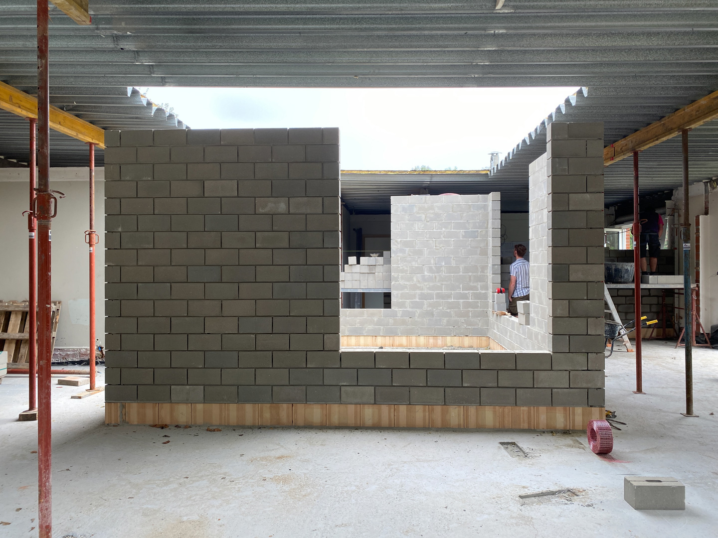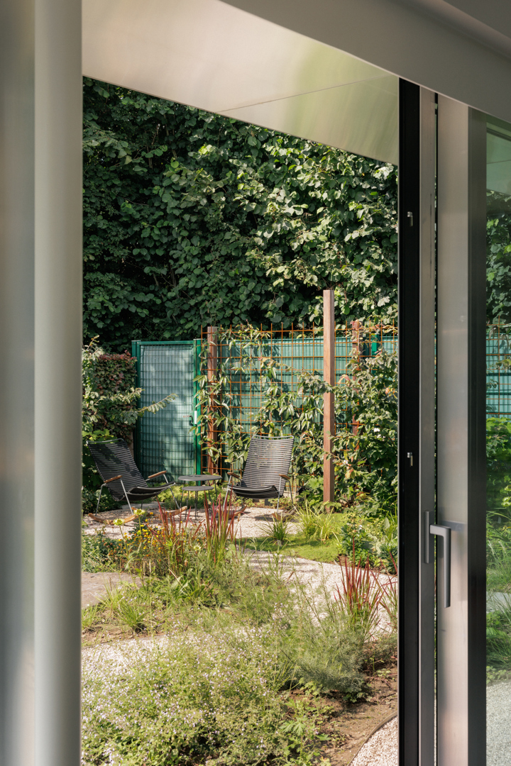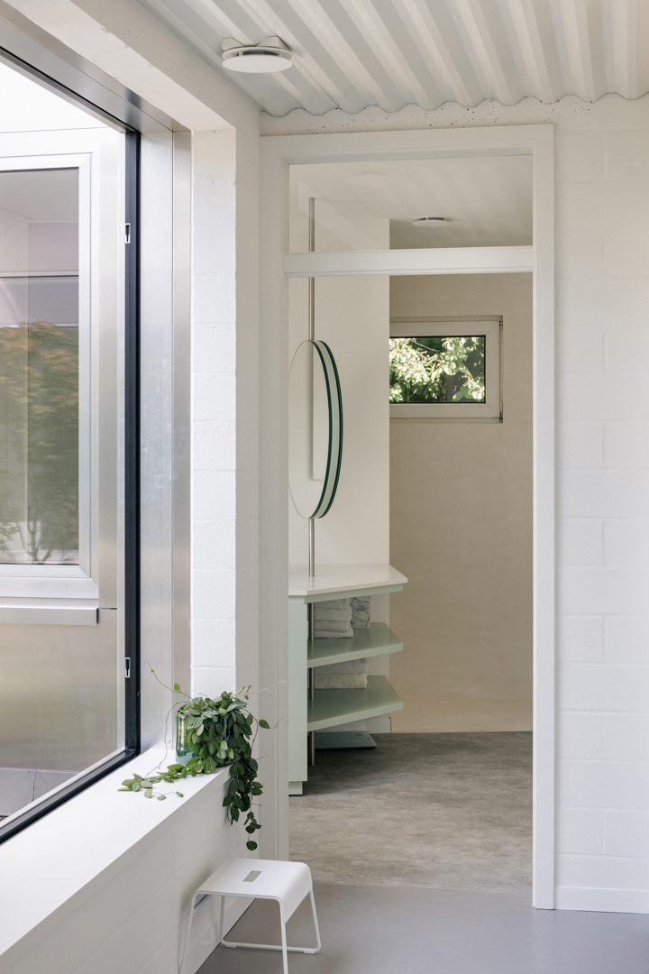 Onze ambitie was om zo veel mogelijk bestaande elementen te bewaren in het project en daarbij toch fundamenteel grotere ruimtelijke kwaliteiten te realiseren. Het metselwerk van de gevel lieten we onaangeroerd. De stalen dakplaat werd behouden en lokaal uitgesneden om de patio te realiseren. De nieuwe kolommen en wanden landen volledig boven op de bestaande betonnen funderingssleuven zodat deze konden behouden worden. De rolluik kasten boven de ramen worden verwijderd om de luchtdichtheid te verbeteren en ramen op te hogen. Houten binnendeuren met bovenlichten worden gerecupereerd en in het nieuwe interieur herplaatst. Een nieuwe golvende staalplaat als plafond afwerking is een herinnering aan het voormalige magazijn zodat ook de geest van de plek niet verloren gaat in het nieuwe ontwerp.