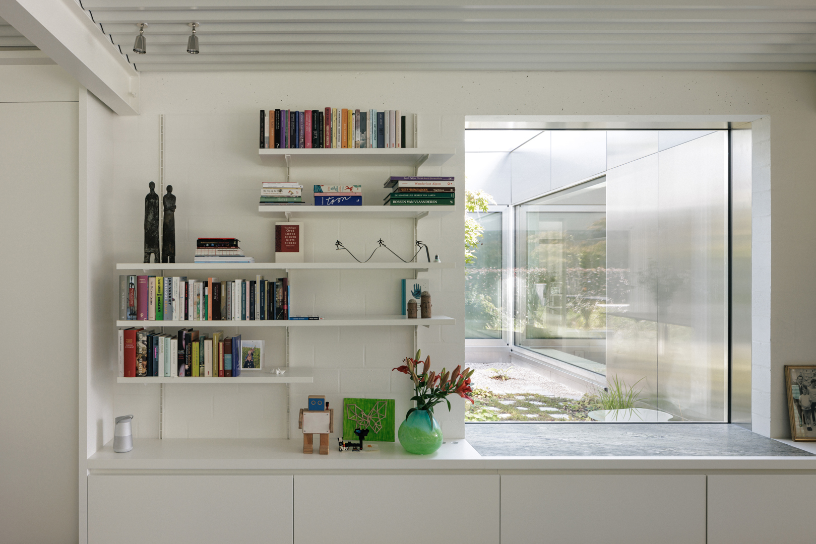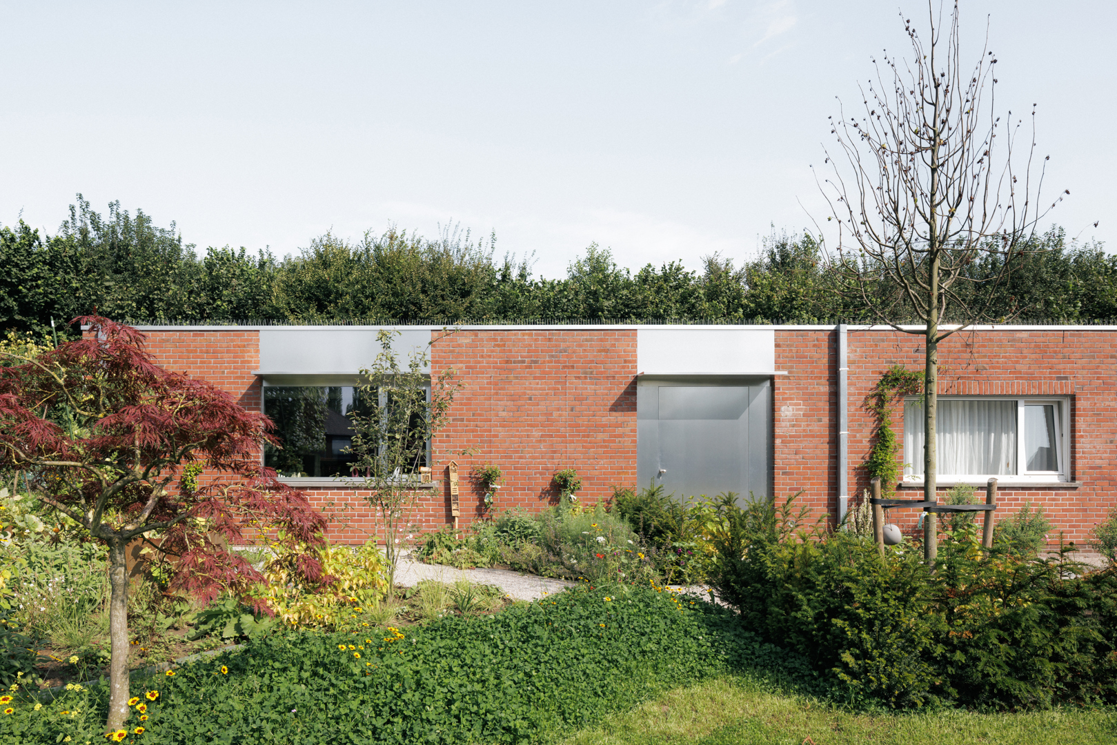 Een echtpaar zeventigplussers wenst een in onbruik geraakte magazijnwoning achteraan het perceel waar hun zoon, schoondochter en kleinkinderen wonen te verbouwen. Ze geven daarvoor een vrijstaande fermette op te midden een royale tuin en vragen ons om de donkere ruimtes te transformeren tot een lichtrijk interieur omringd met een bloeiende tuin. De ruime collectie aan kunst, boeken en design die ze doorheen de jaren hebben verzameld wordt het focuspunt van de woonervaring. De anonimiteit van de bestaande gevel moet voor hen veek meer een gevoel van ‘thuis’ uitstralen. Een plek waar ze met z’n twee rust vinden en met trots gasten ontvangen. De oude woning moet ook energetisch aangepakt: oververhitting beperken en beter isoleren zodat er met een warmtepomp kan worden verwarmd.