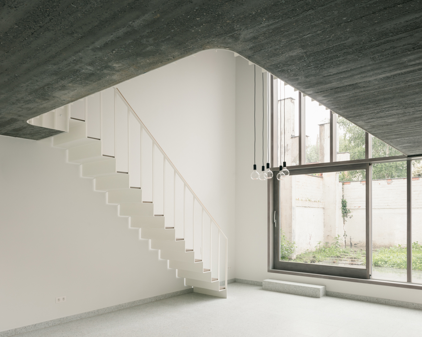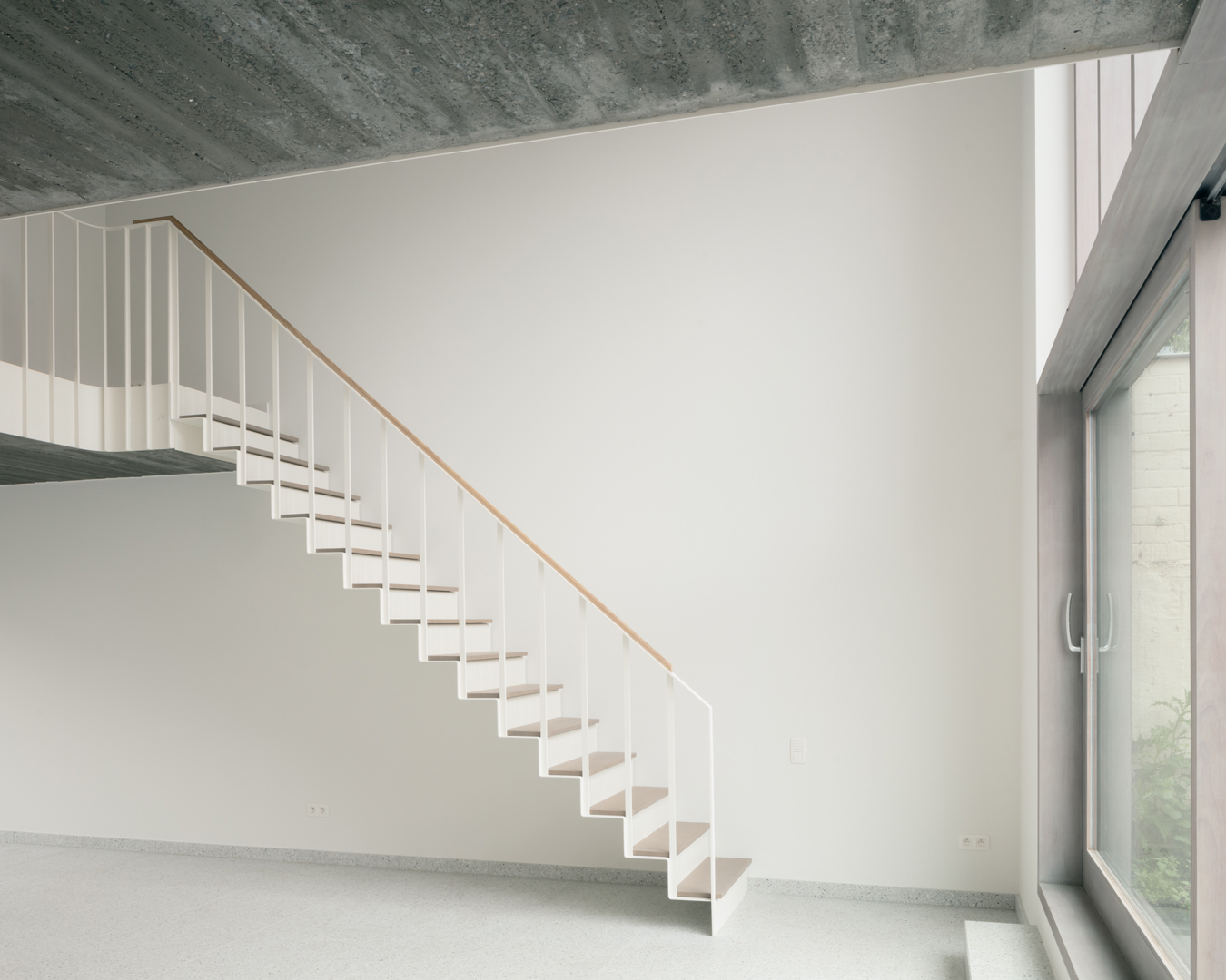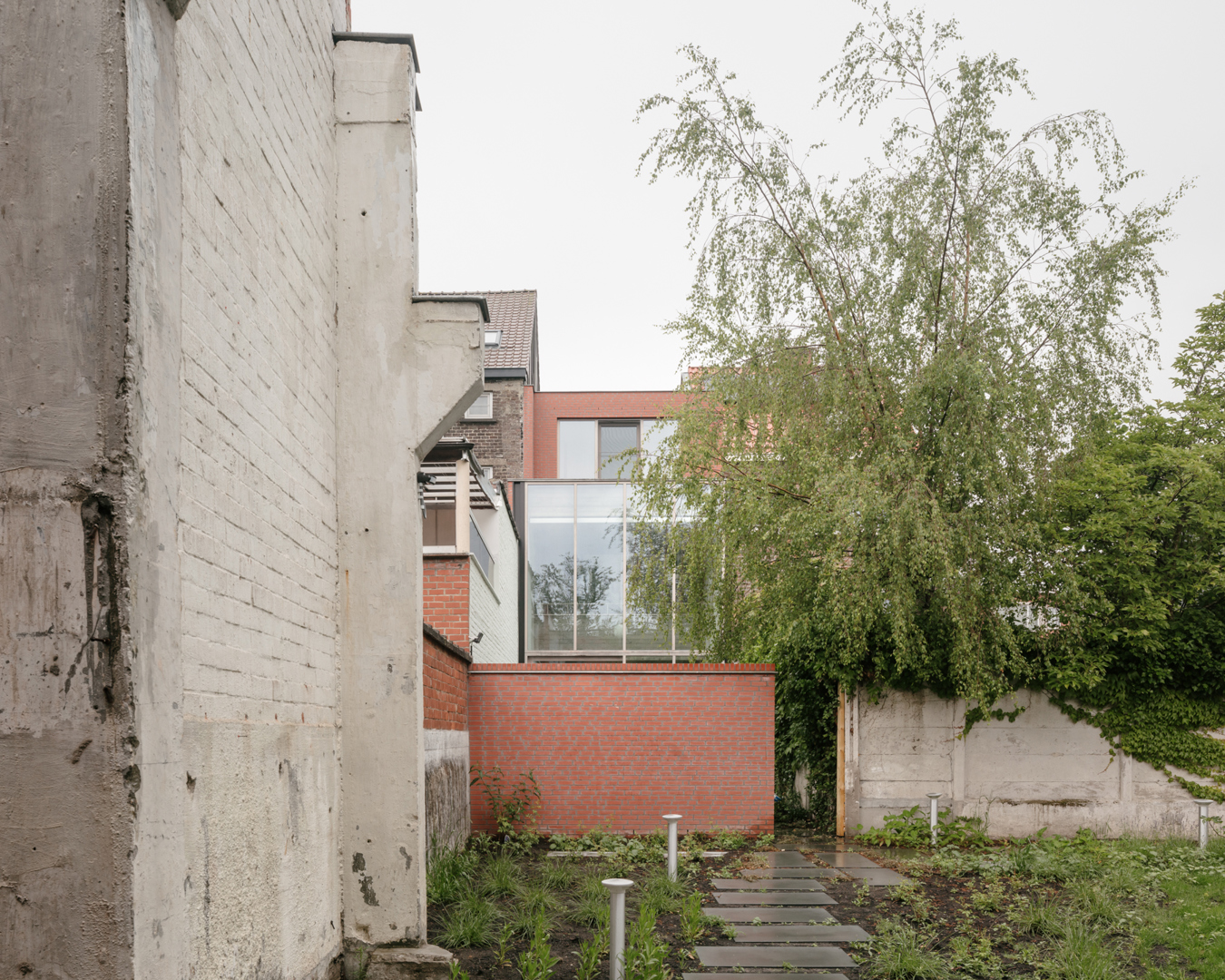 Op een site waar vroeger een betoncentrale was, ontwikkelen zich 3 betaalbare huurwoningen rond een gemeenschappelijke binnentuin. Het is een herbestemmings- en inbreidingsproject in een dichtbevolkte stadswijk. De wooneenheden verweven zich in de stedelijke structuur. Ze nestelen zich tussen de oude industriële sporen. Het binnengbied wordt maximaal onthard. De groenzone geeft een nieuwe dimensie aan het bouwblok. De tuin is een aaneenschakeling van private, semi-private en publieke groenzones. De gemeenschappelijke binnentuin wordt voortuin van de 2 woningen. Deze voortuin wordt ‘gebakend’ door het oude spant van de loods én verwelkomt de bewoners. In de woning is een doorsteek van de voortuin naar de private achtertuin. Via de vide vangt de woning de ganse dag natuurlijk licht.