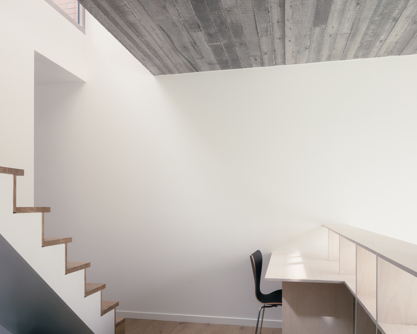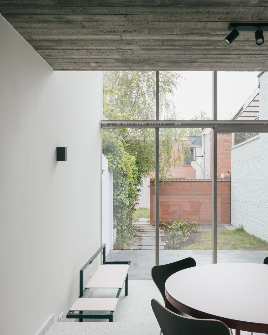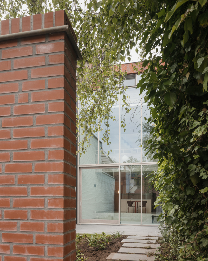 Op een site waar vroeger een betoncentrale was, ontwikkelen zich 3 betaalbare huurwoningen rond een gemeenschappelijke binnentuin. Het is een herbestemmings- en inbreidingsproject in een dichtbevolkte stadswijk. De wooneenheden verweven zich in de stedelijke structuur. Ze nestelen zich tussen de oude industriële sporen. Het binnengbied wordt maximaal onthard. De groenzone geeft een nieuwe dimensie aan het bouwblok. De tuin is een aaneenschakeling van private, semi-private en publieke groenzones. De gemeenschappelijke binnentuin wordt voortuin van de 2 woningen. Deze voortuin wordt ‘gebakend’ door het oude spant van de loods én verwelkomt de bewoners. In de woning is een doorsteek van de voortuin naar de private achtertuin. Via de vide vangt de woning de ganse dag natuurlijk licht.